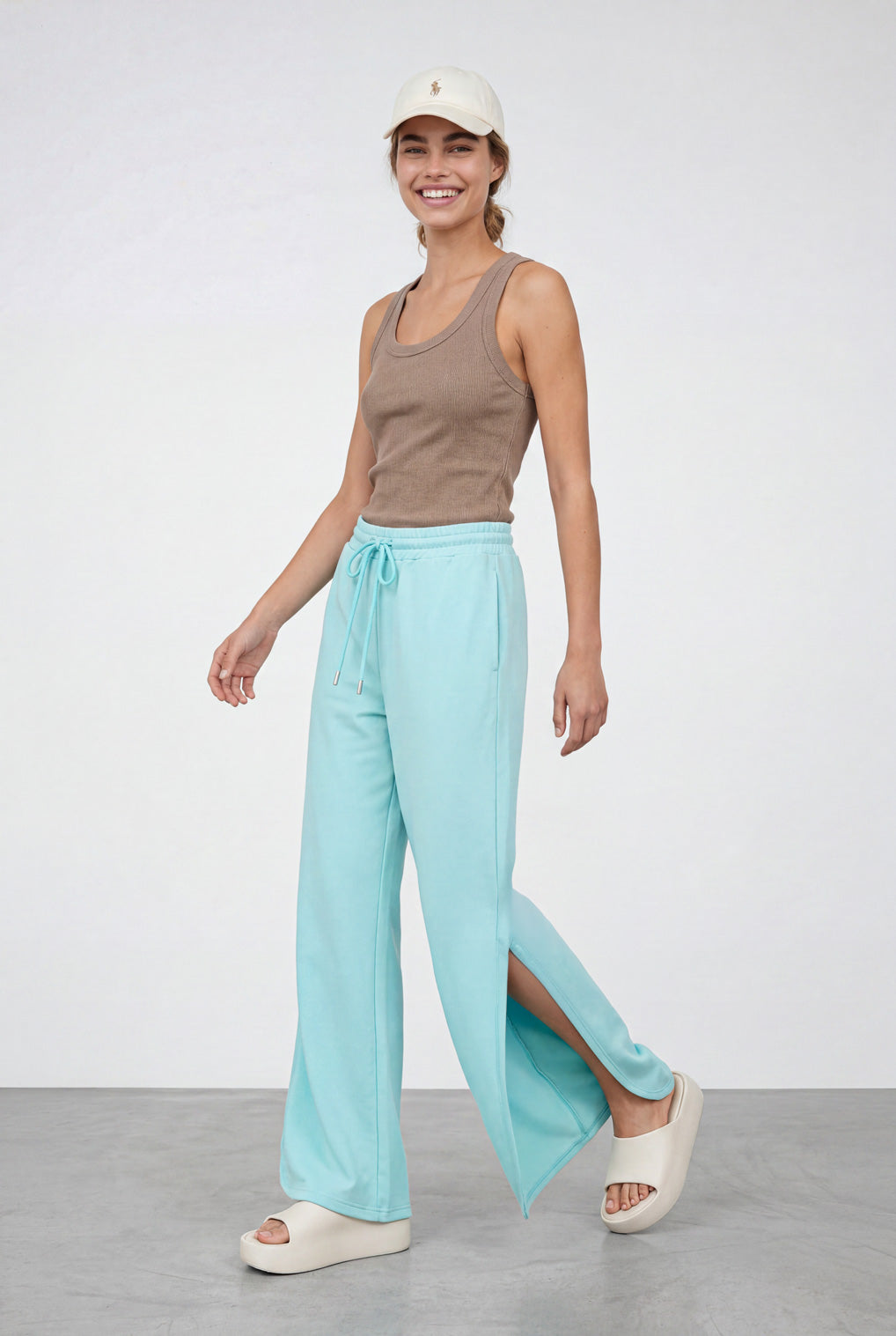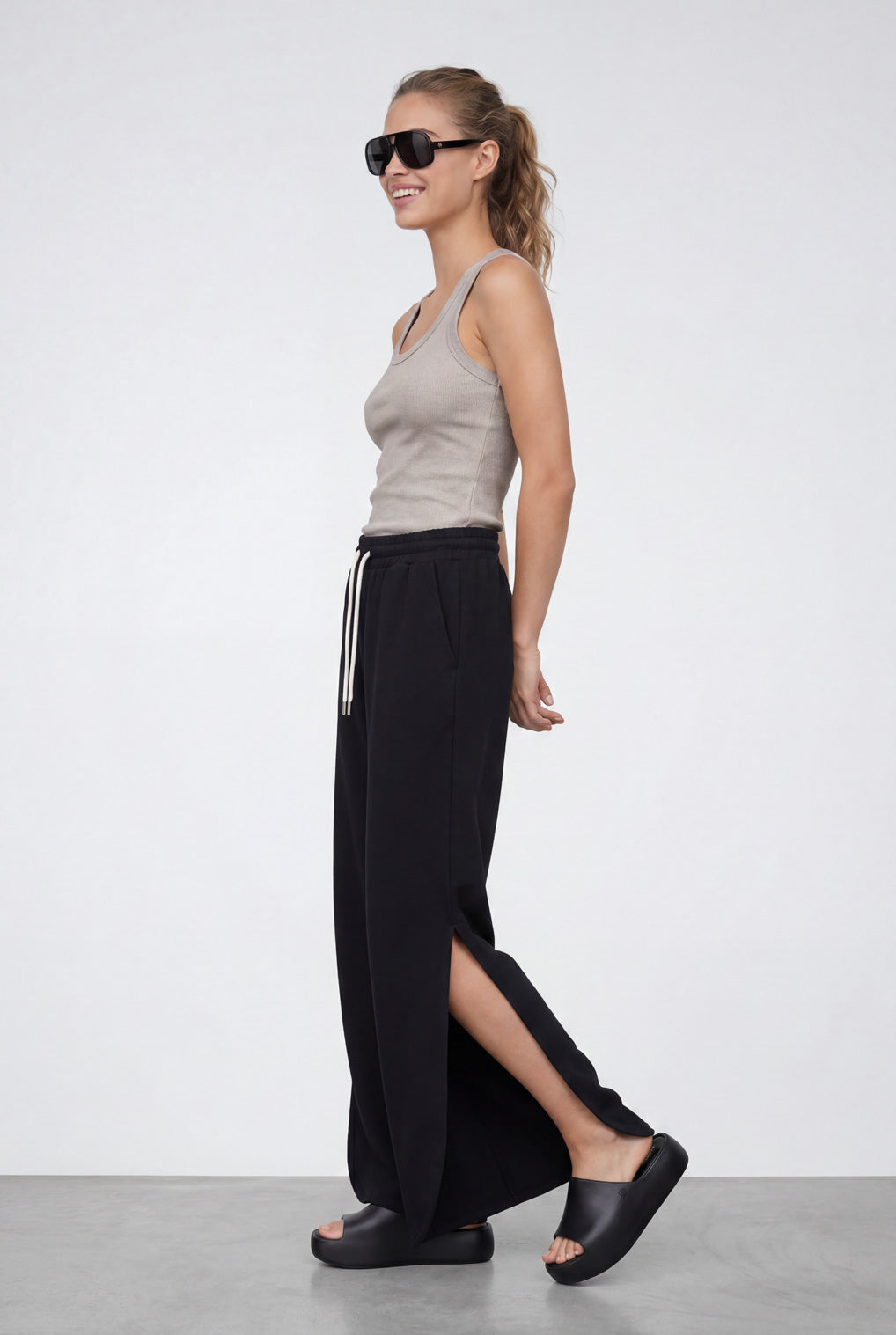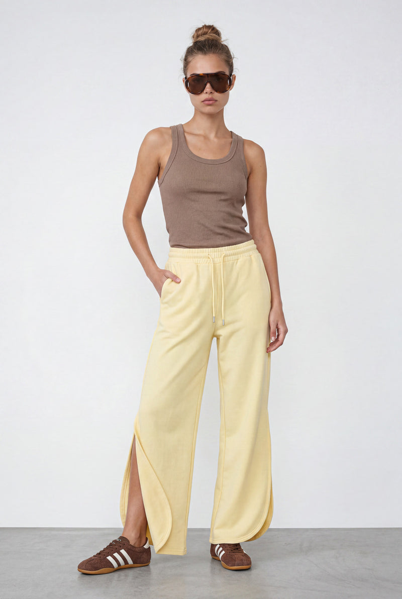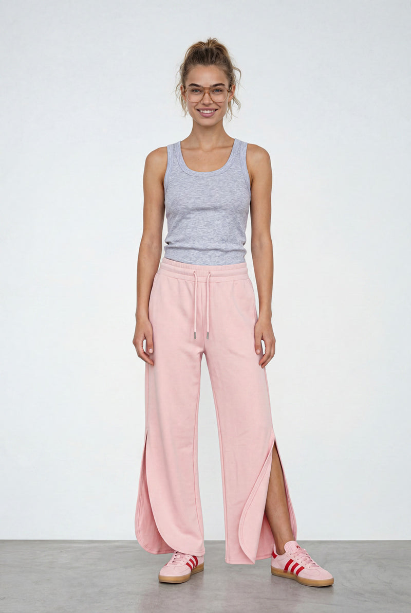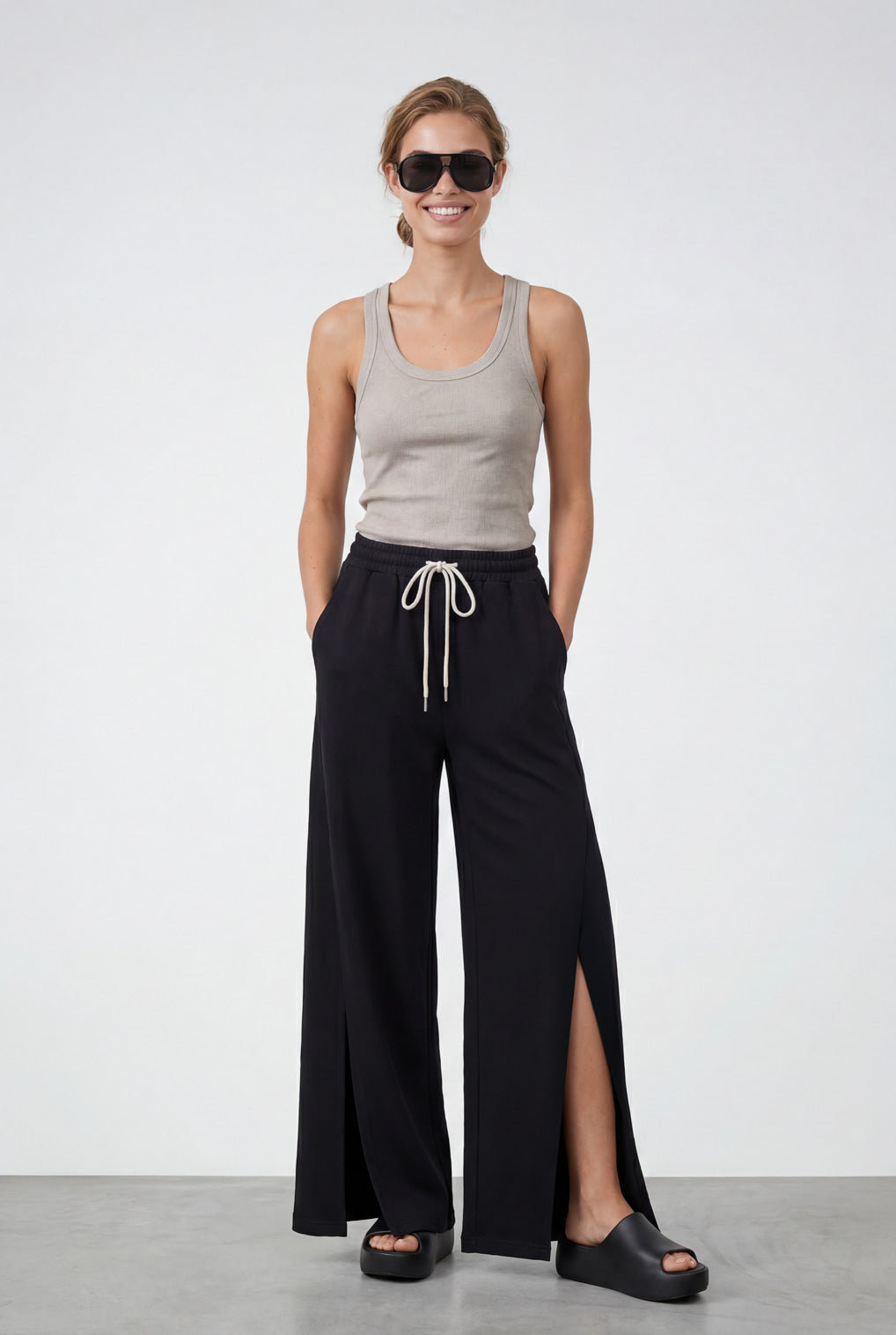 מכנסיים מבד כותנה בגזרת בלון עם שסע צידי,כיסים,גומי במותן ושרוך קשירה.