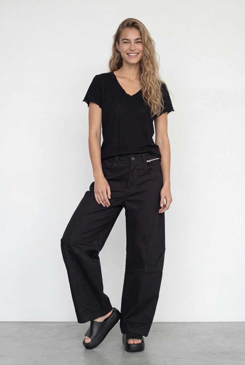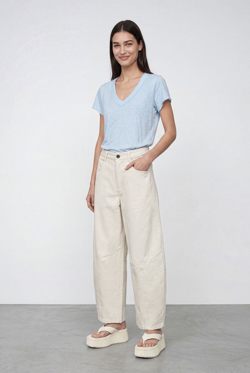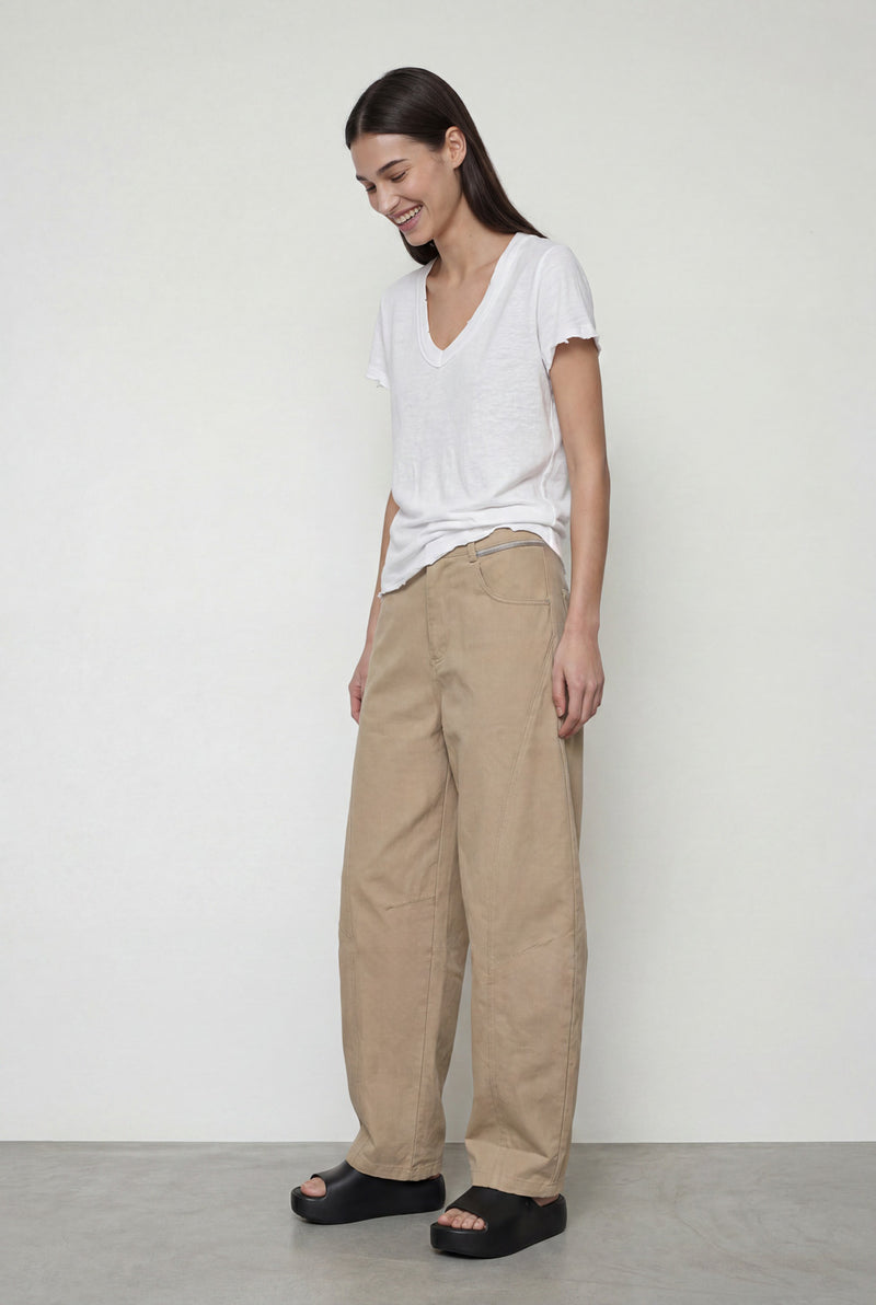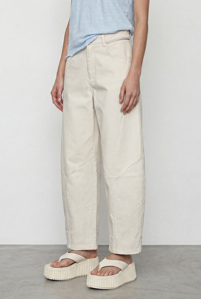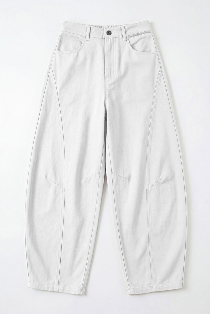 מכנסי דריל בגזרת בלון עם כיסים צידיים,רוכסן וכפתור קדמי.
