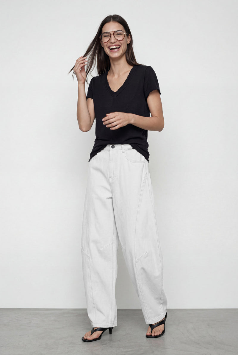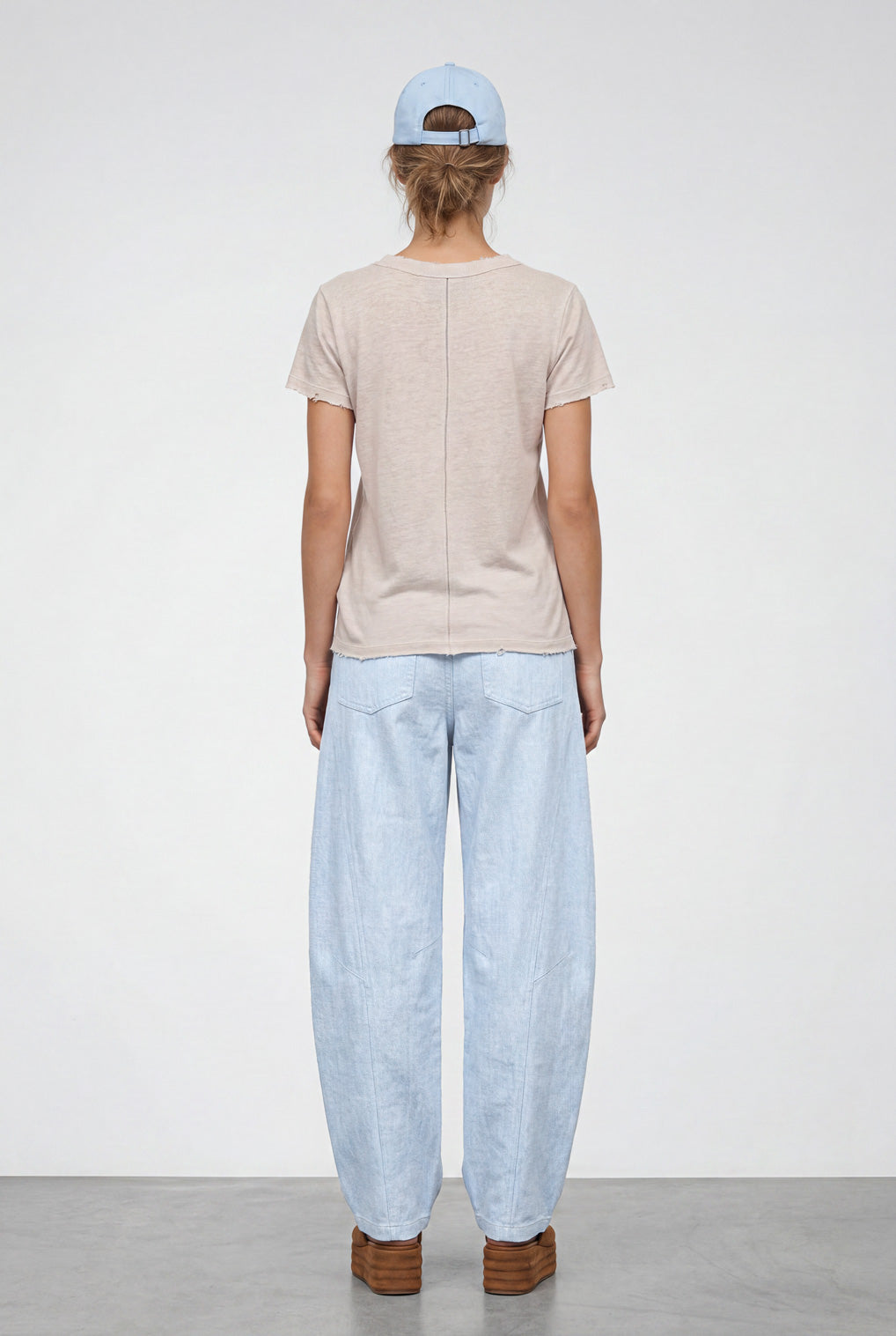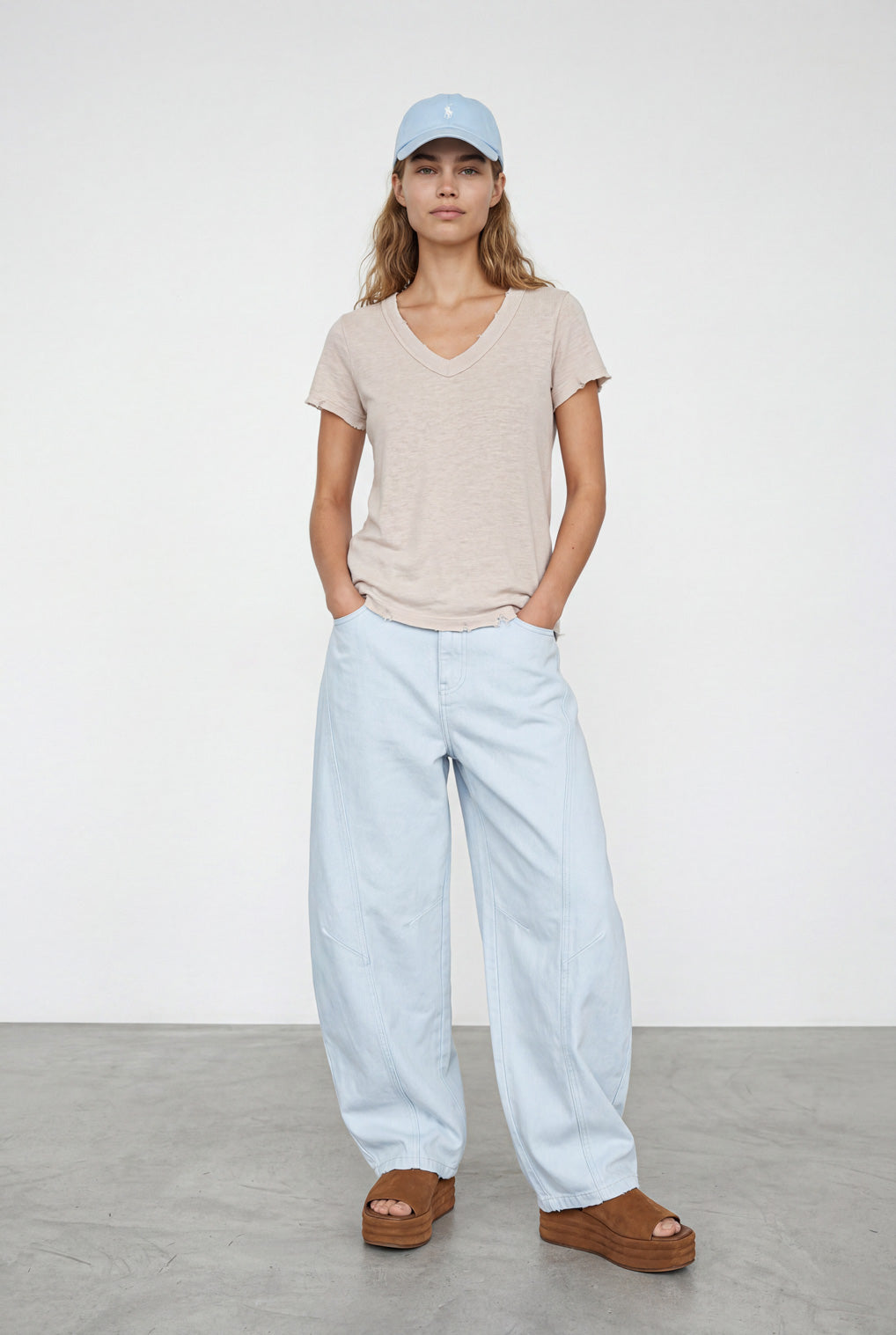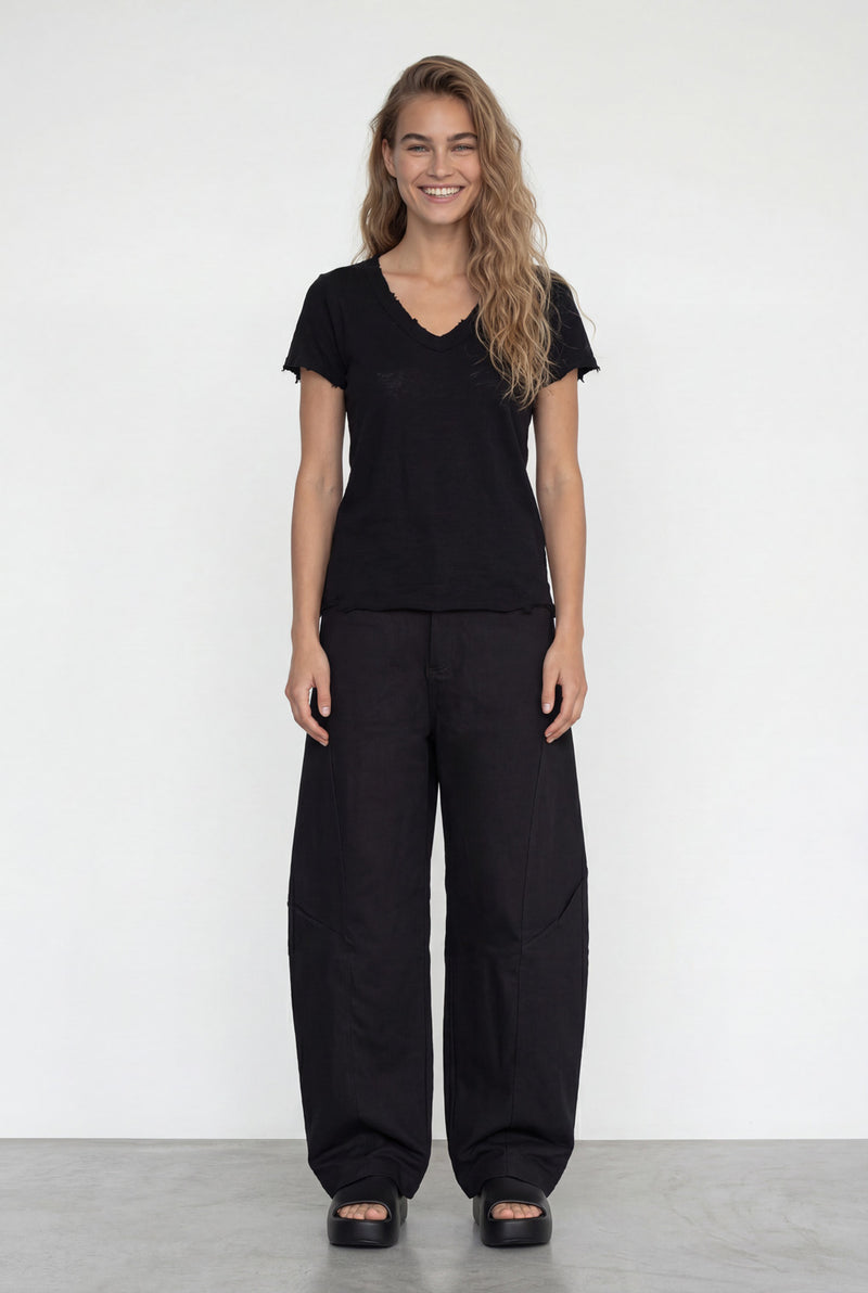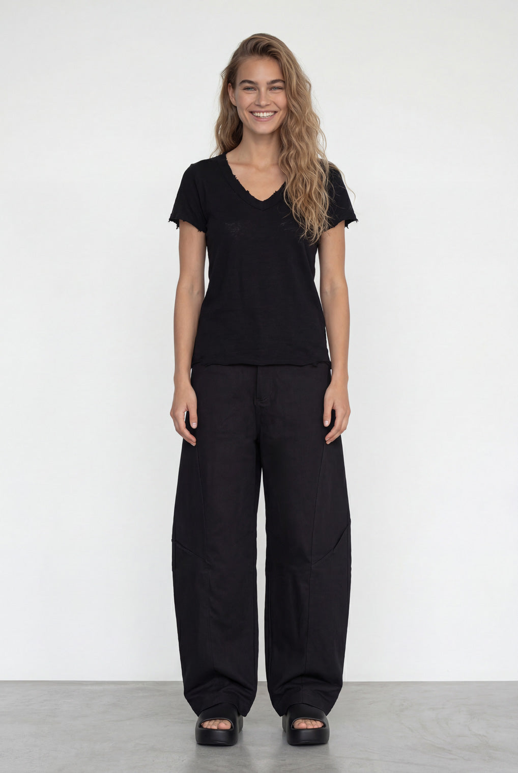 מכנסי דריל בגזרת בלון עם כיסים צידיים,רוכסן וכפתור קדמי.