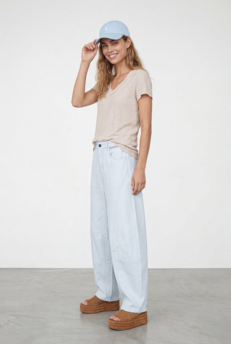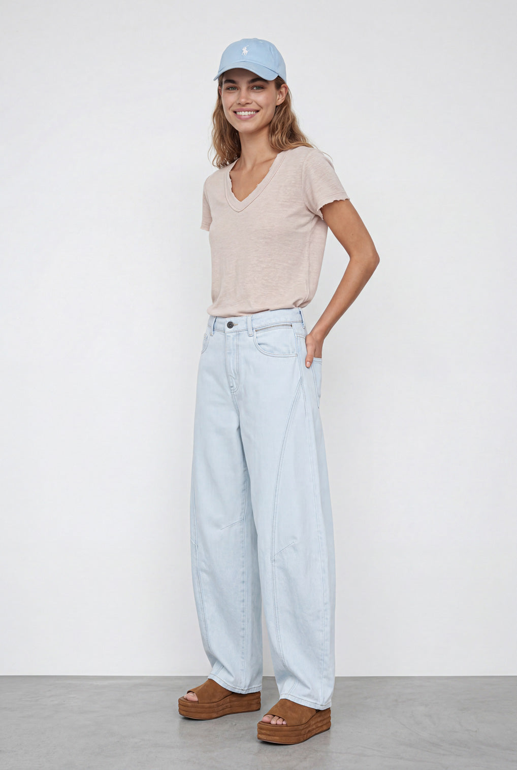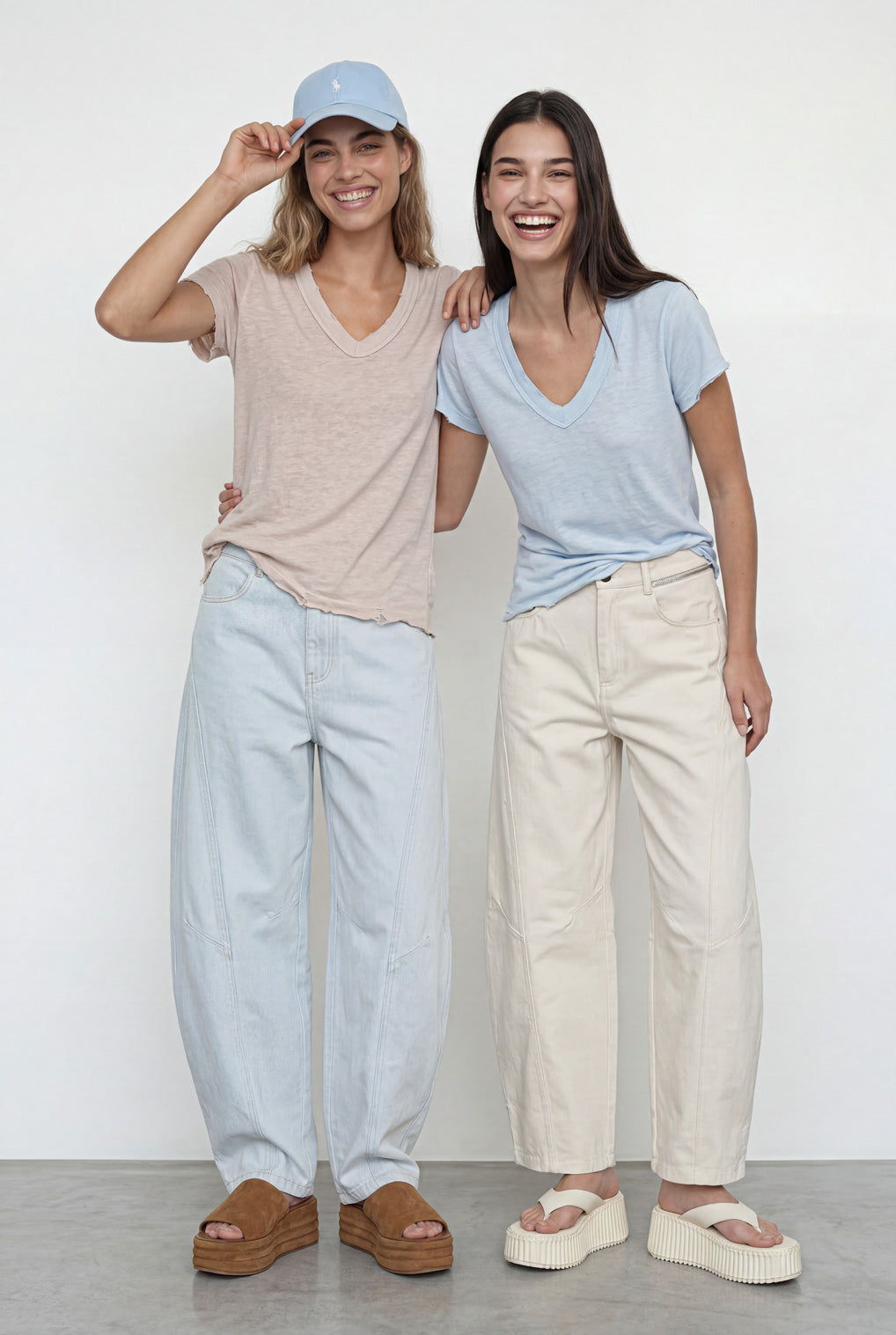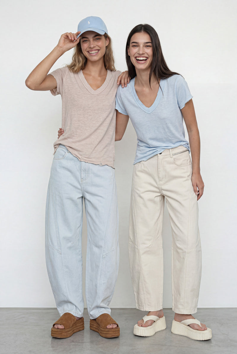 מכנסי דריל בגזרת בלון עם כיסים צידיים,רוכסן וכפתור קדמי.