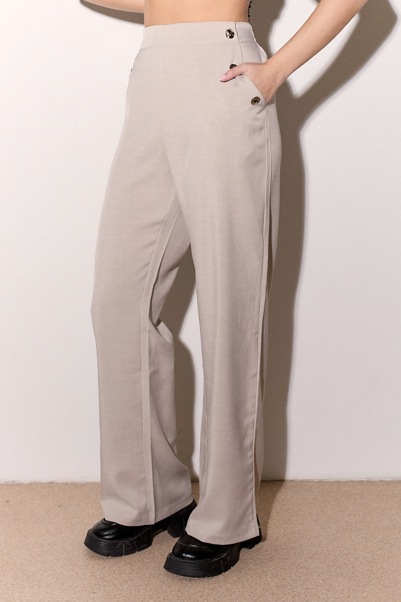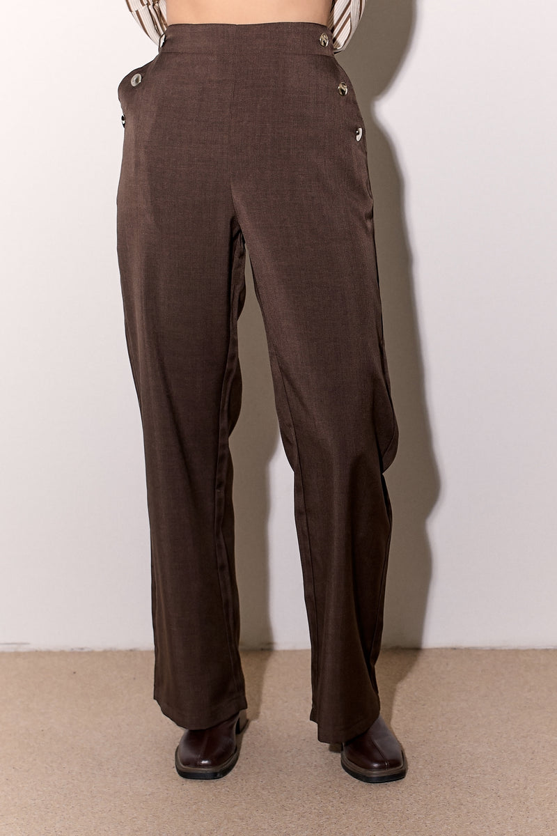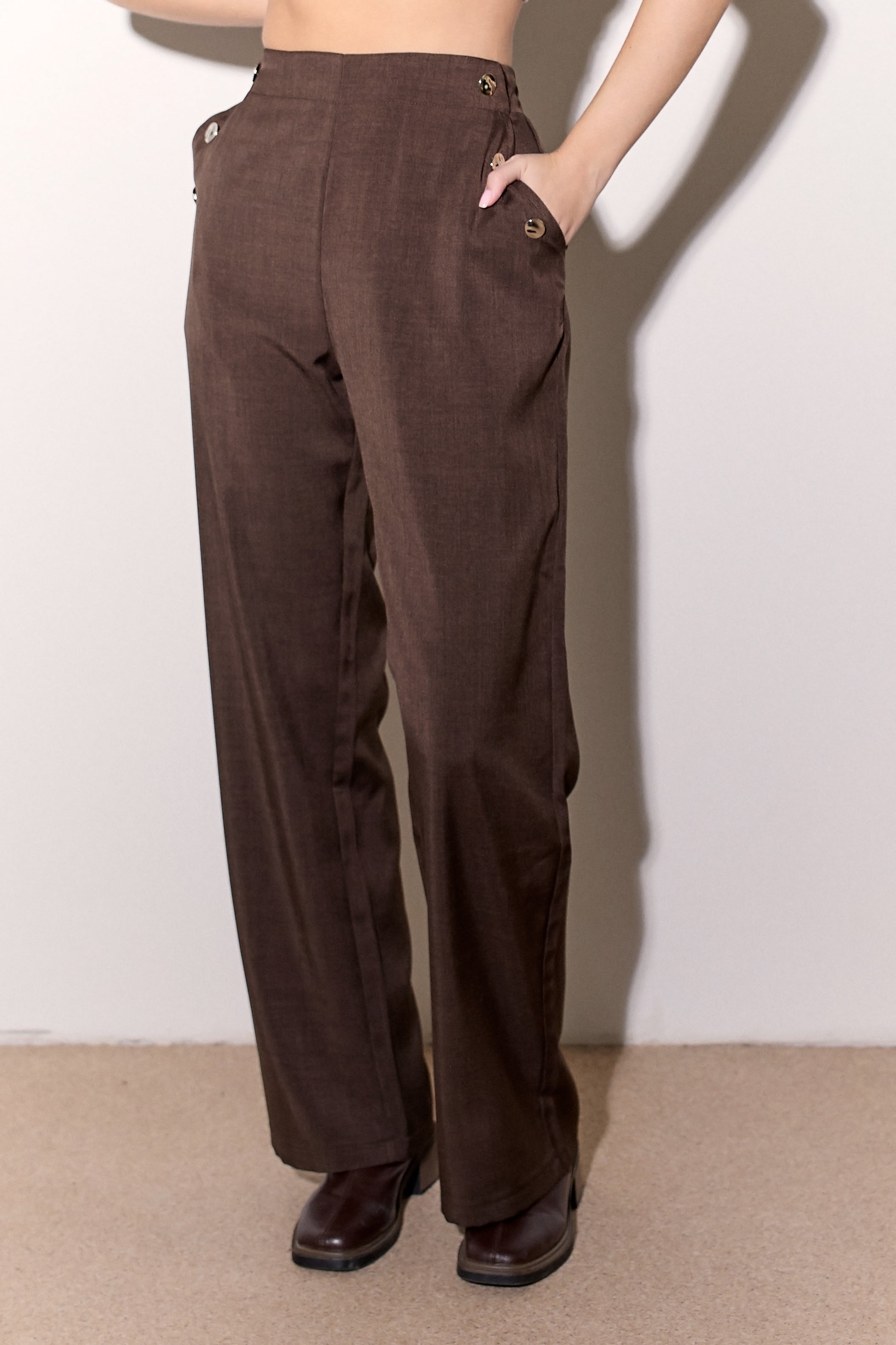 מכנסי ערב אלגנטיים מבד פשתן בגזרה מתרחבת עם כפתורים בכיסים.