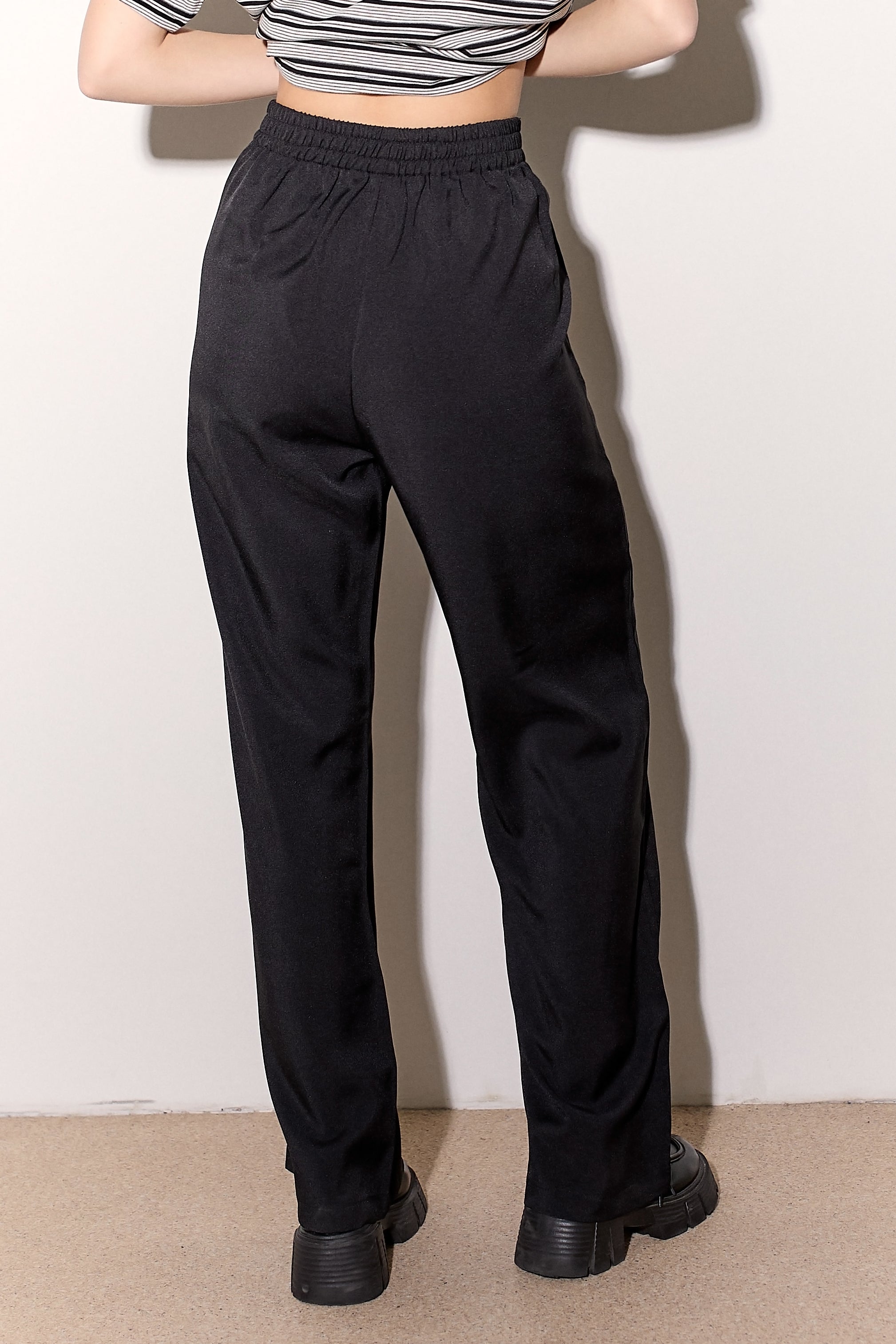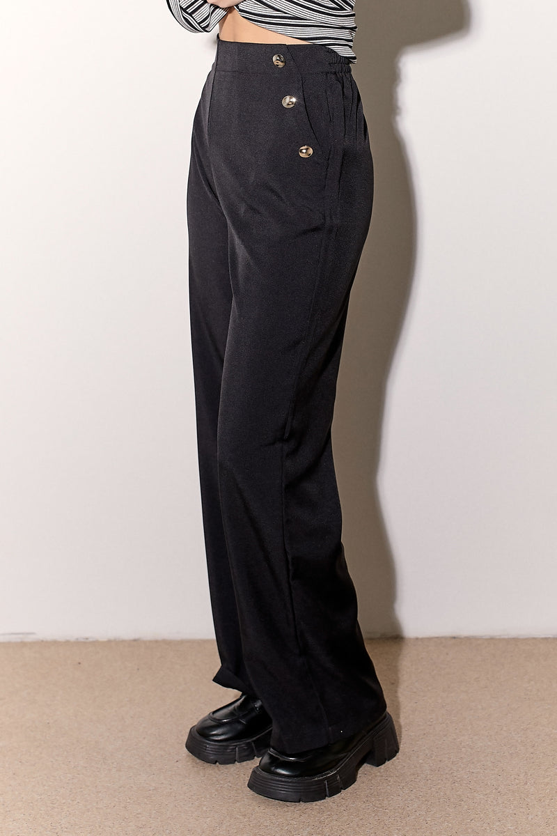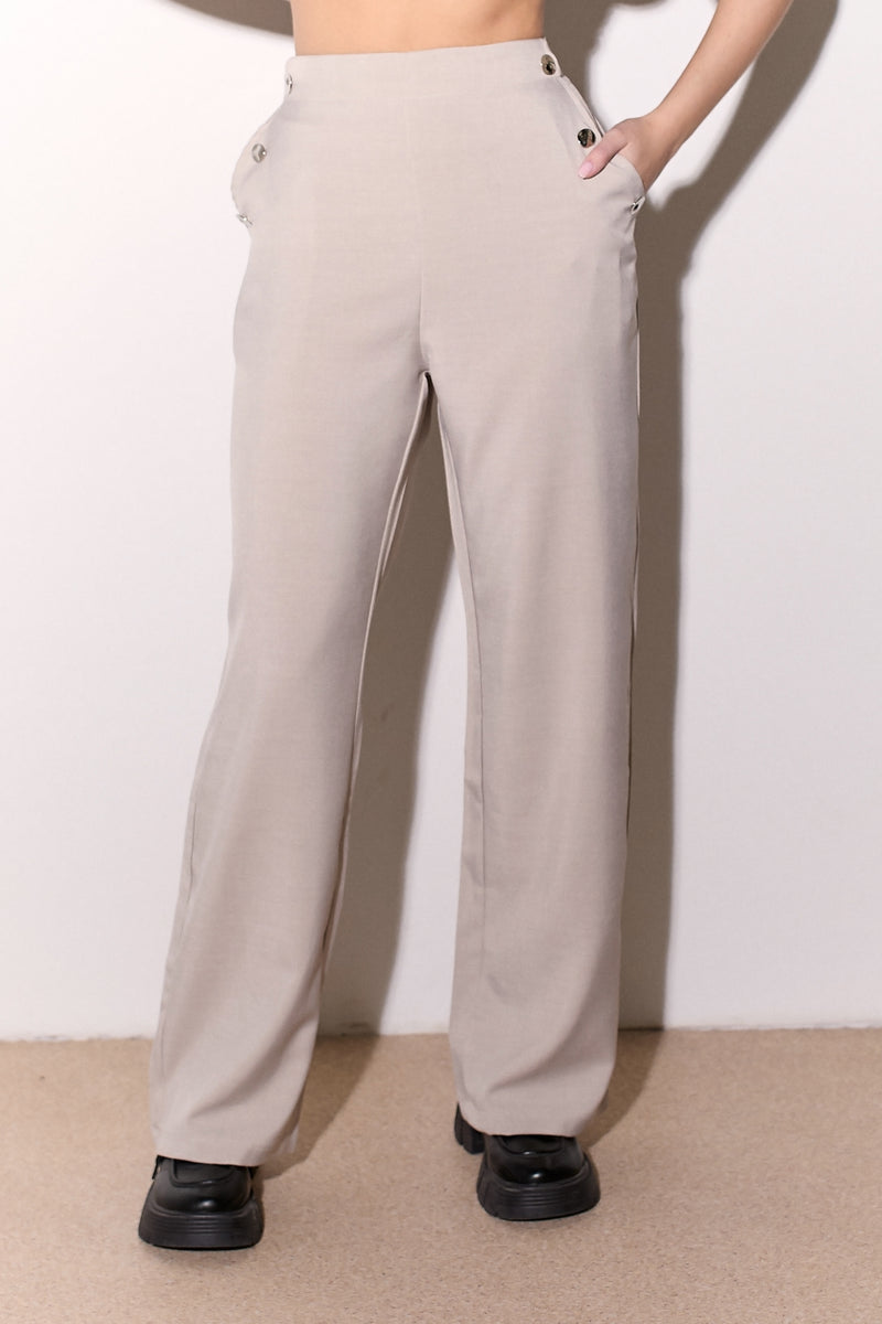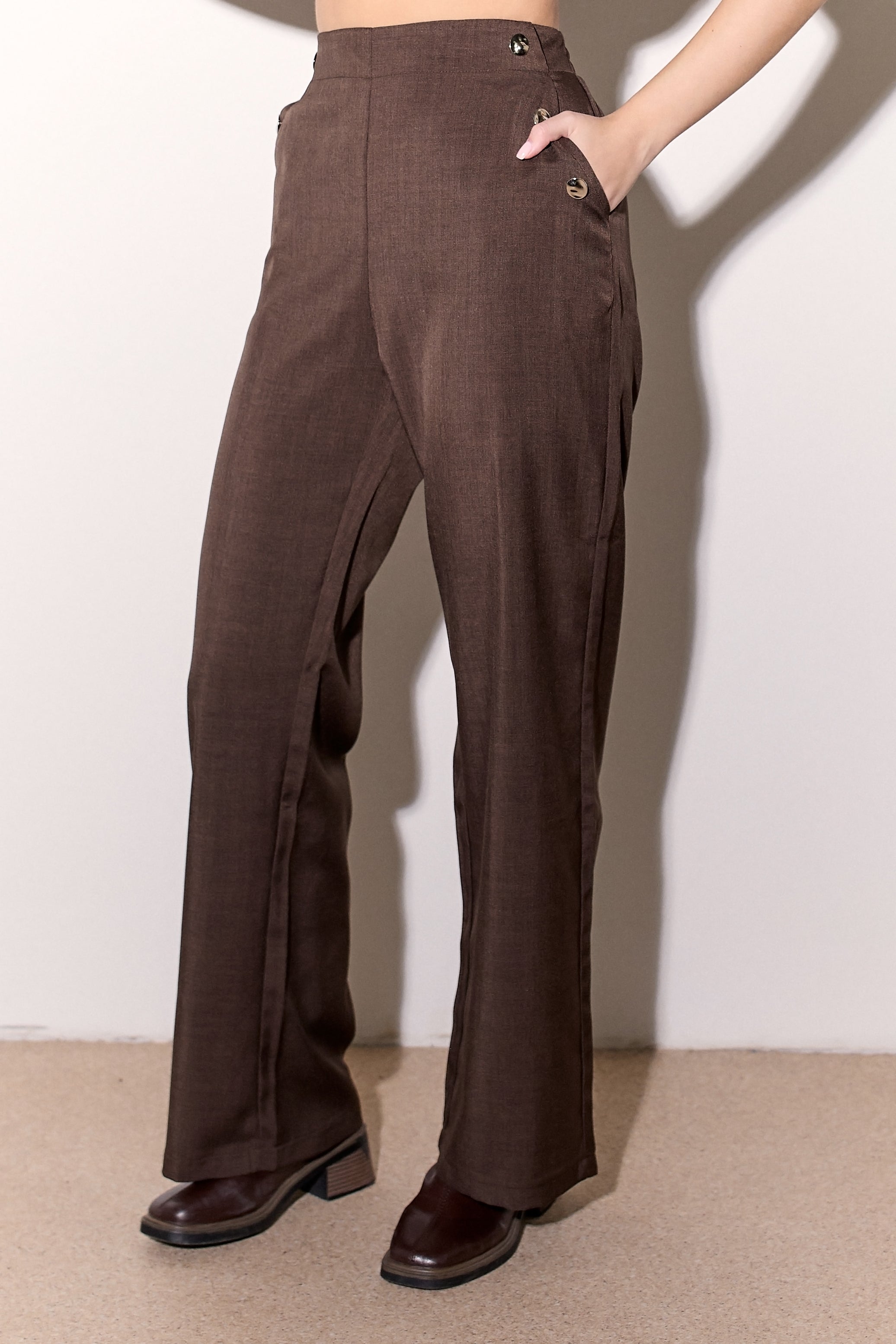 מכנסי ערב אלגנטיים מבד פשתן בגזרה מתרחבת עם כפתורים בכיסים.