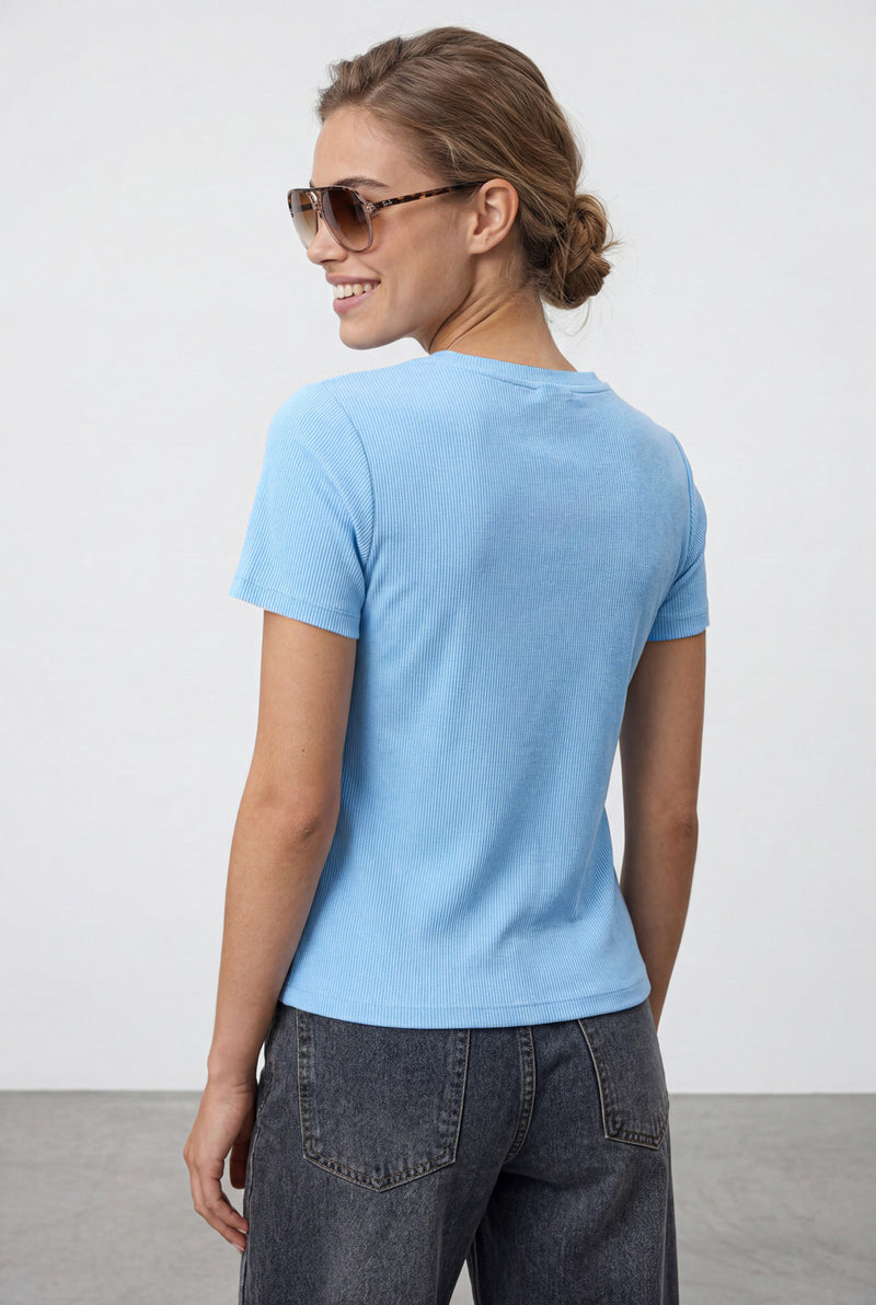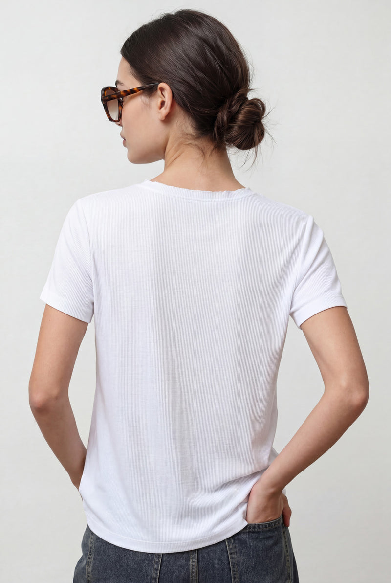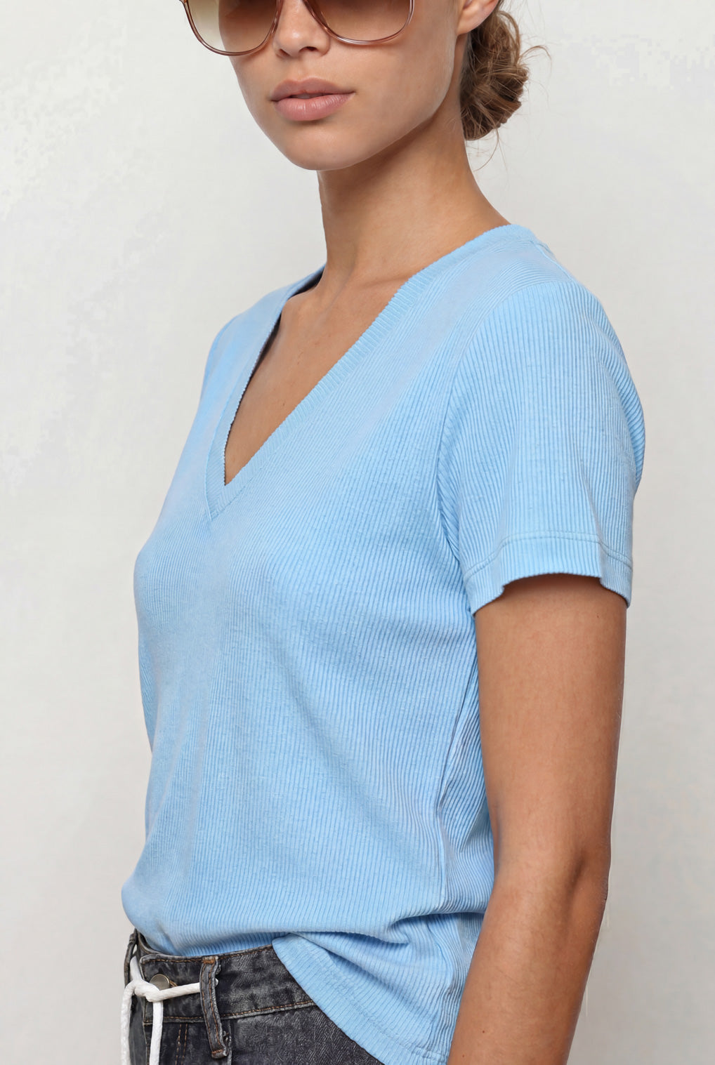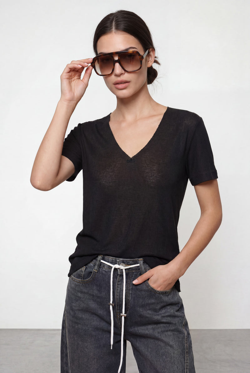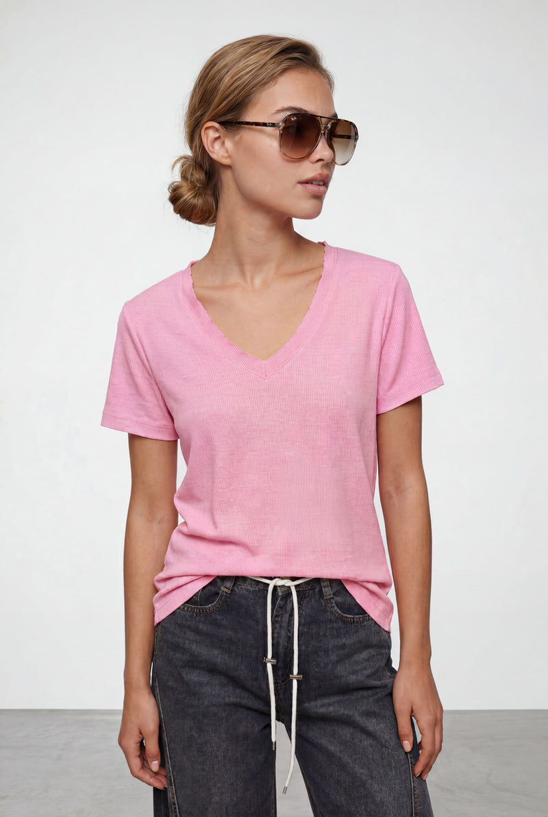 חולצת וי גזורה מבד ריב סלאב בסיומות גזורות.