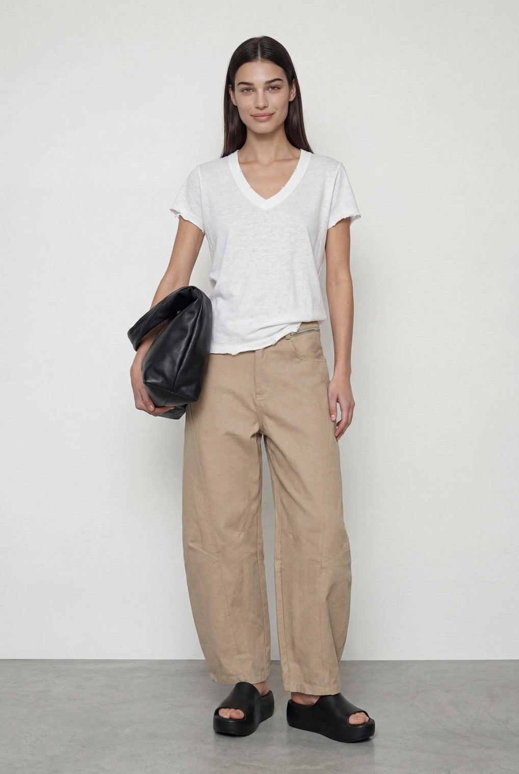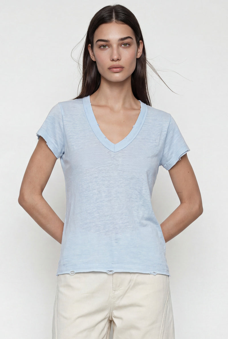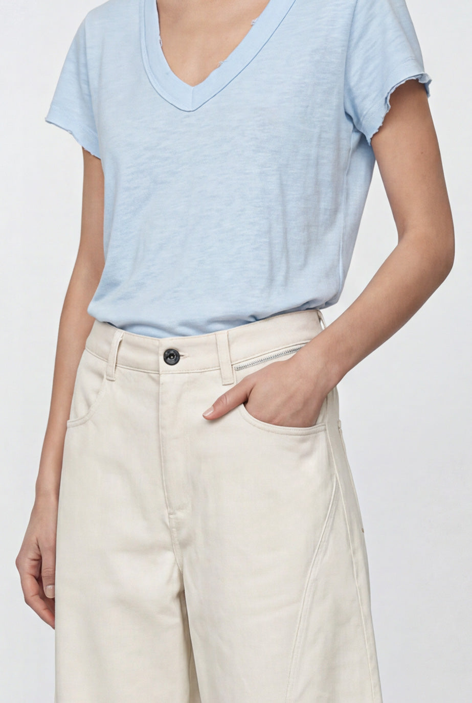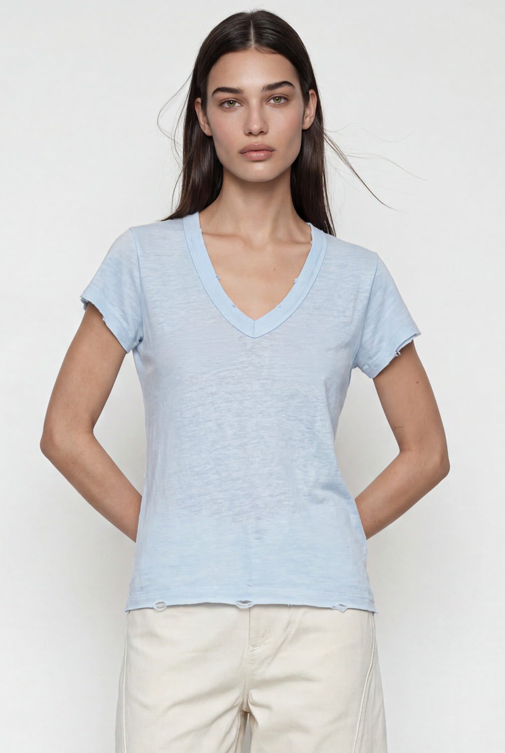 חולצת בייסיק מבד סלאב פשתן עם צווארון וי בגזרה מדויקת.