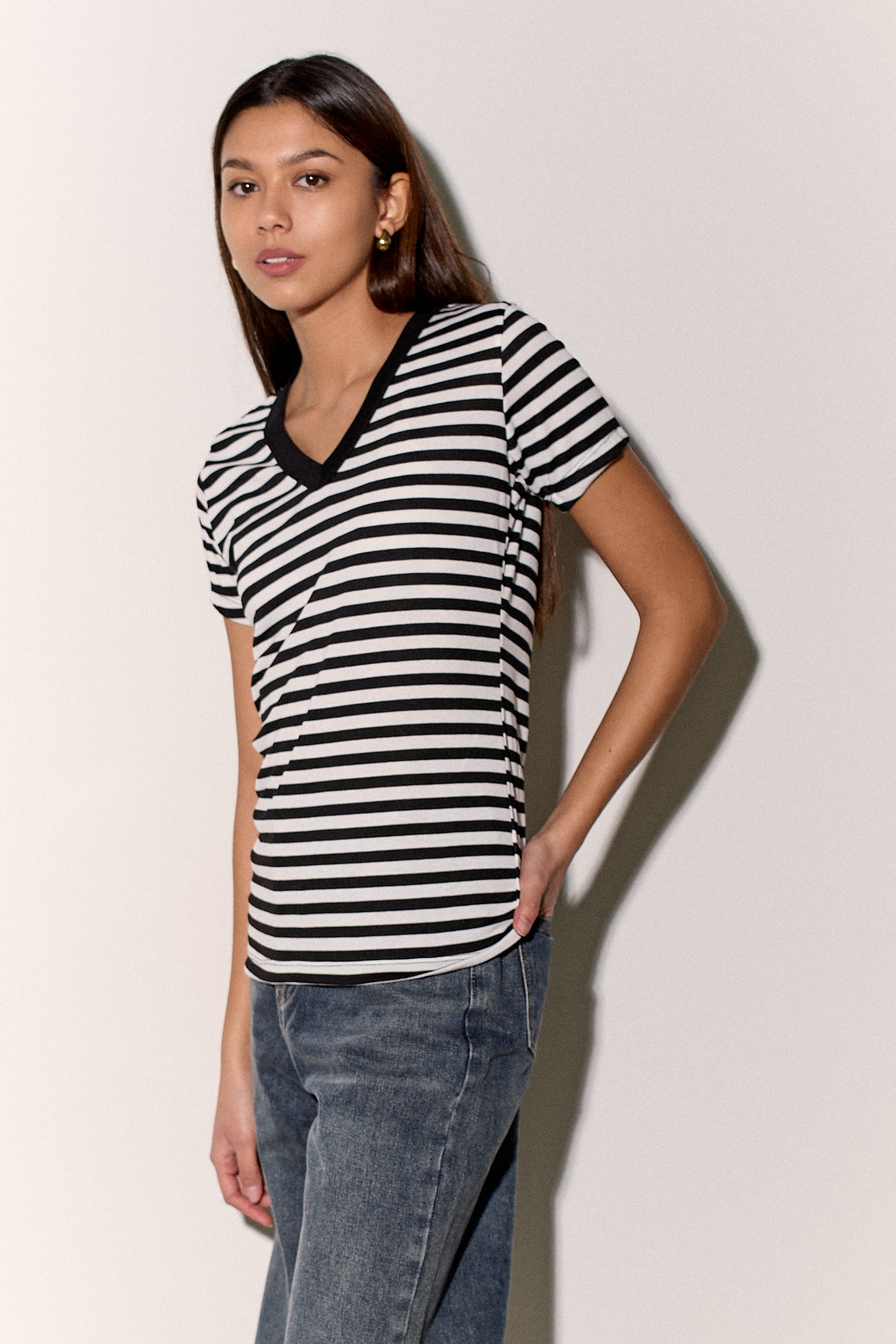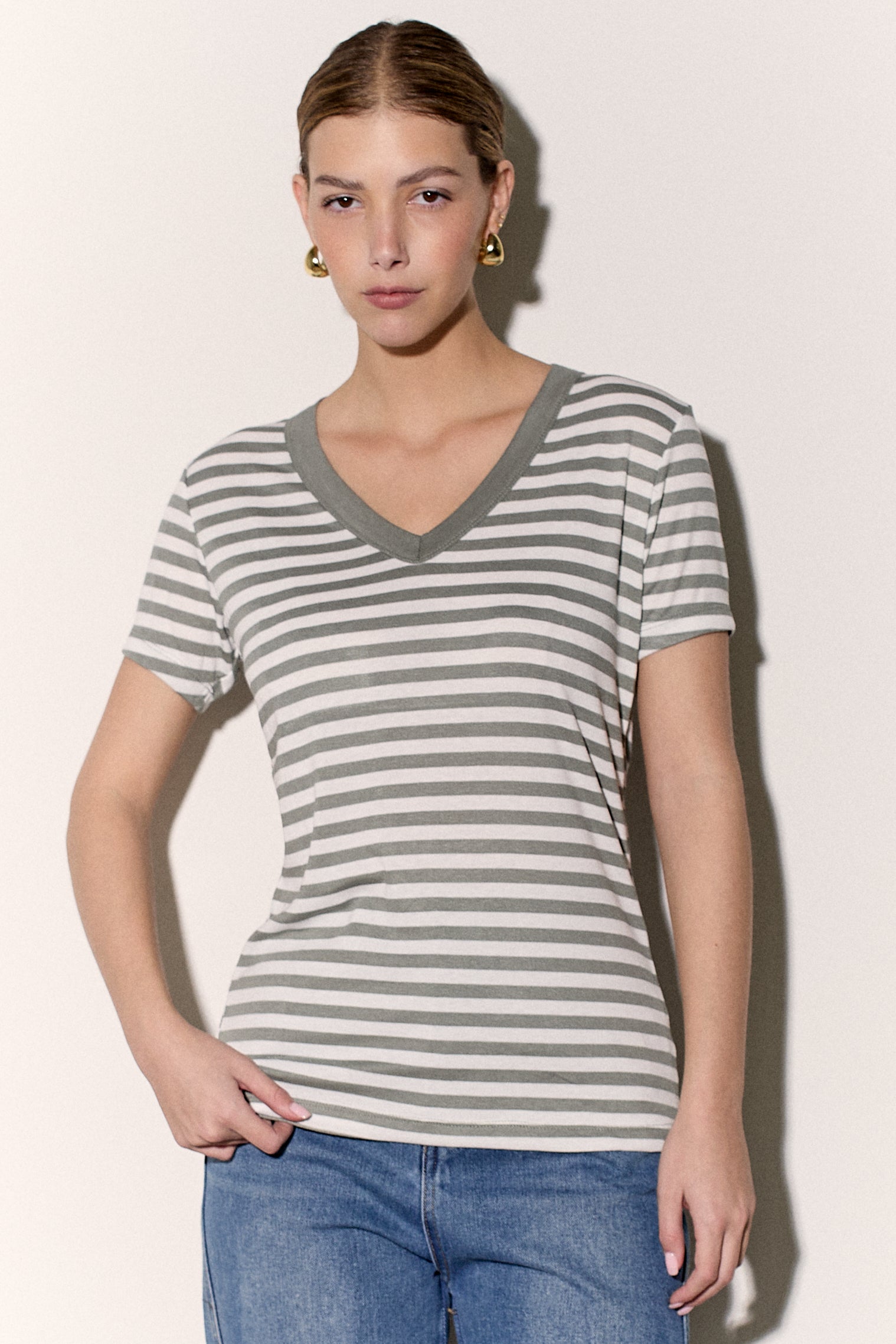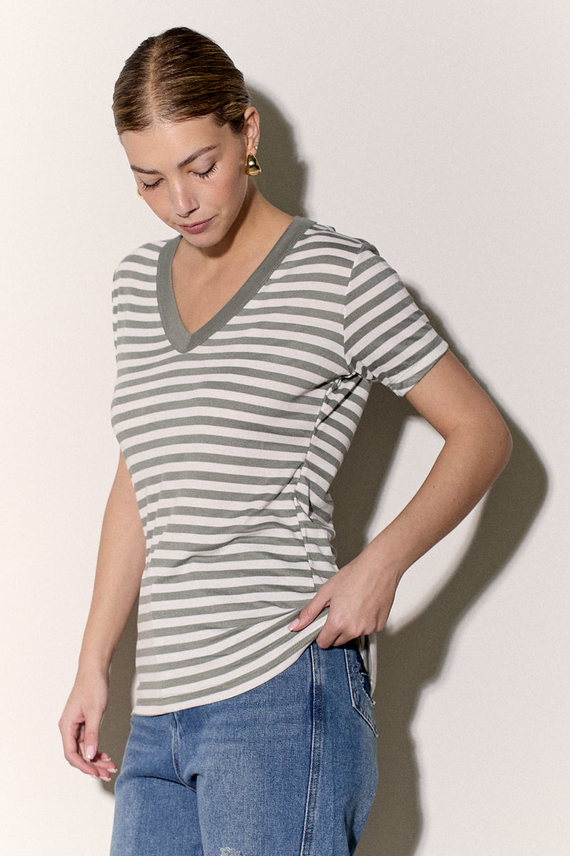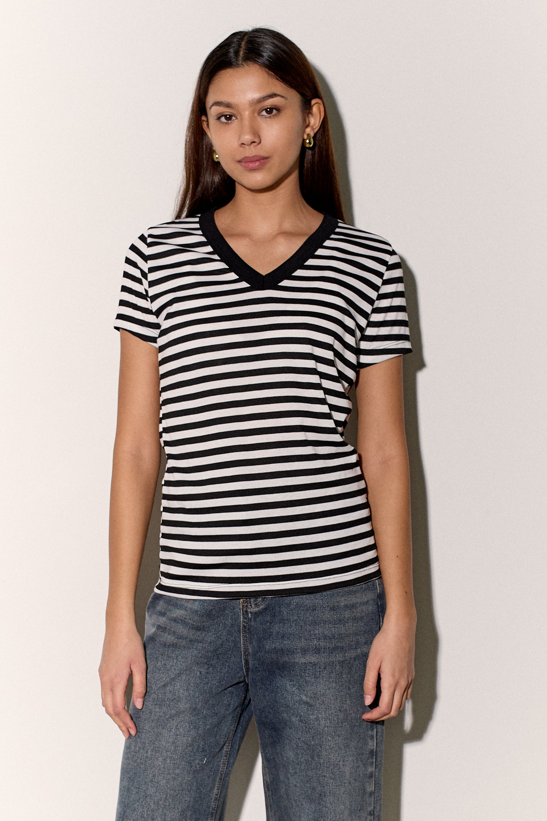 חולצת בייסיק מבד פיינריב כותנה בפרינט פסים עם צווארון וי.