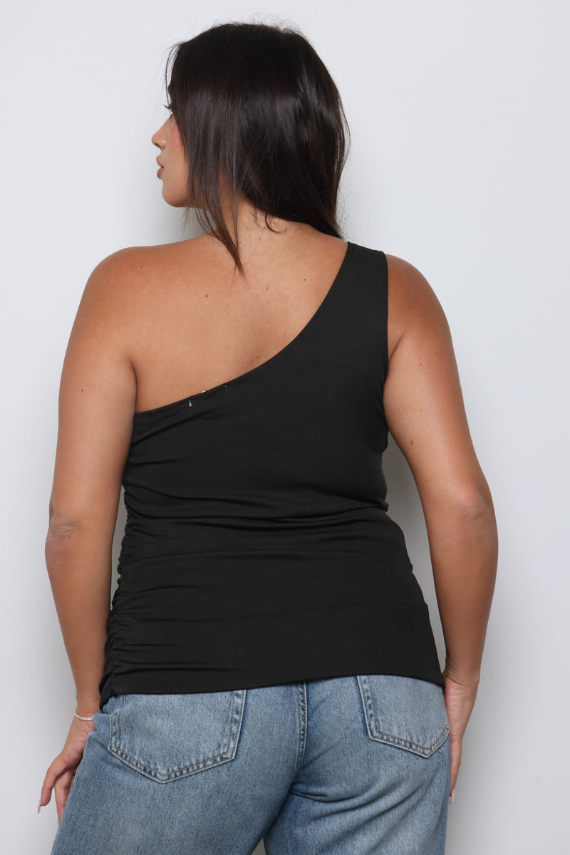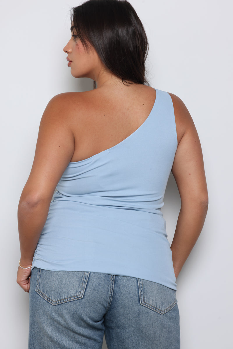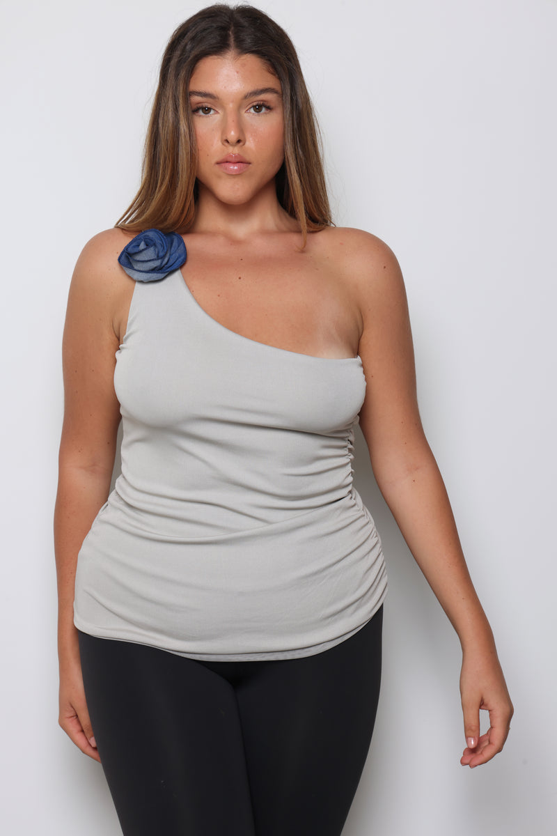 גופית וואן שולדר אלגנטית מבד ריב לייקרה עם פרח ג'ינס.