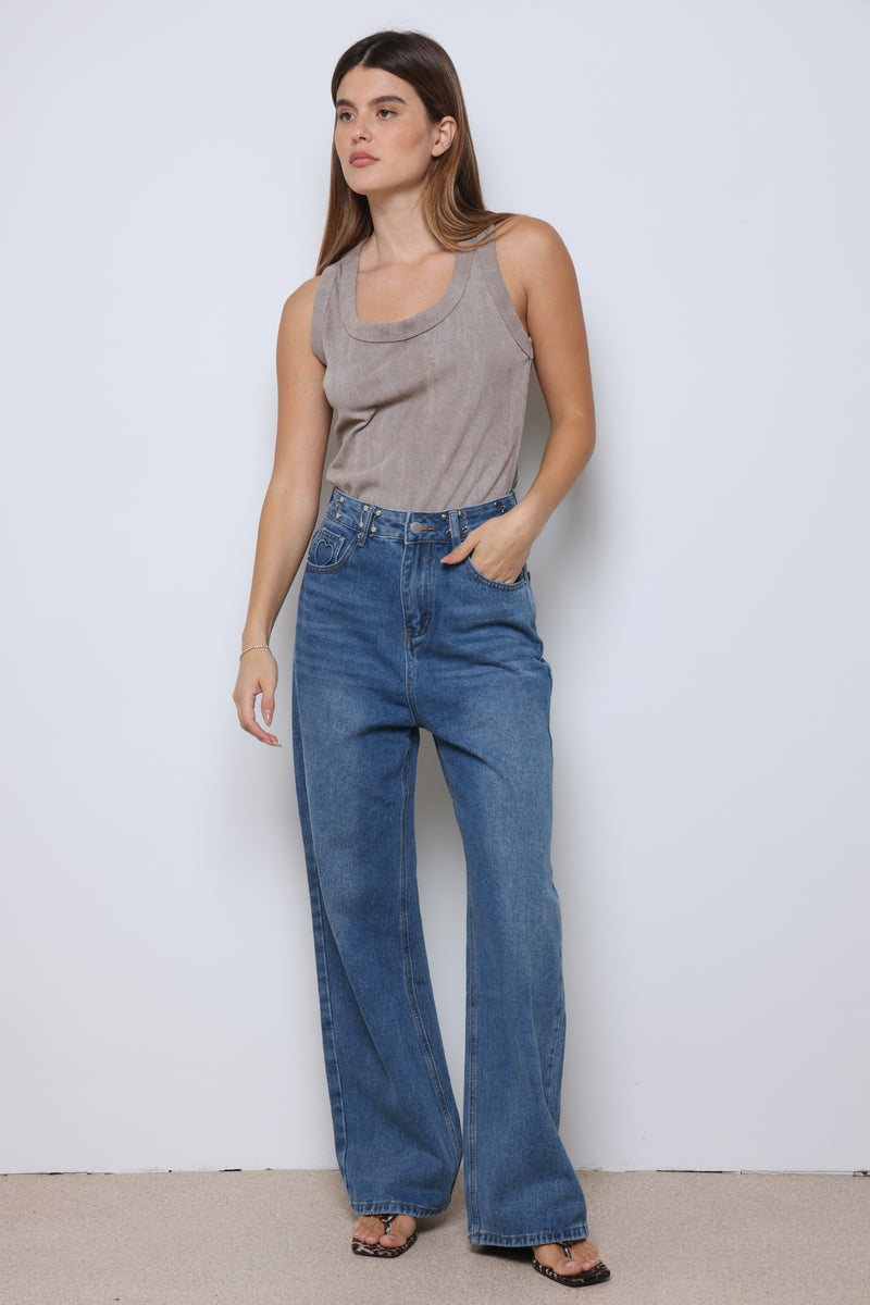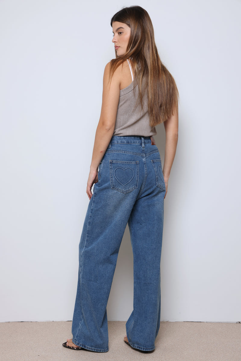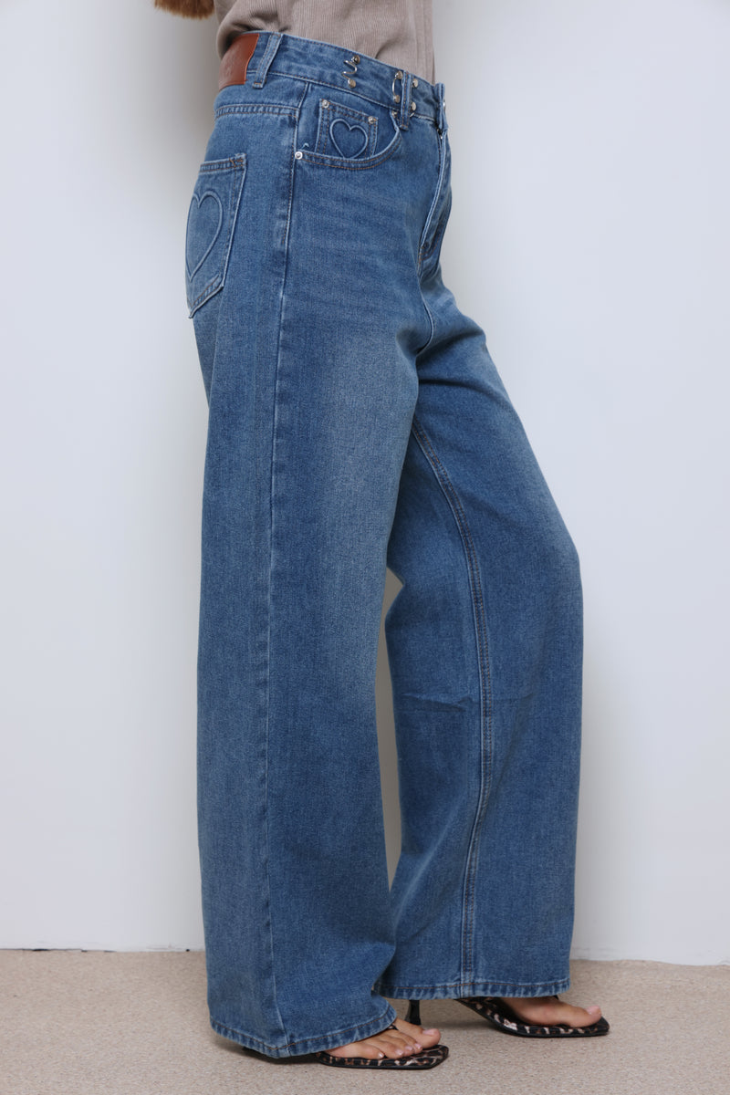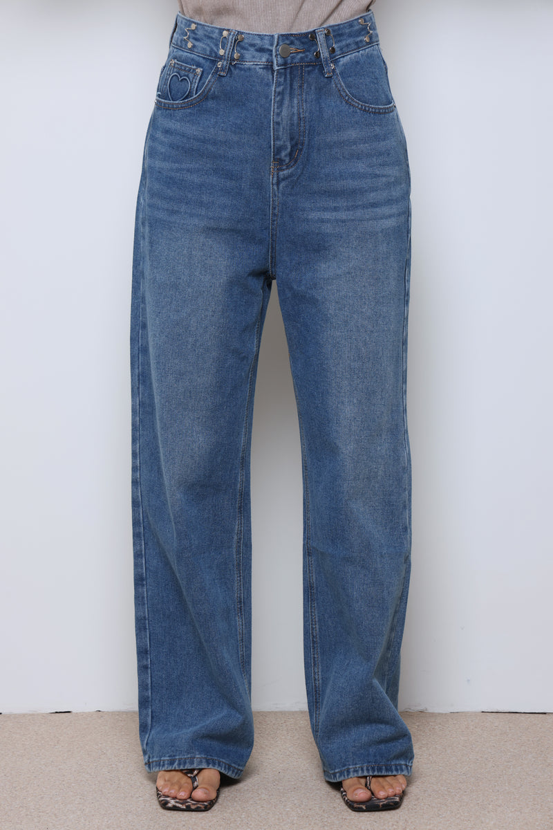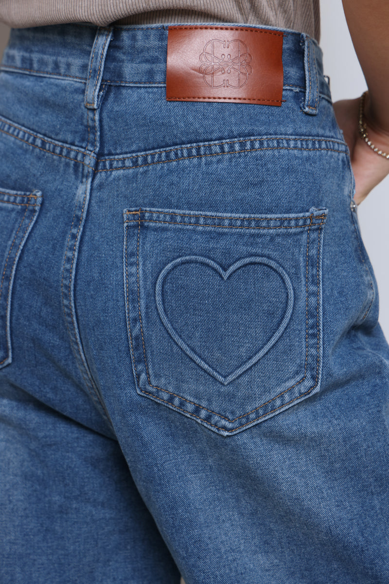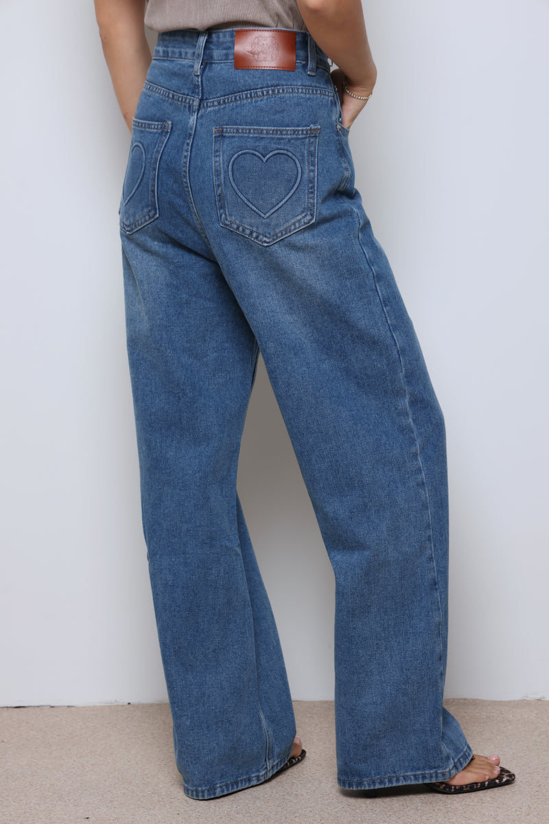 ג'ינס ארוך מתרחב עם כיסים,סגירת כפתור והטבעת לב.