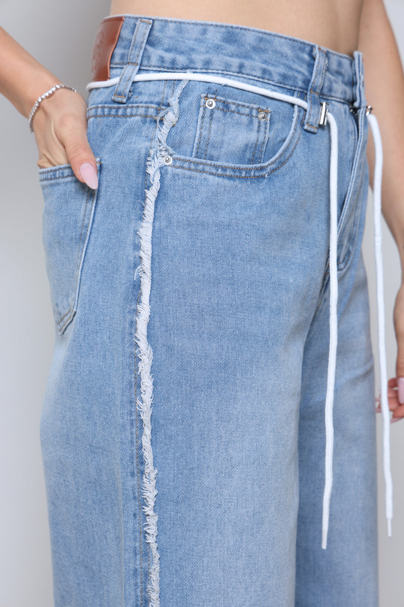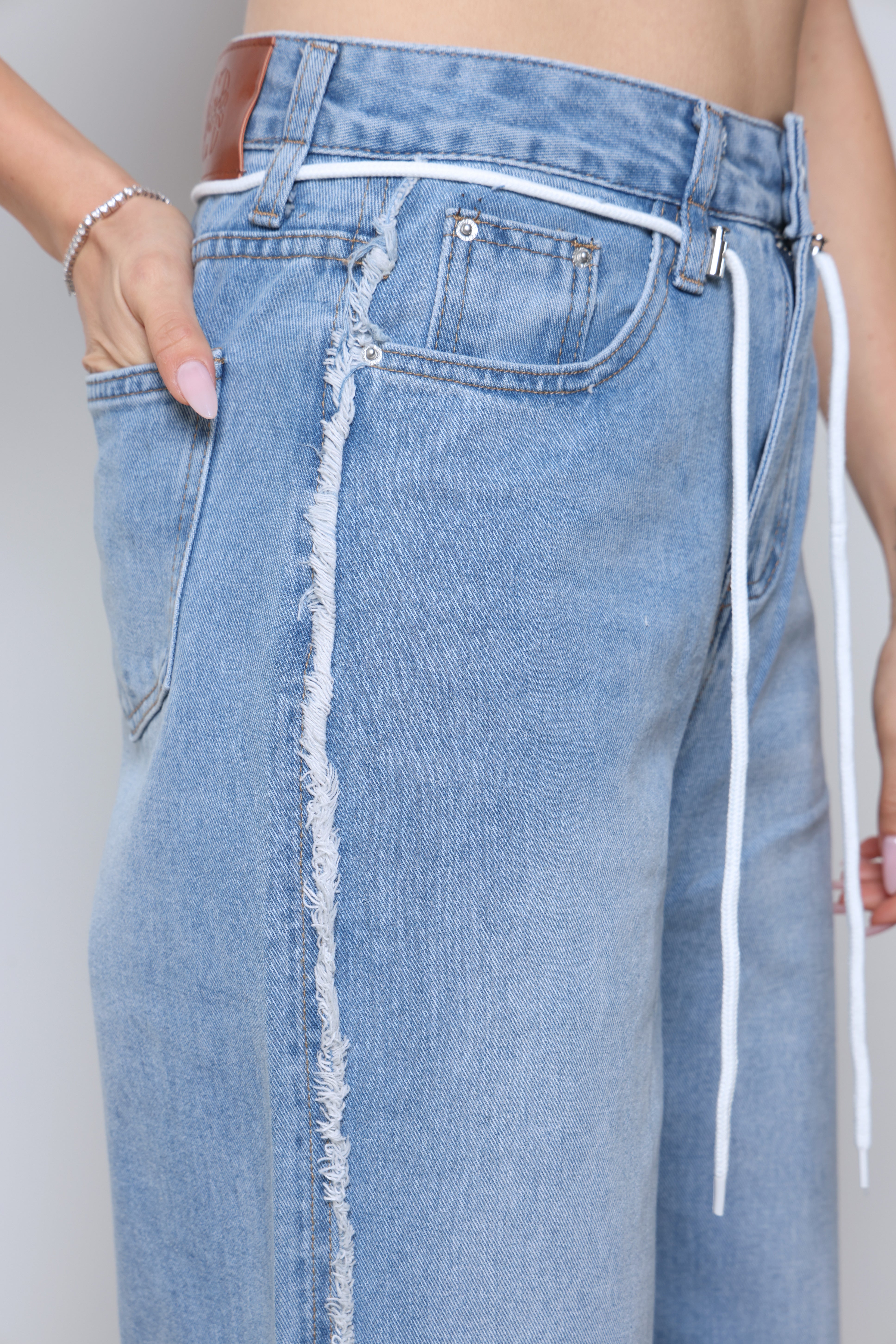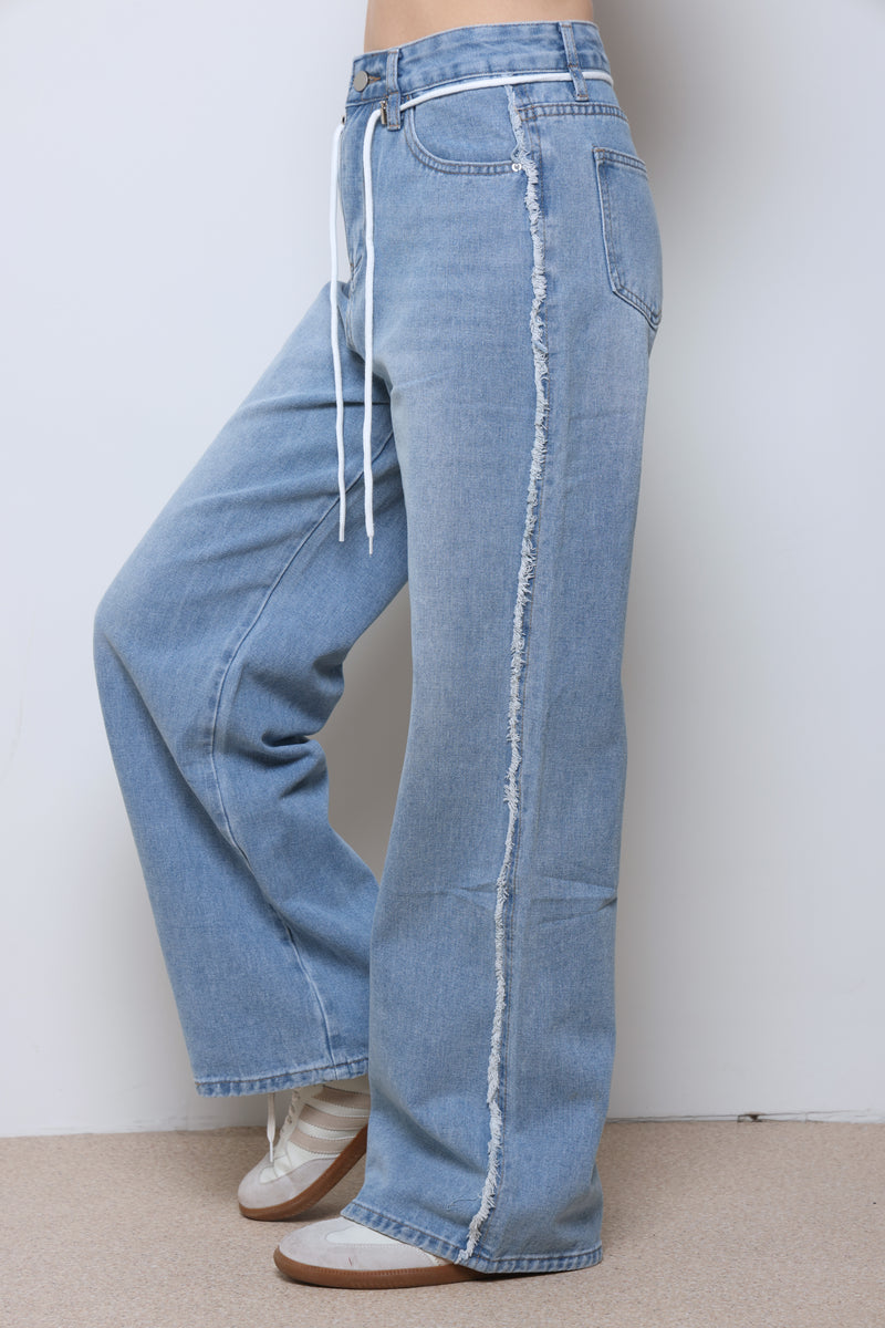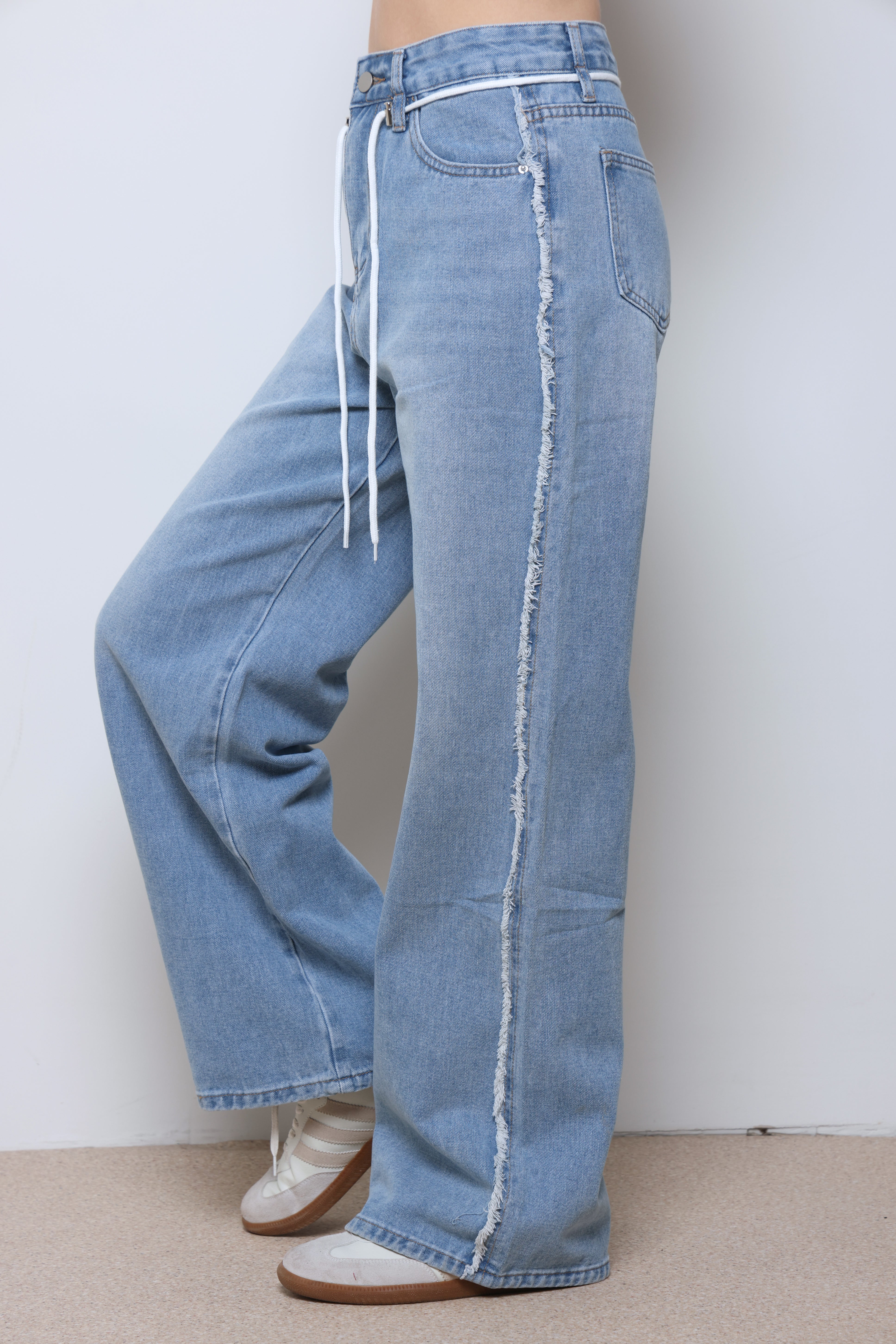 ג'ינס ארוך מתרחב עם כיסים,שרוך בחגורה וסגירת כפתור.