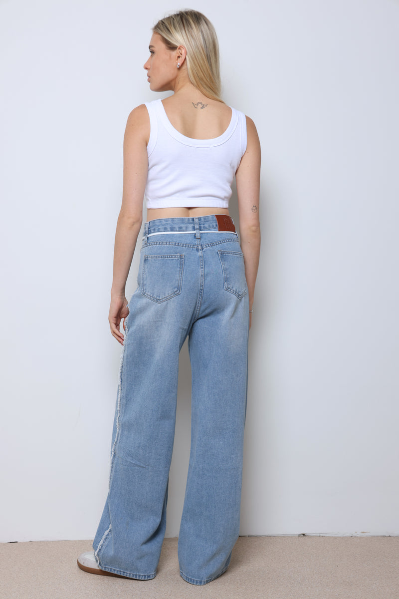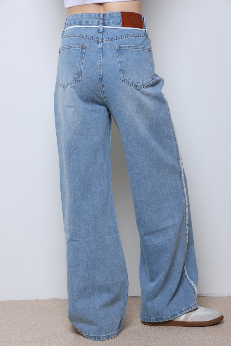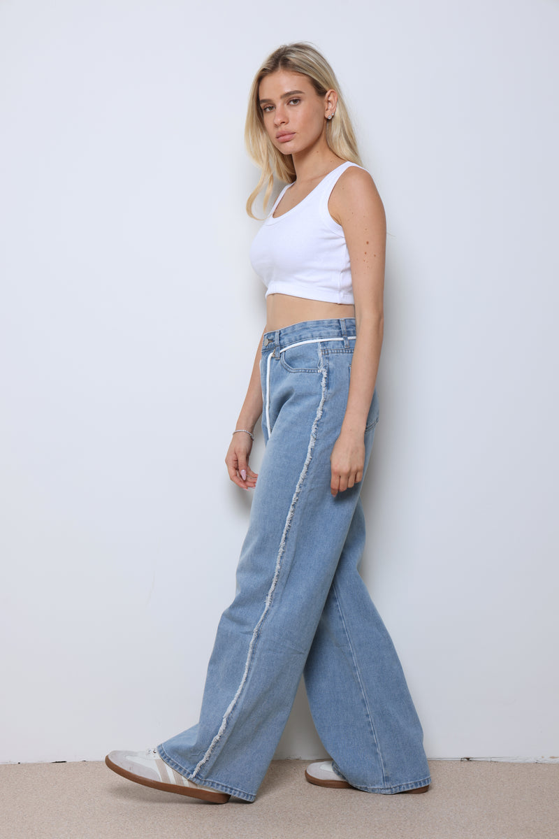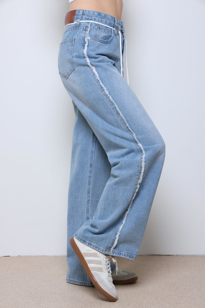 ג'ינס ארוך מתרחב עם כיסים,שרוך בחגורה וסגירת כפתור.