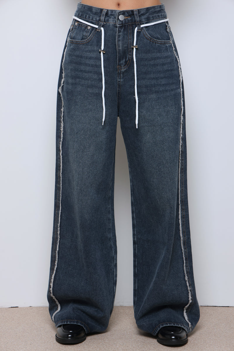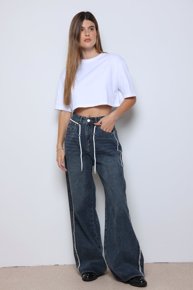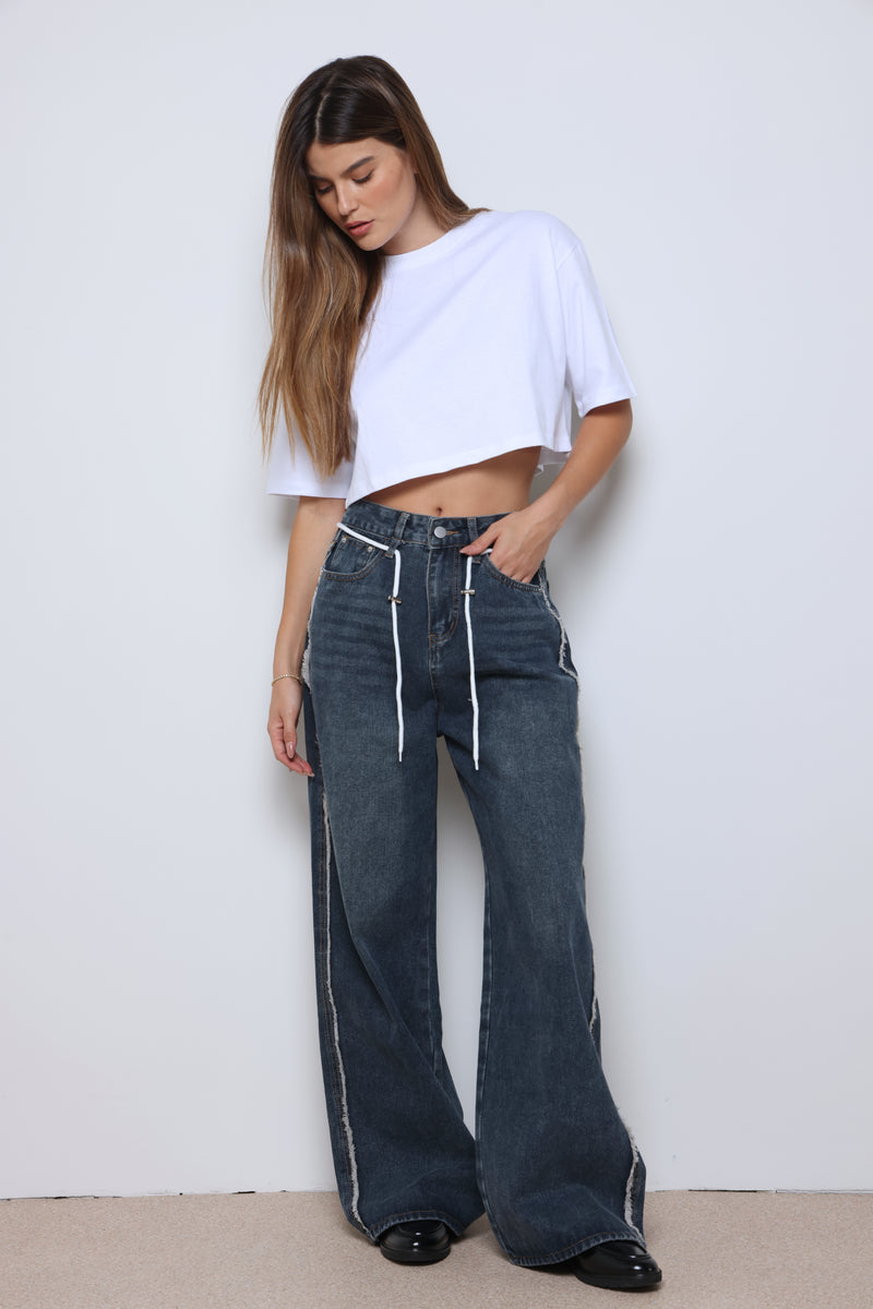 ג'ינס ארוך מתרחב עם כיסים,שרוך בחגורה וסגירת כפתור.
