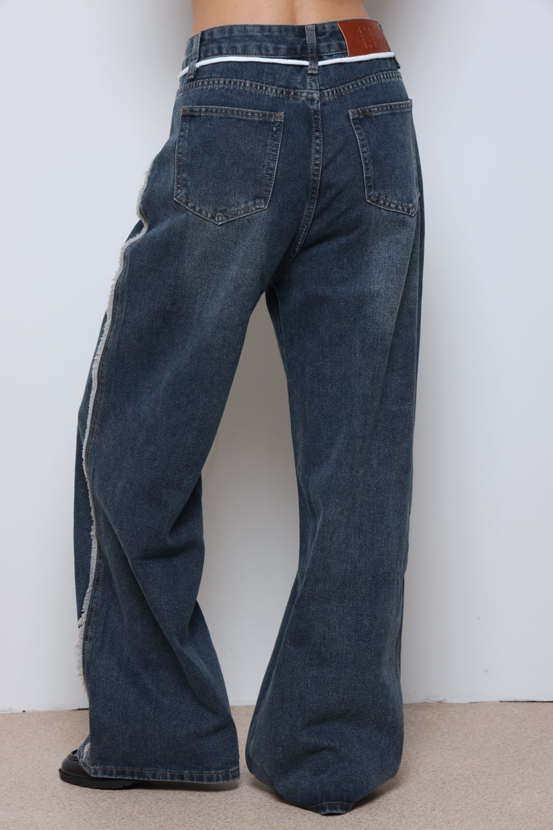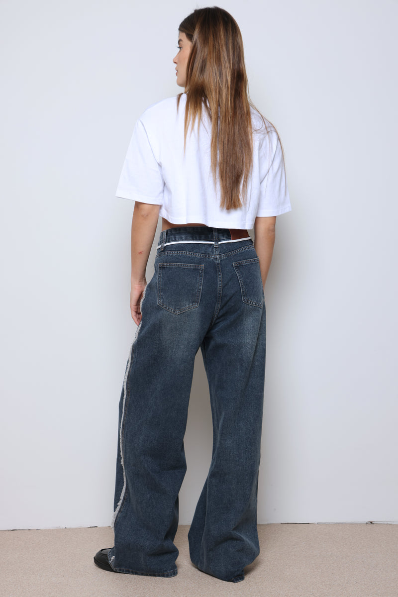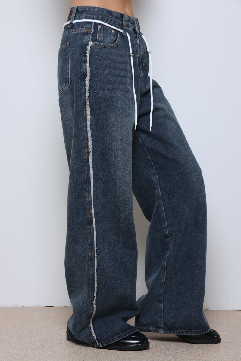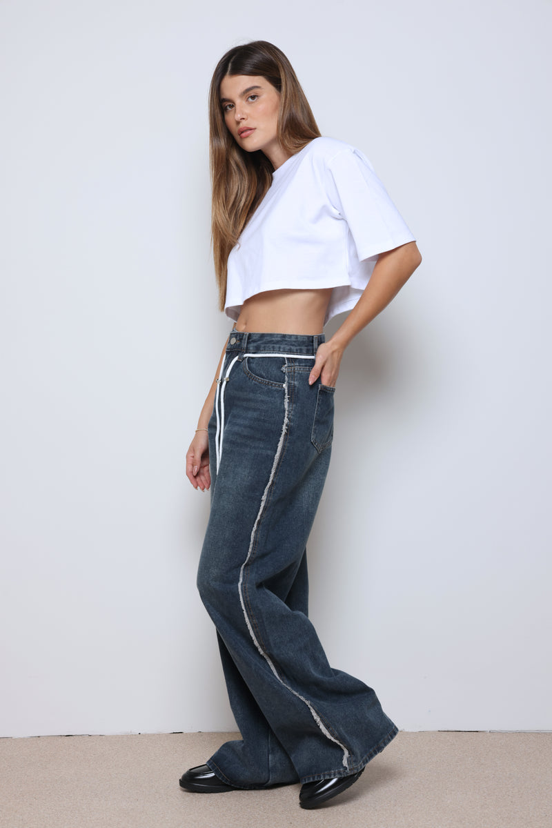 ג'ינס ארוך מתרחב עם כיסים,שרוך בחגורה וסגירת כפתור.