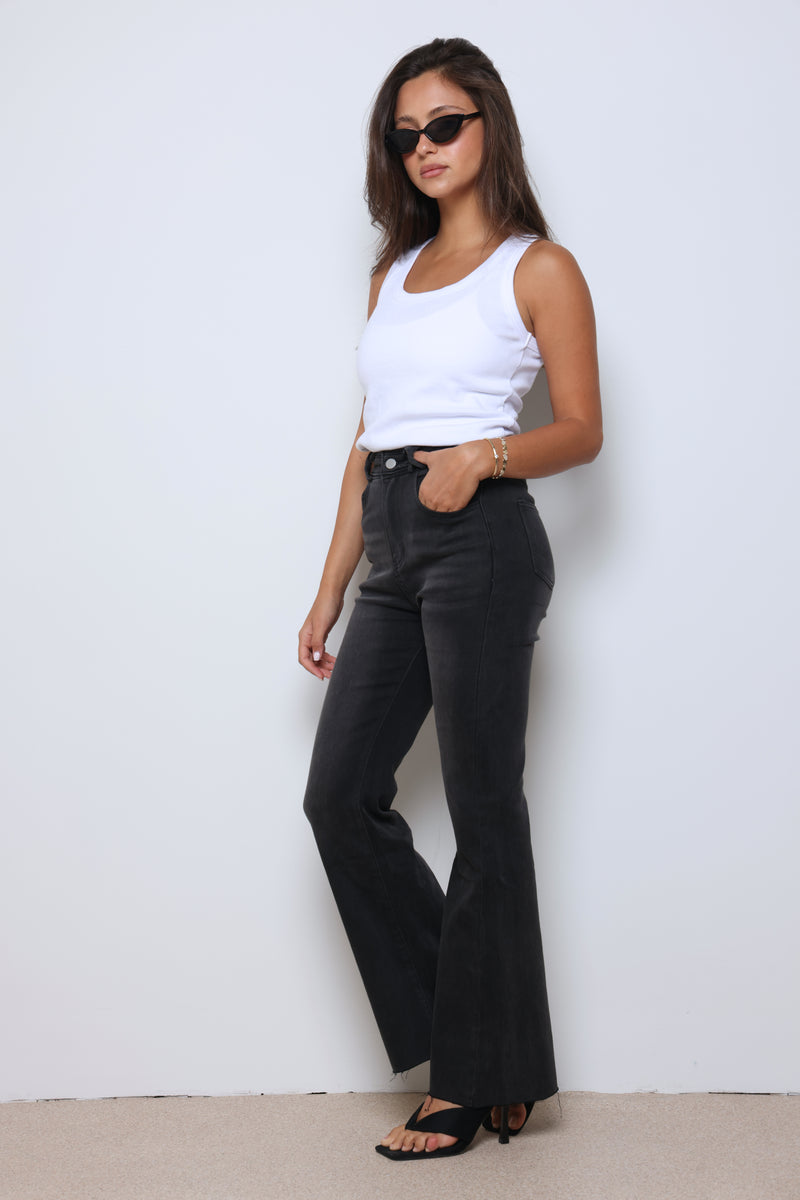 ג'ינס ארוך בסיומת פדלפון עם כיסים וסגירת כפתור.