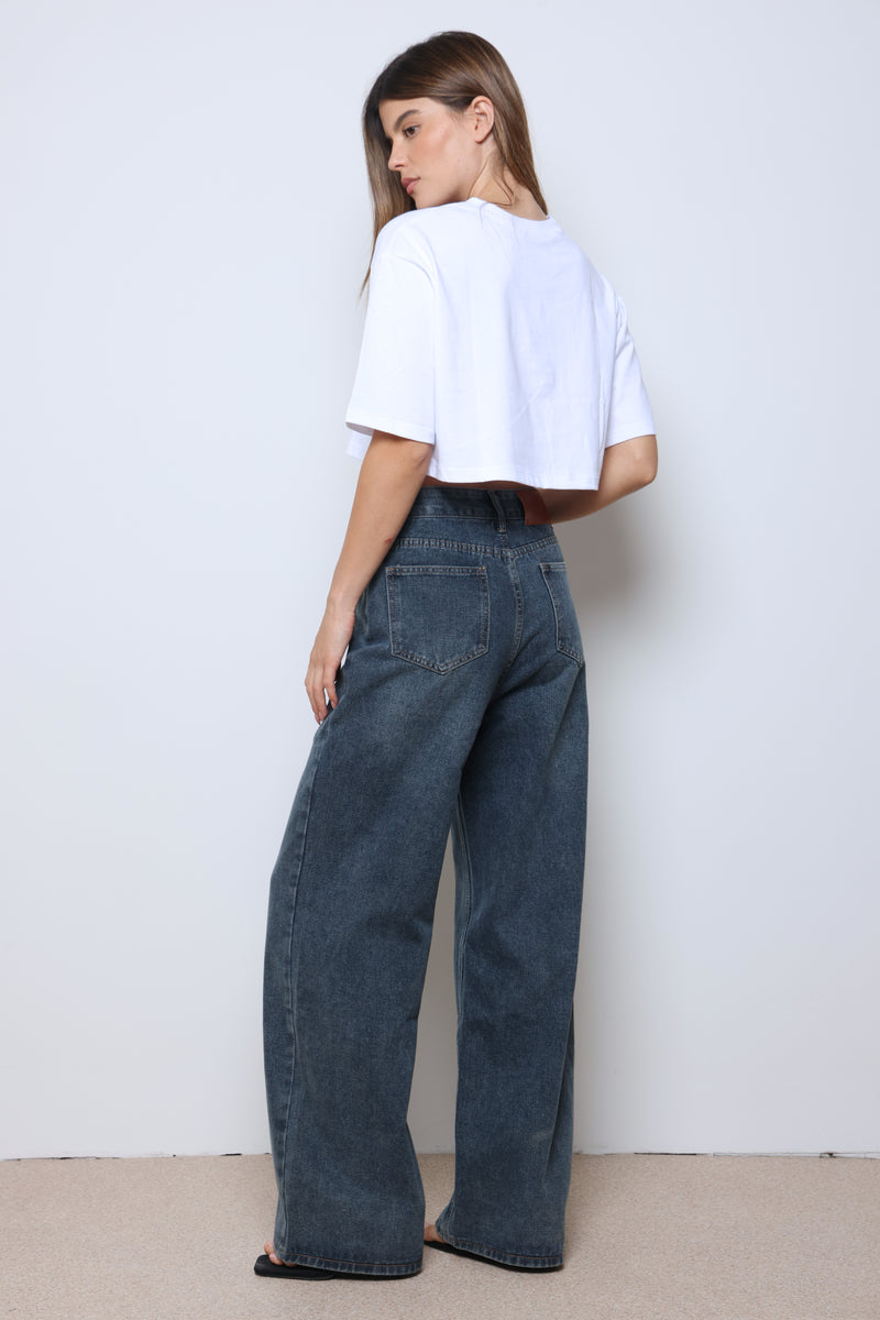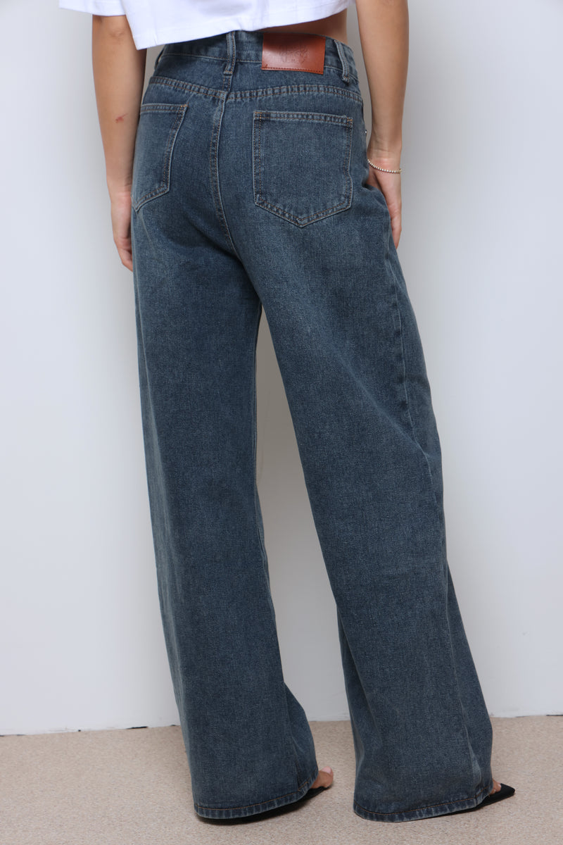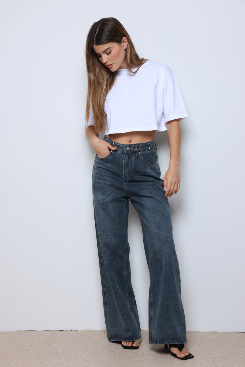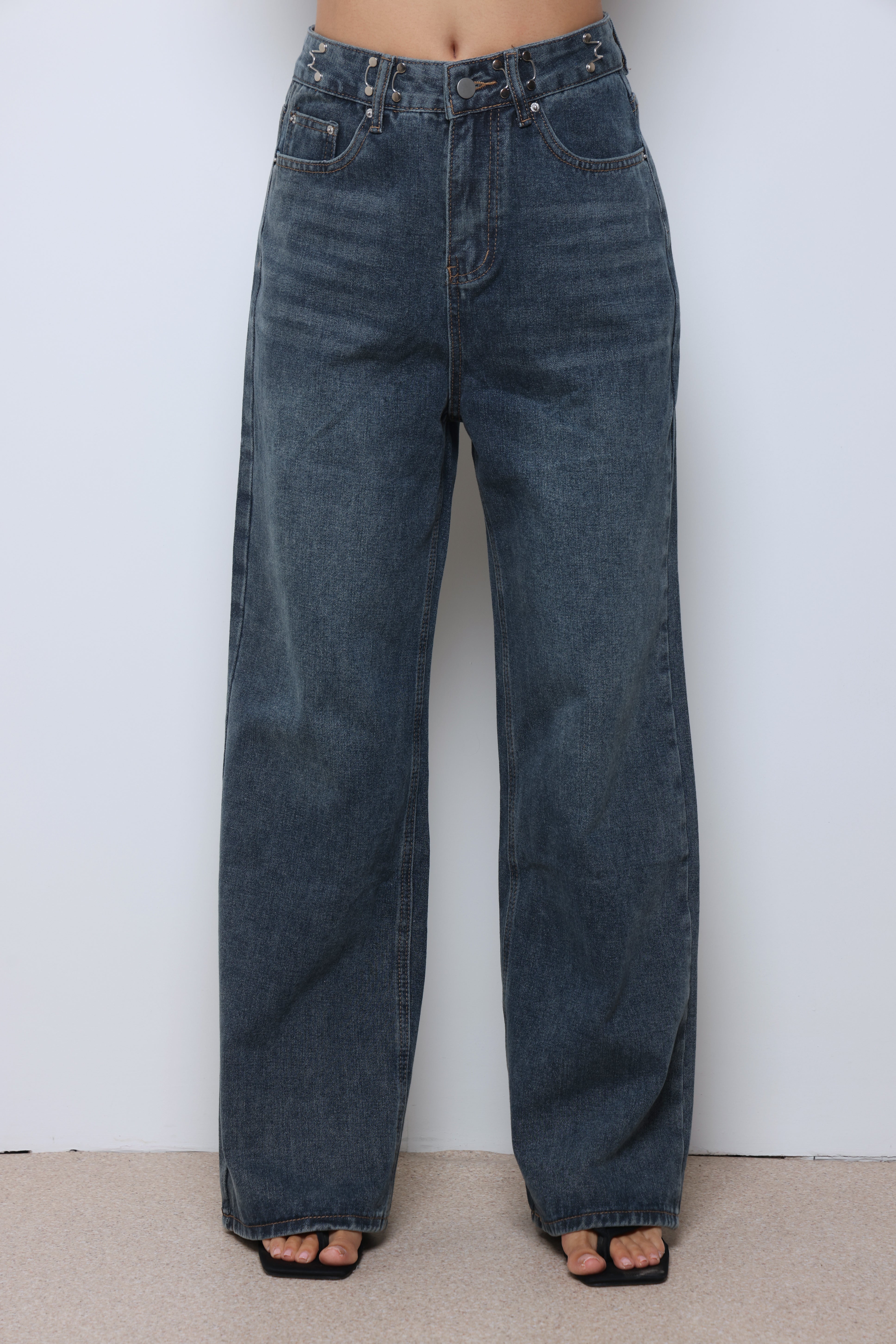 ג'ינס ארוך מתרחב עם כיסים, קרסים וסגירת כפתור.