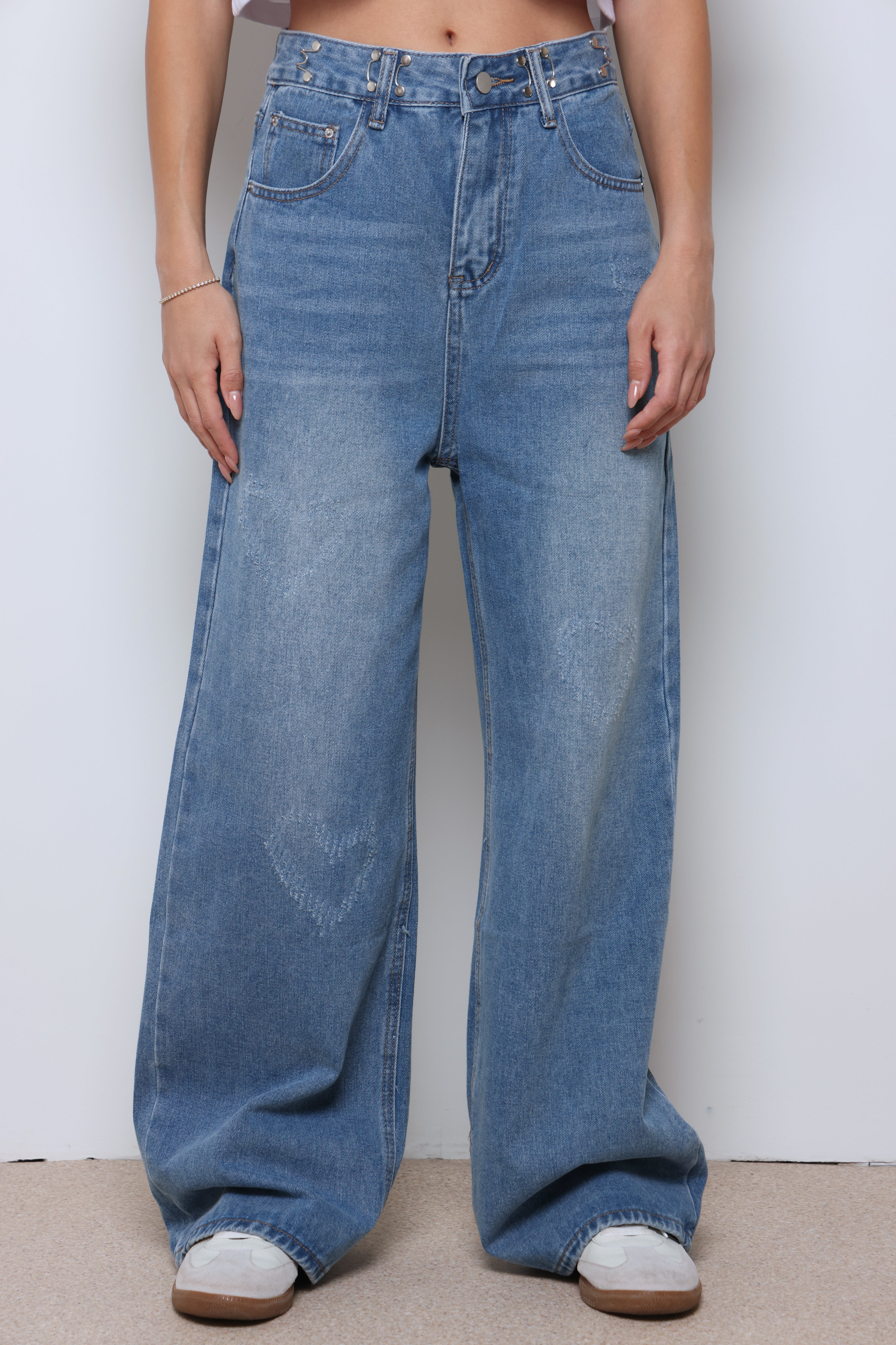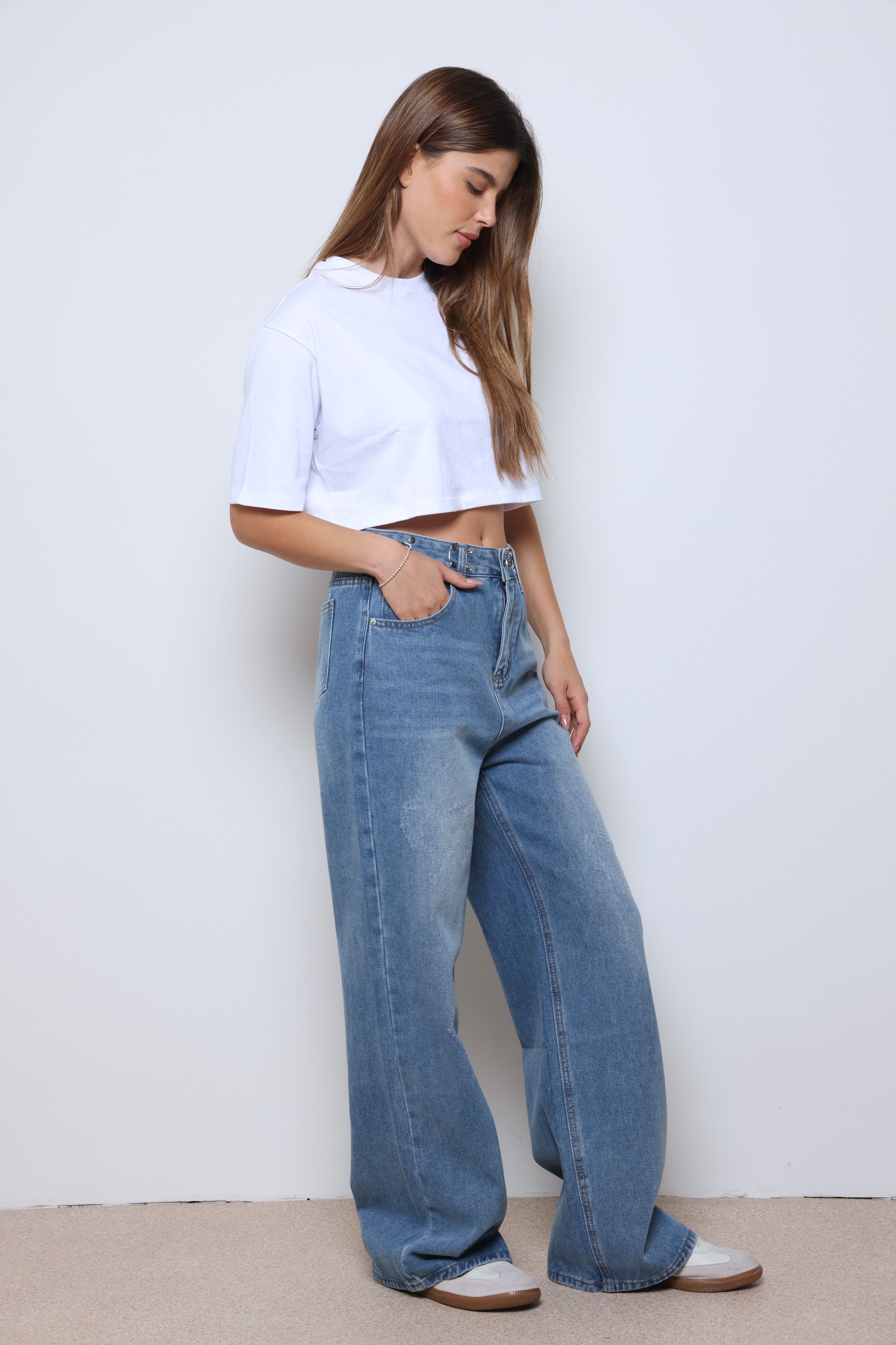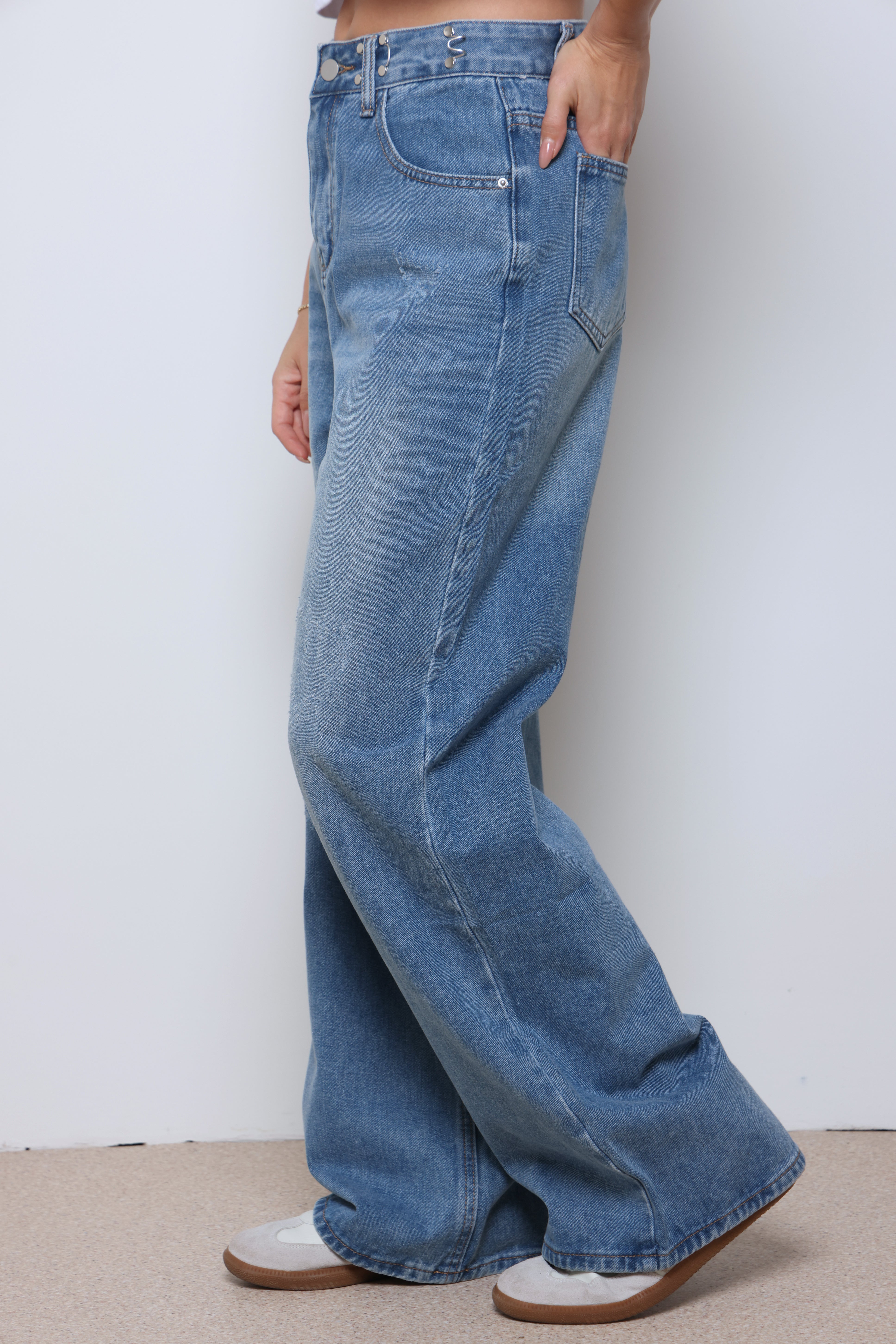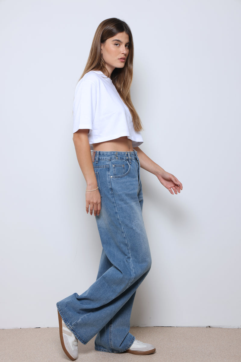 ג'ינס ארוך מתרחב עם כיסים וסגירת כפתור.
