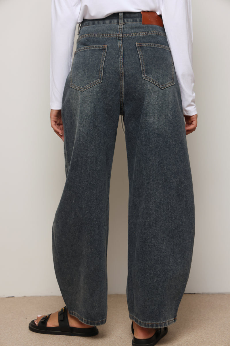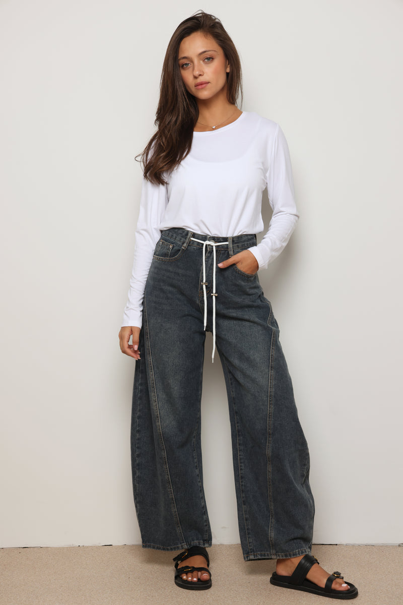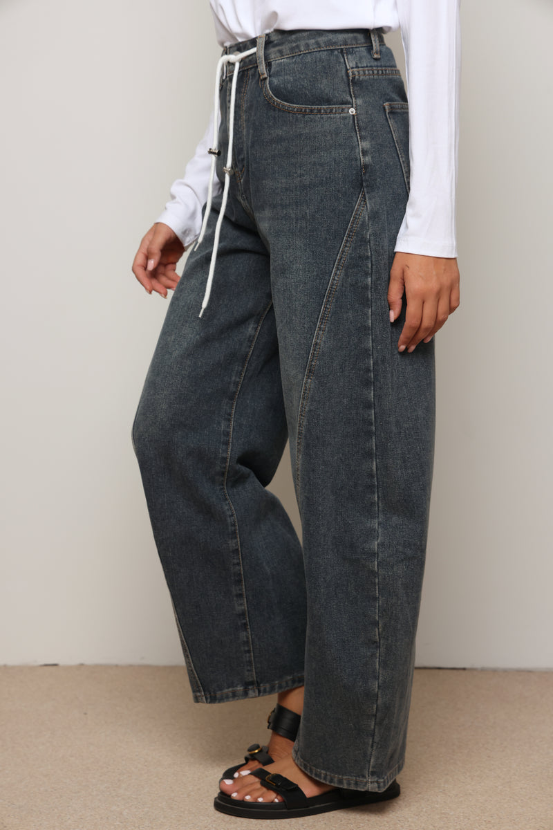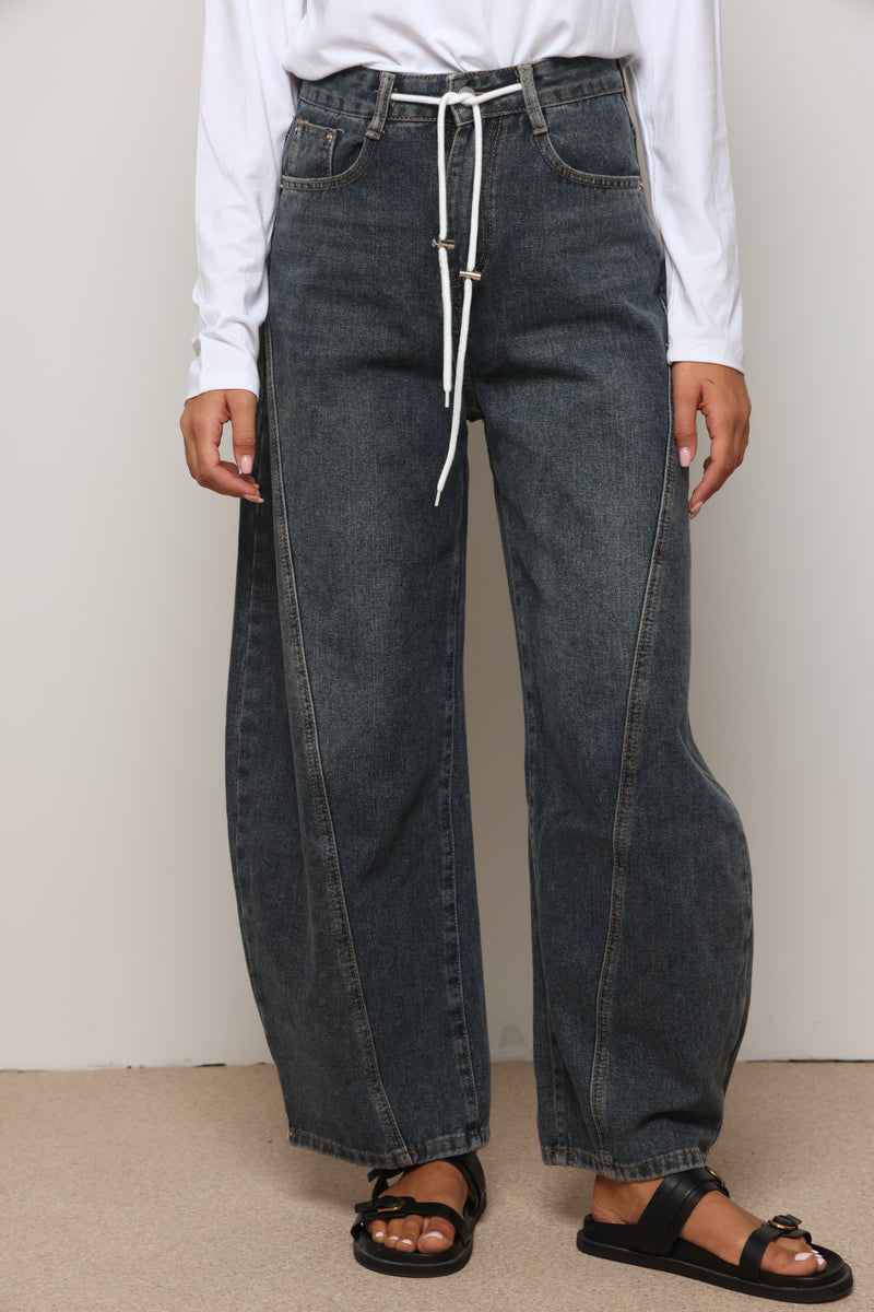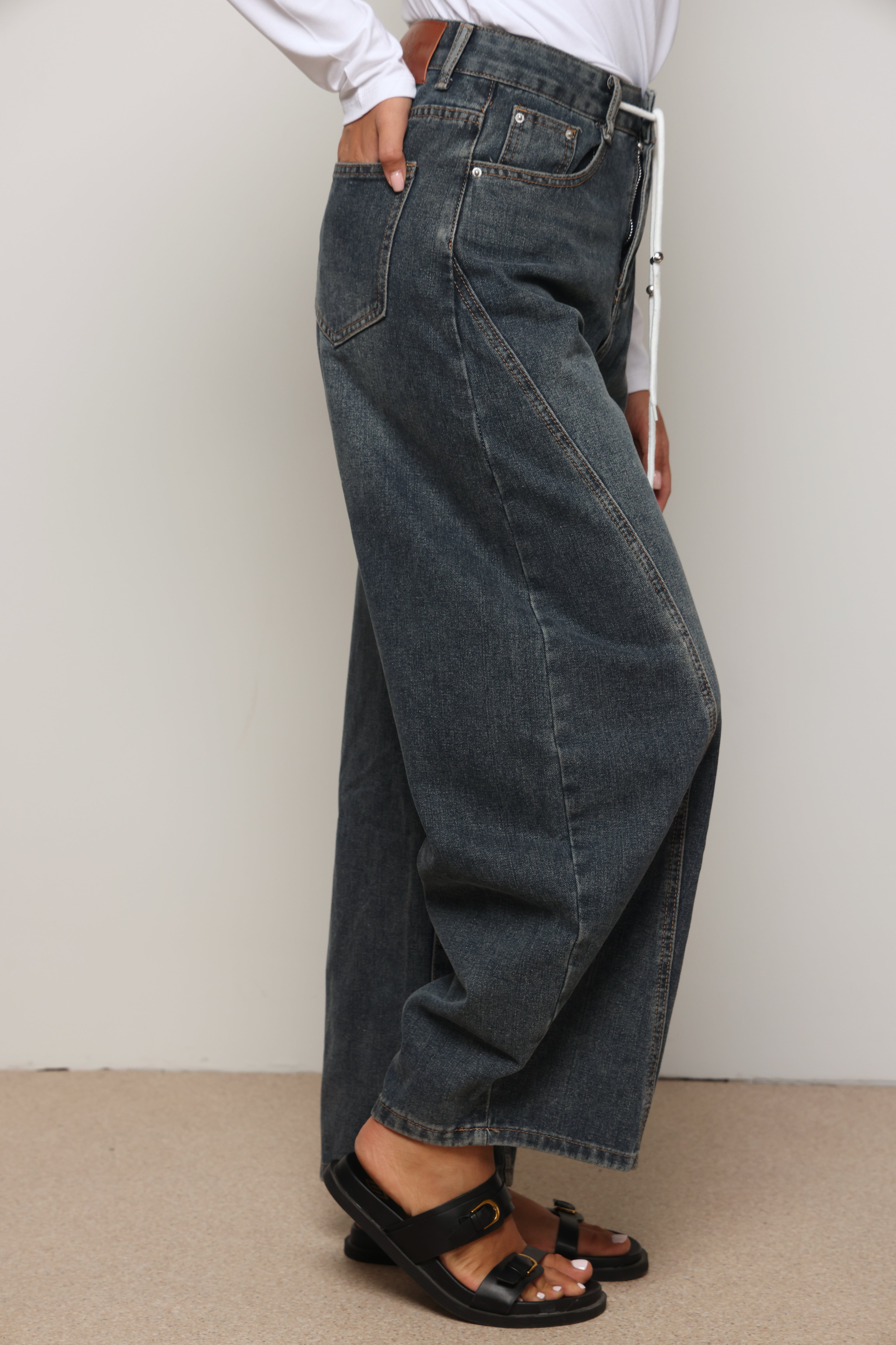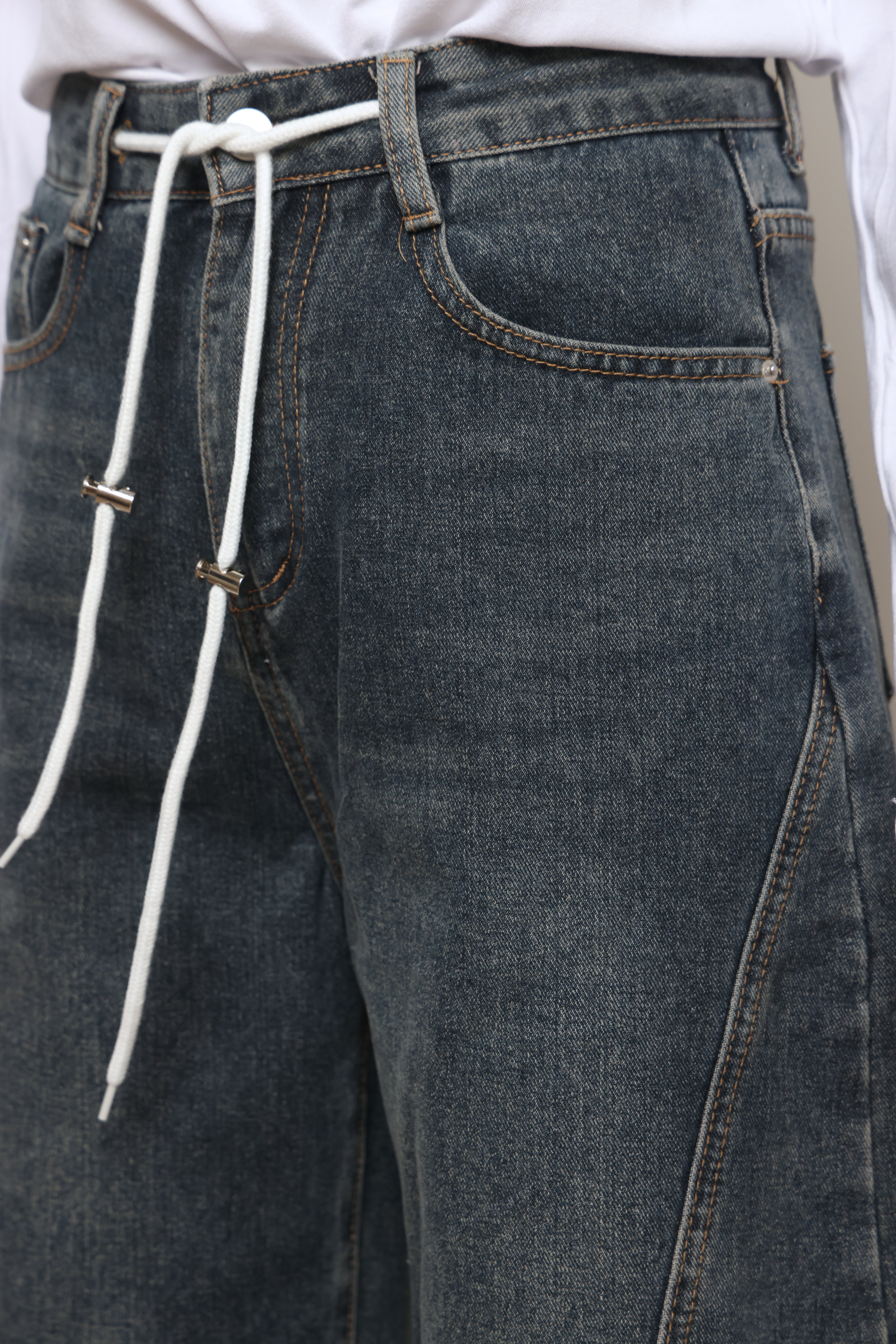 ג'ינס ארוך בסיומת מתרחבת עם כיסים, שרוך קשירה וסגירת כפתור.