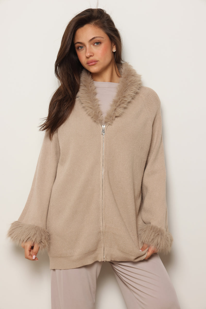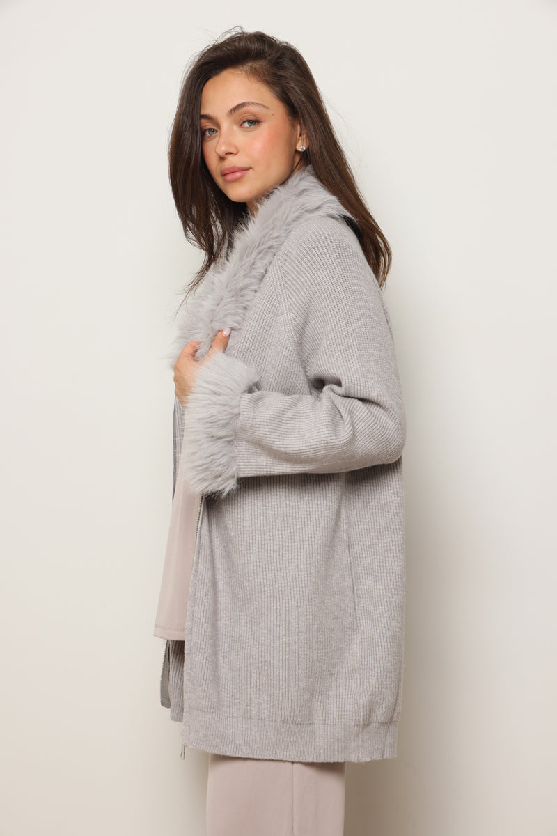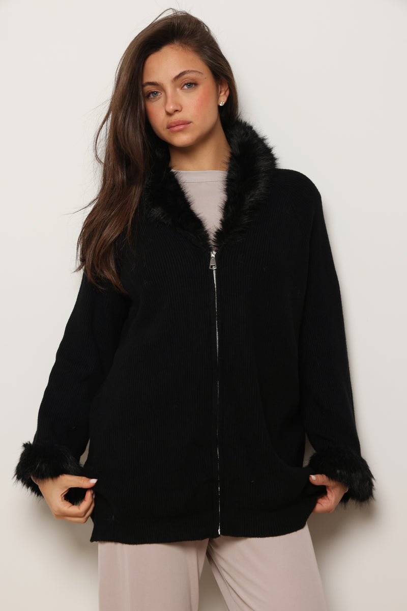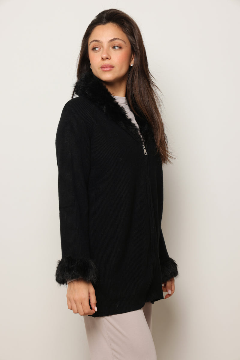 ג'קט מבד סריג במגע רך עם שילובי פרווה ורוכסן קדמי.