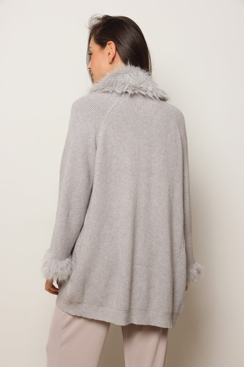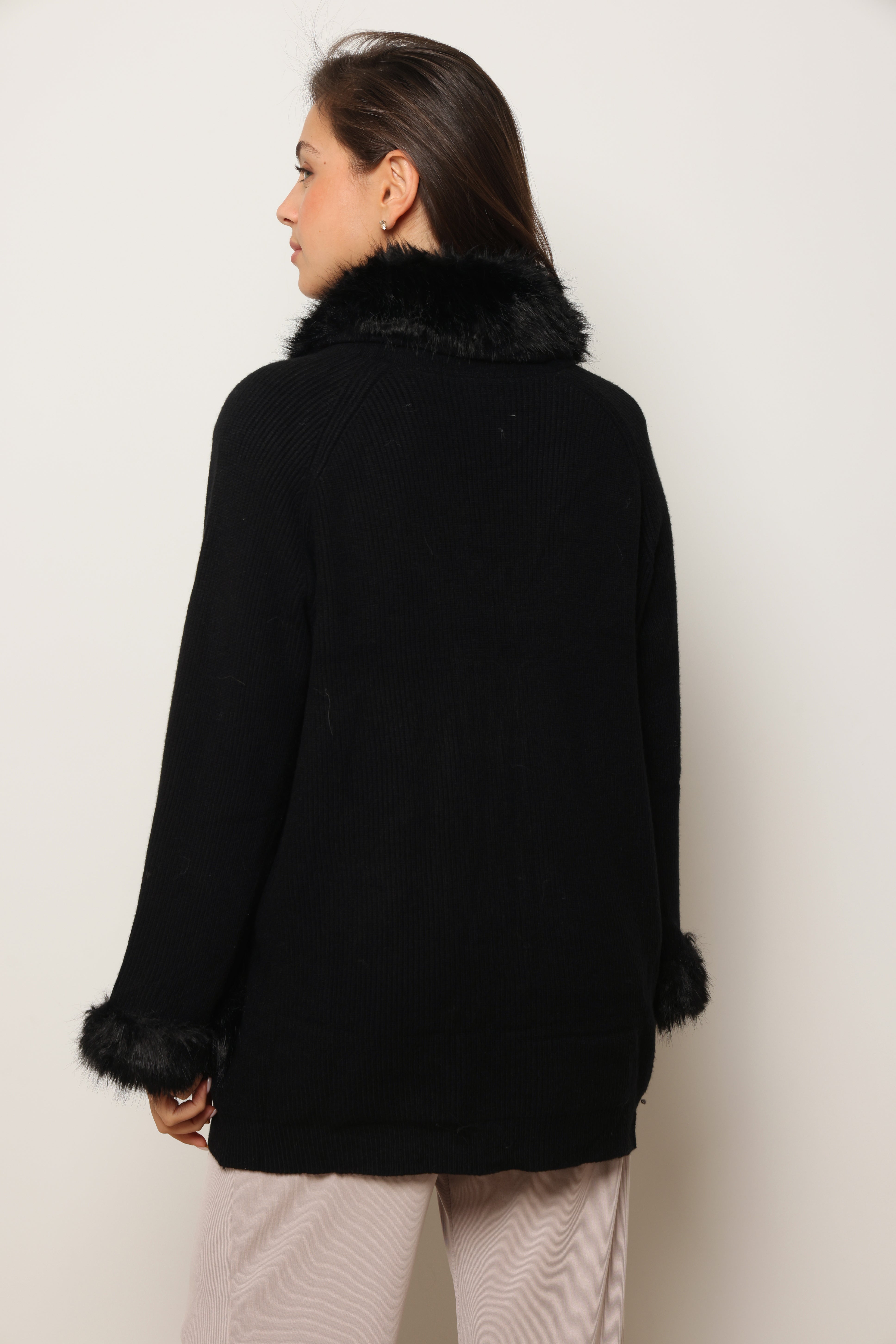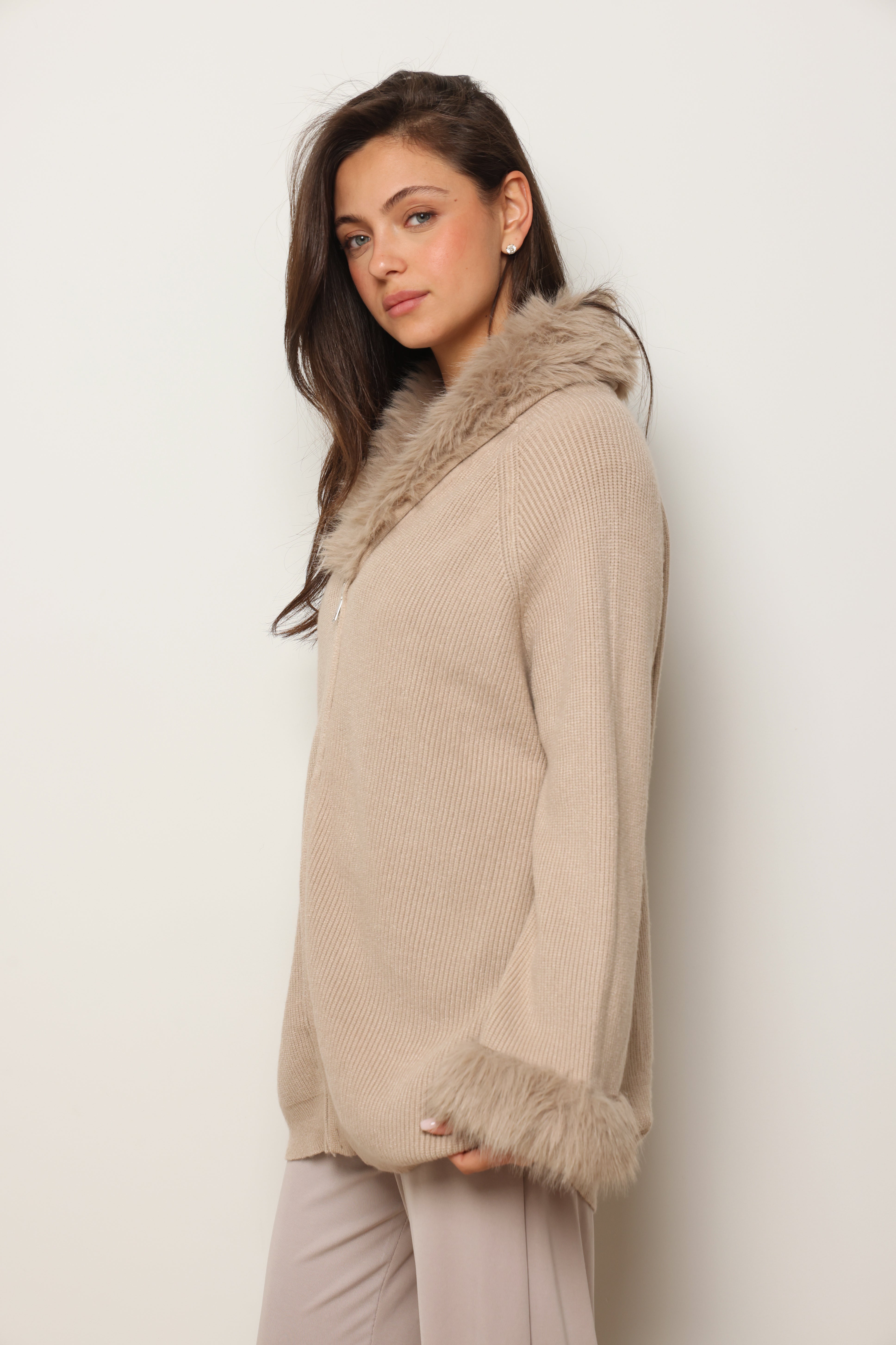 ג'קט מבד סריג במגע רך עם שילובי פרווה ורוכסן קדמי.