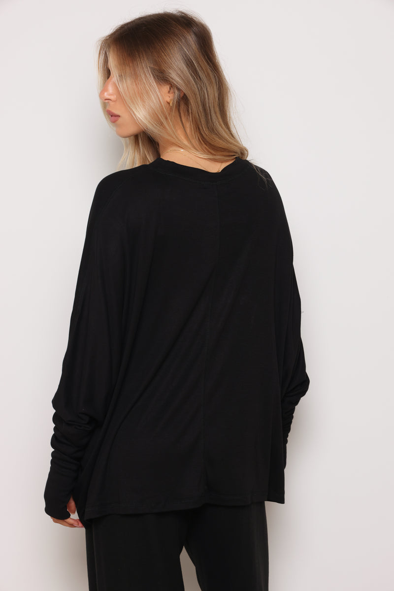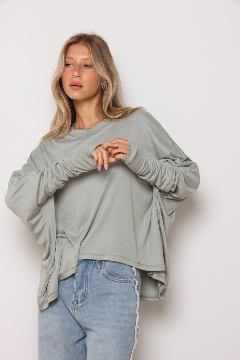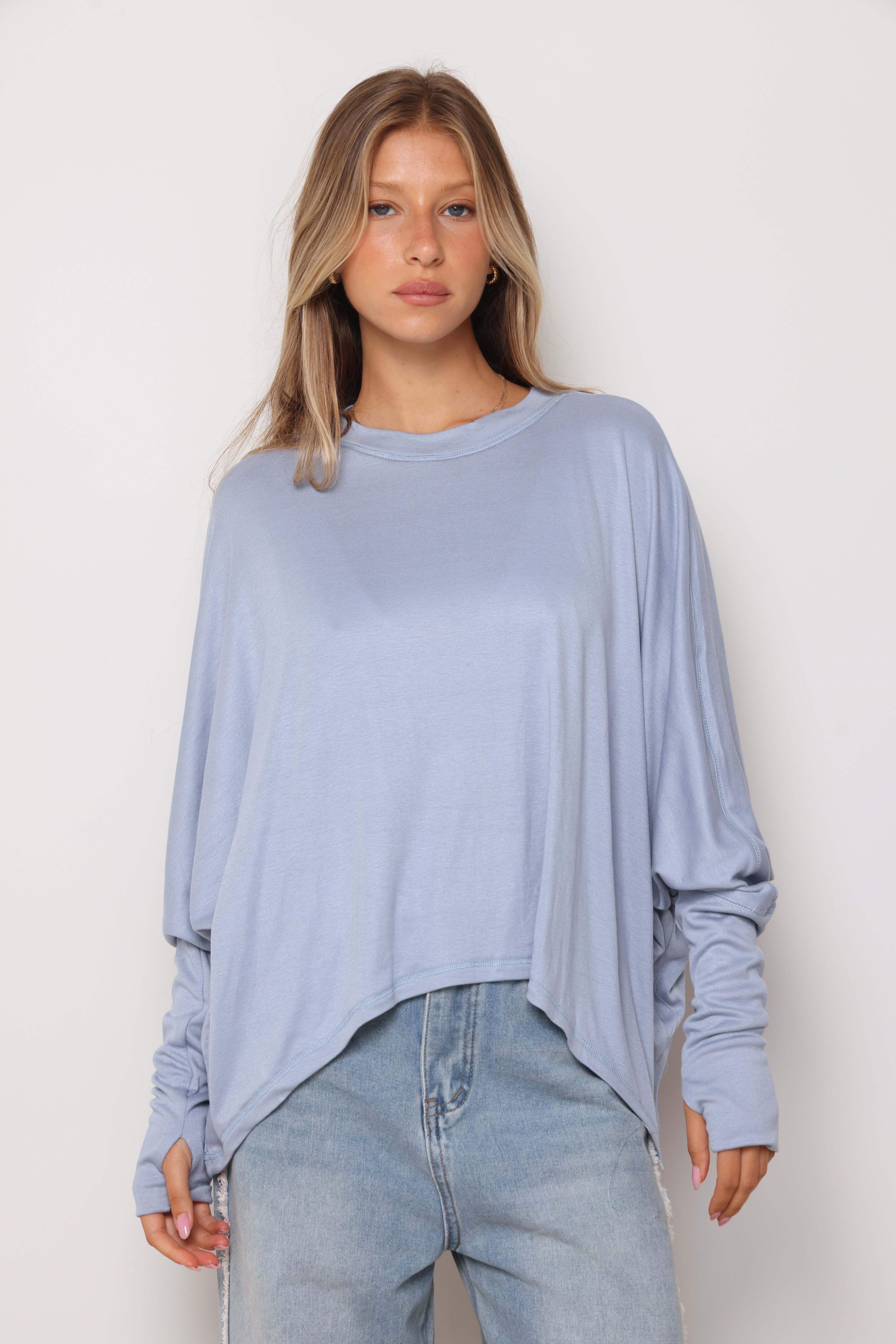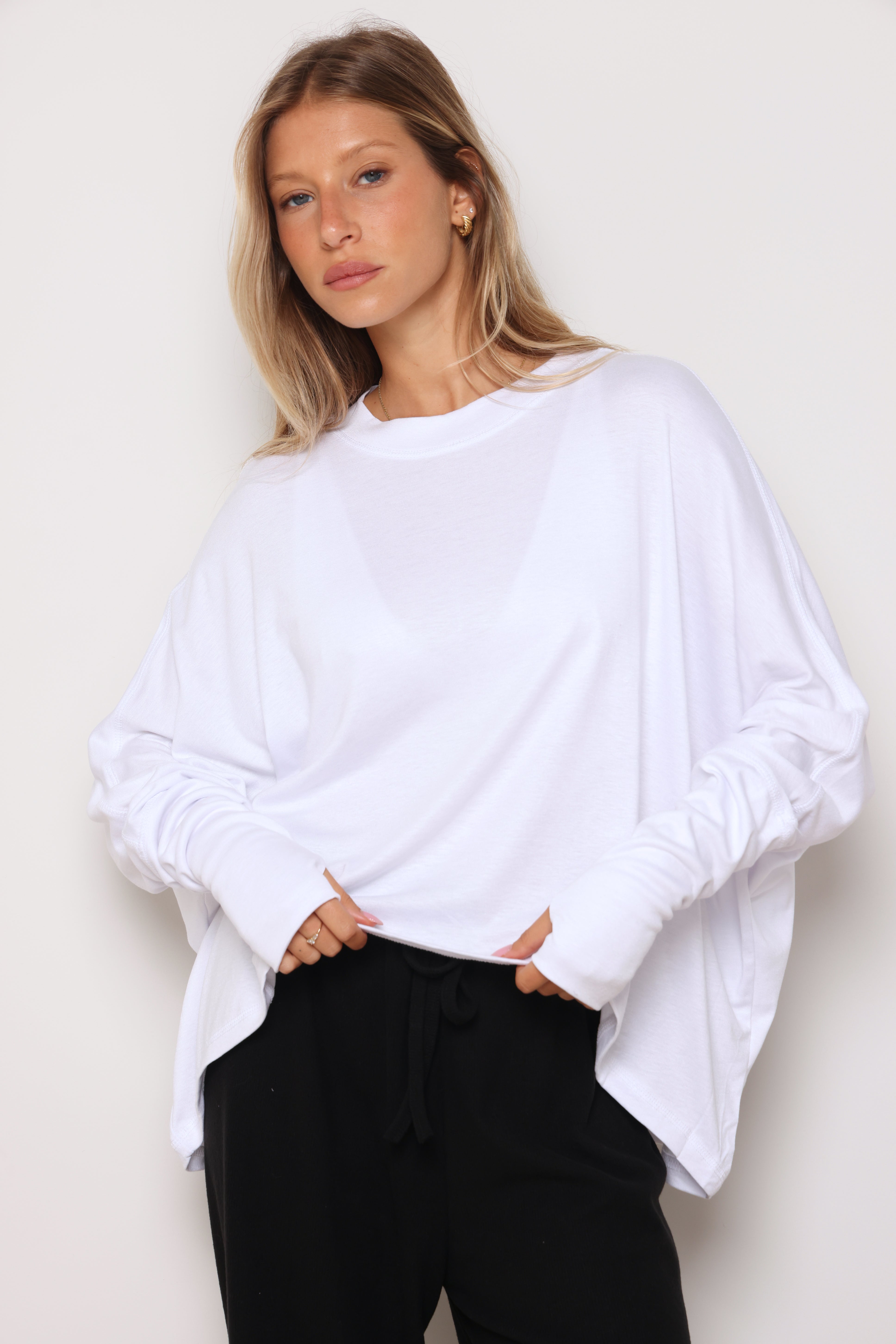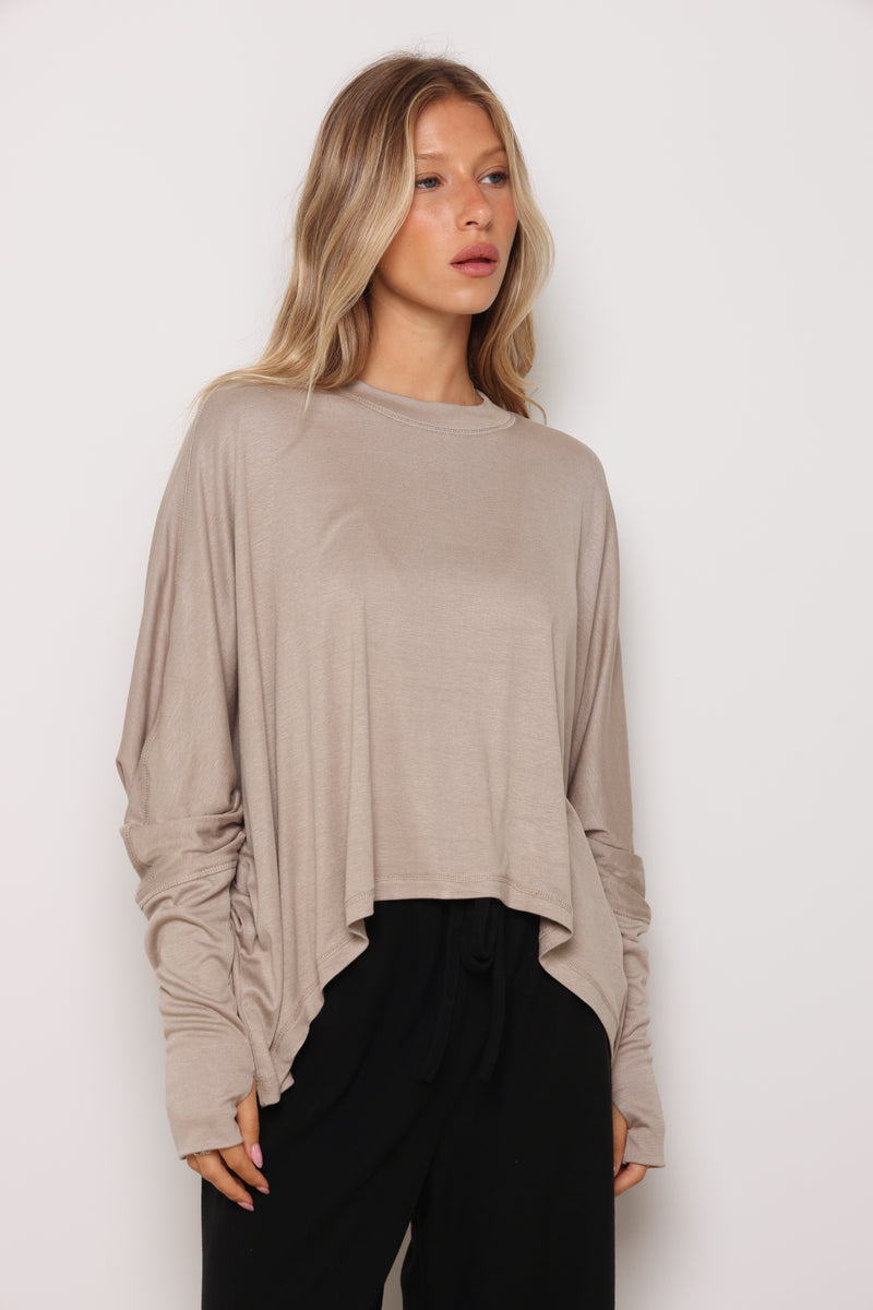 חולצת בייסיק מבד כותנה במגע רך בגזרת עטלף קרופ עם מנג'ט ארוך בסיומת וכפפה.