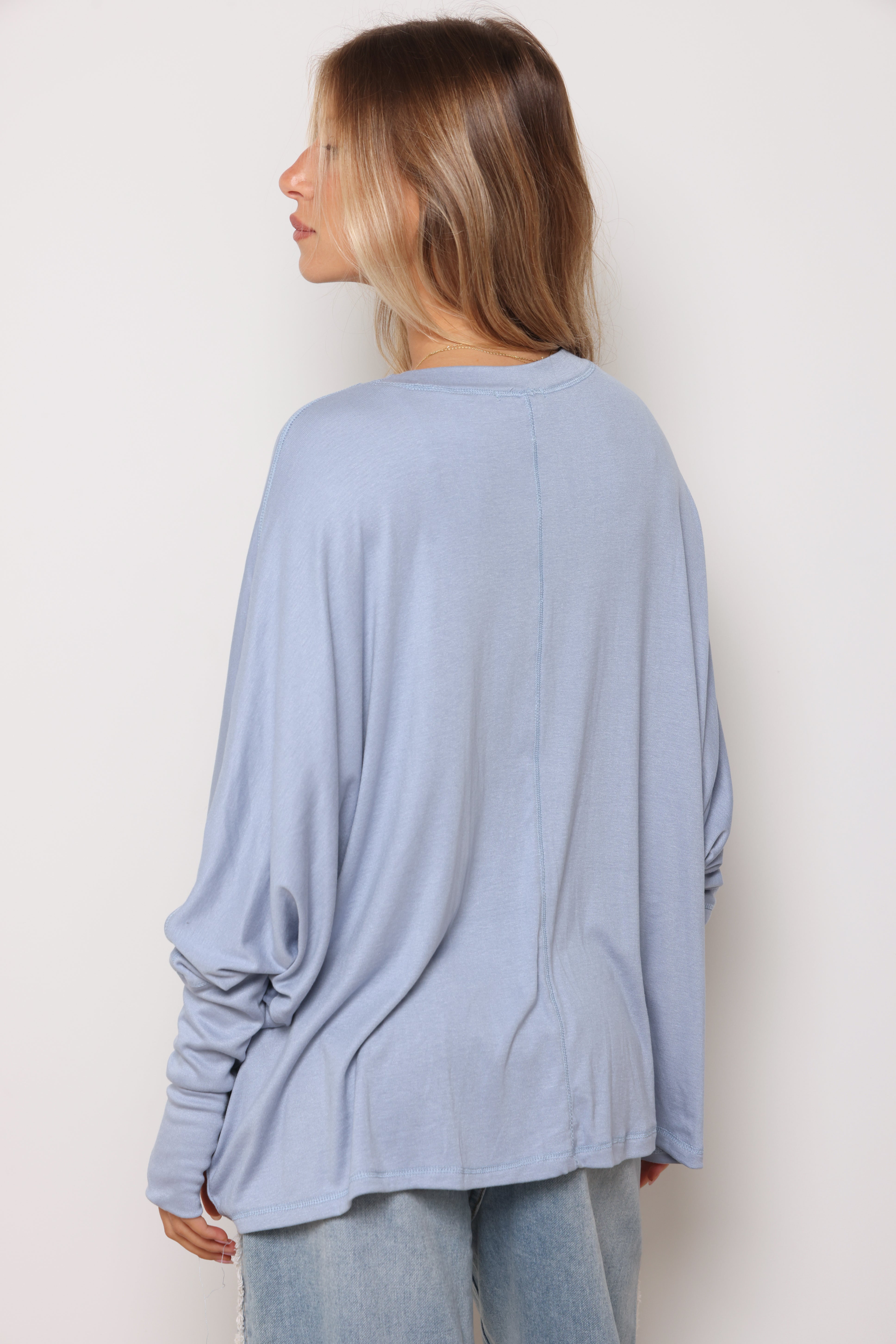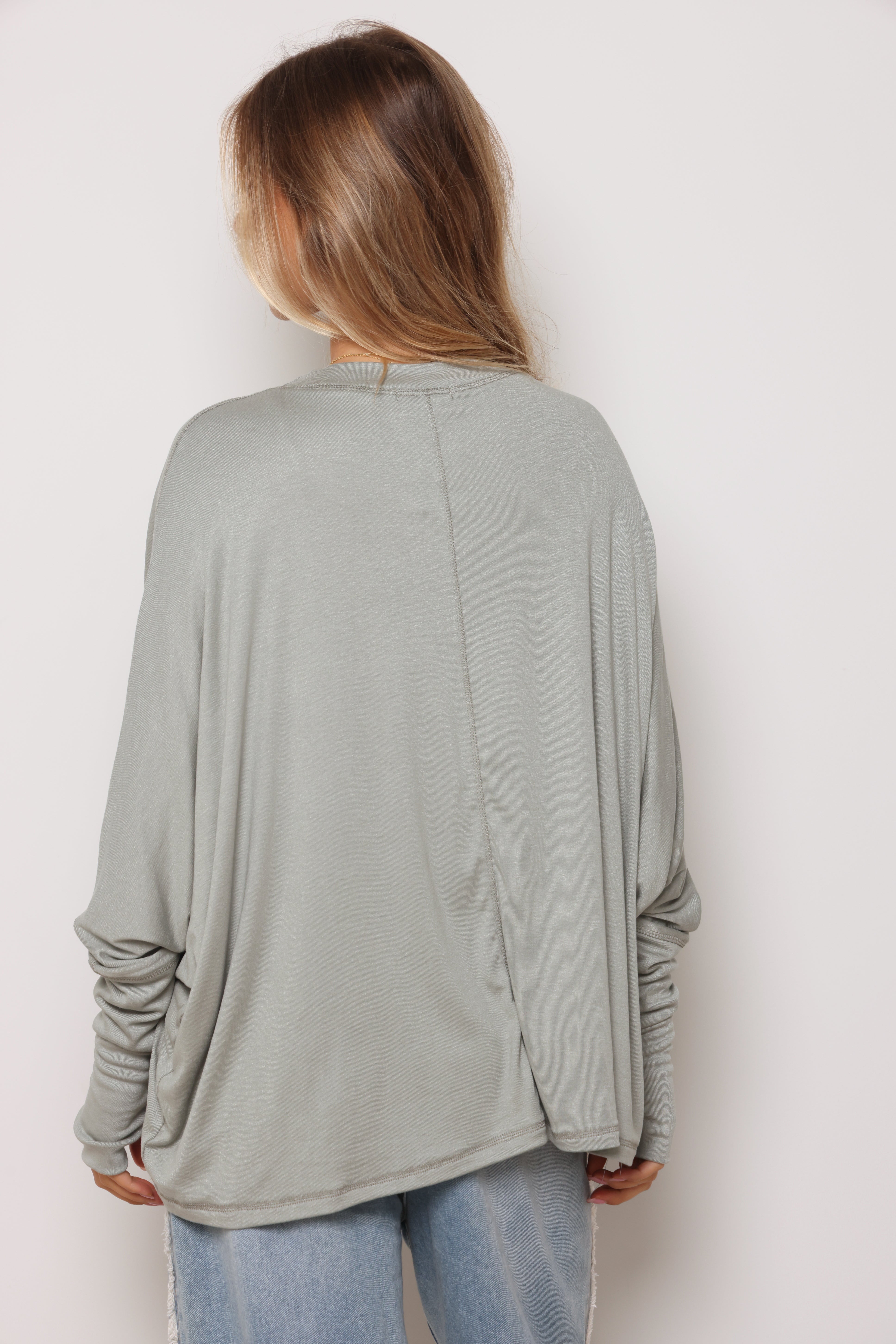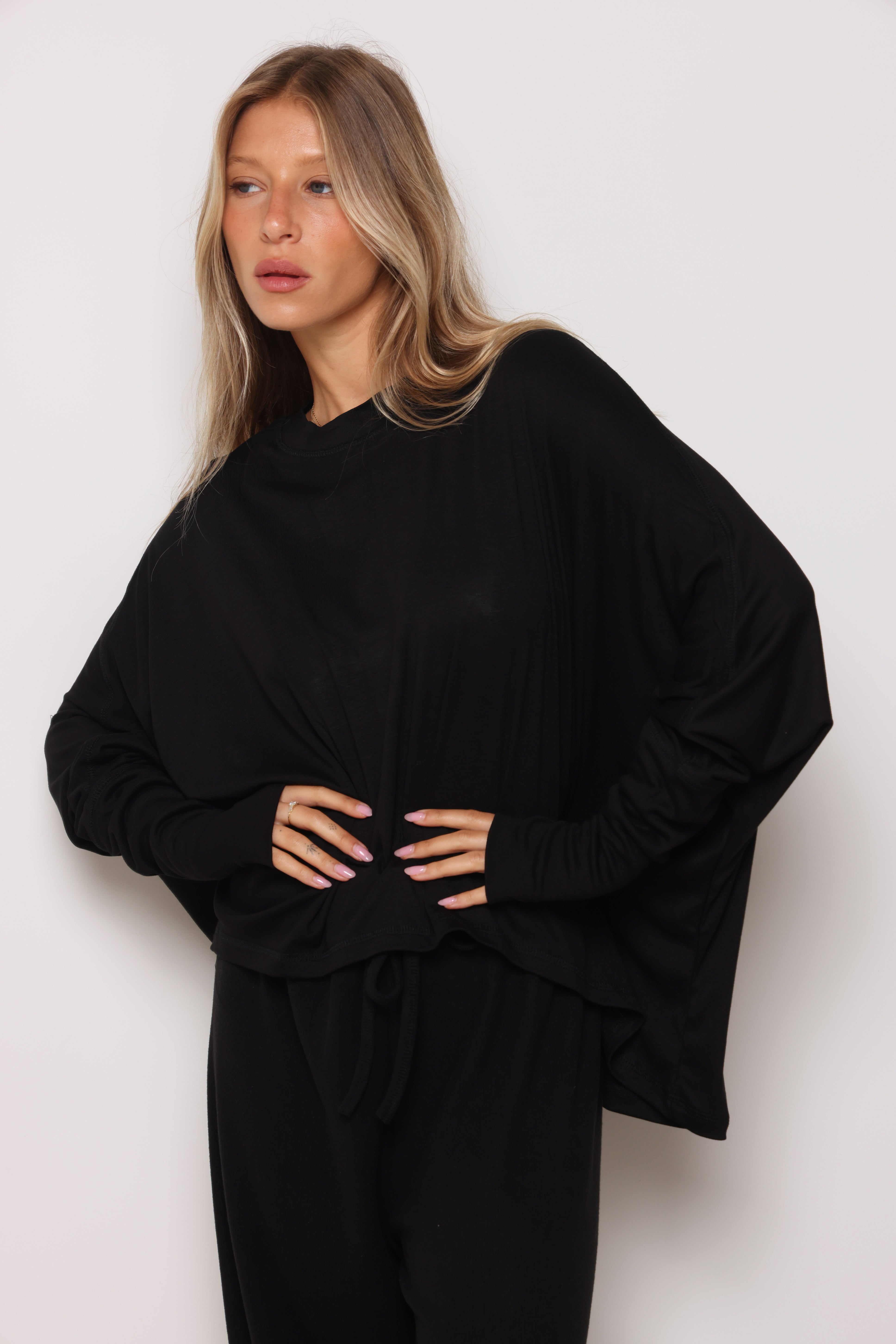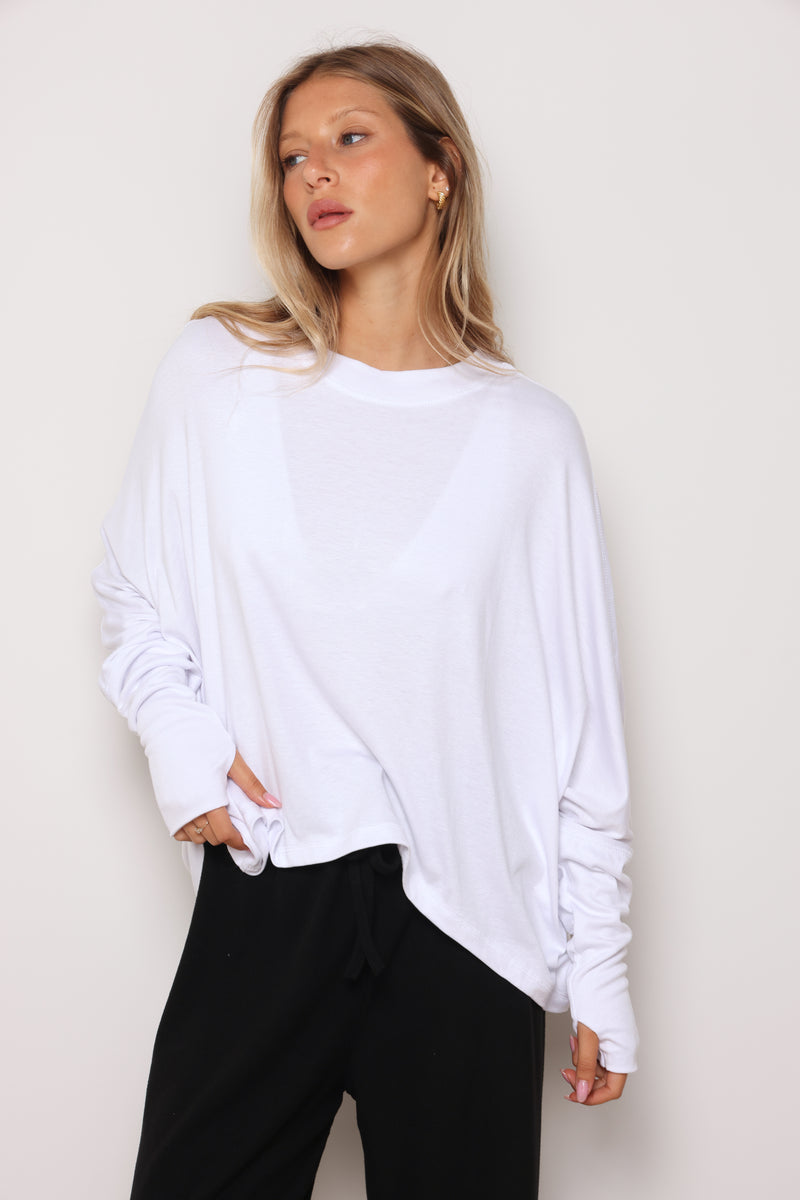 חולצת בייסיק מבד כותנה במגע רך בגזרת עטלף קרופ עם מנג'ט ארוך בסיומת וכפפה.