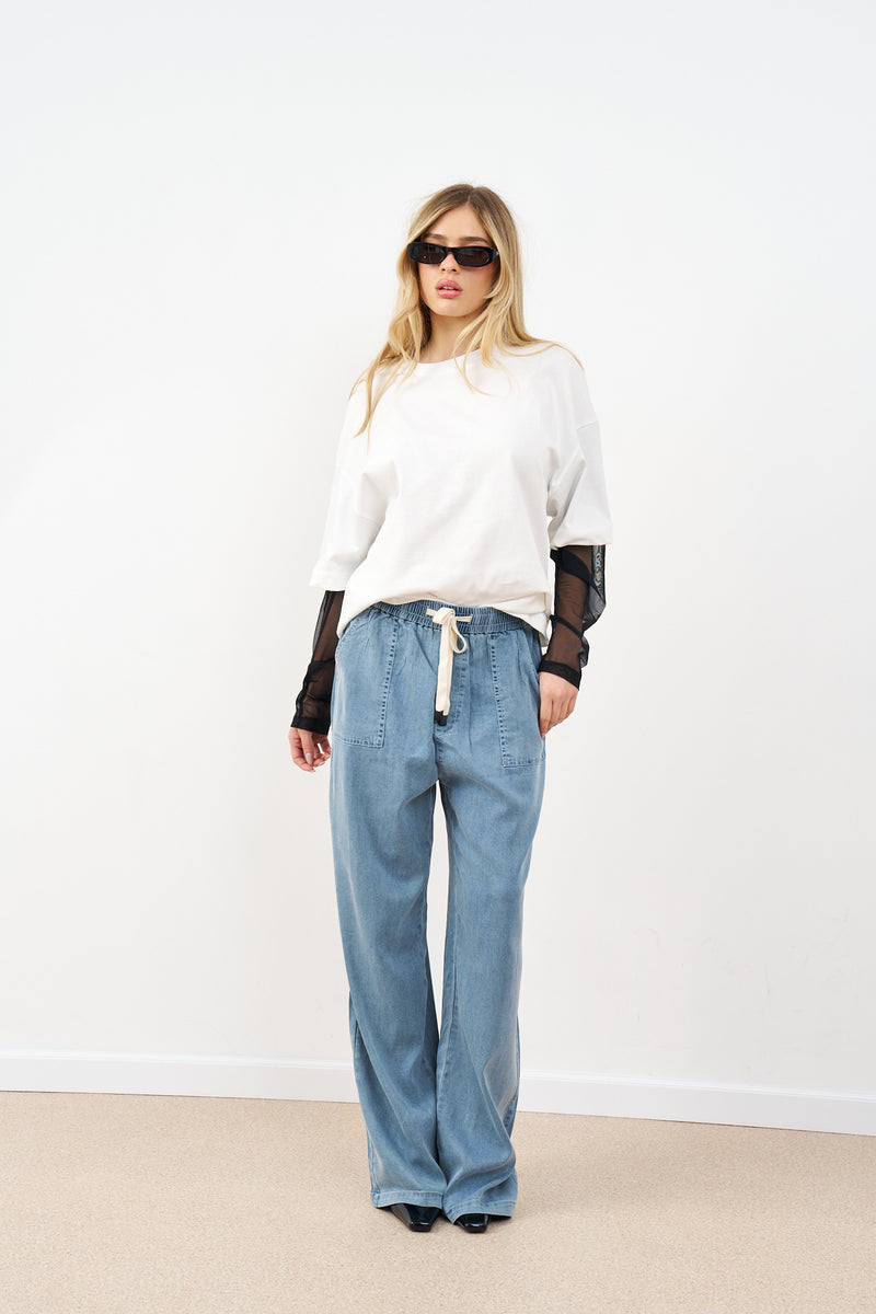 חולצת אוברסייז מחמיאה המשלבת בין לוק נקי לחגיגי, בשילוב מפתח צוואר עגול ושרוולי שיפון.