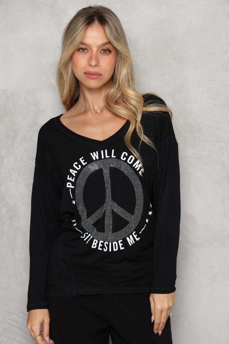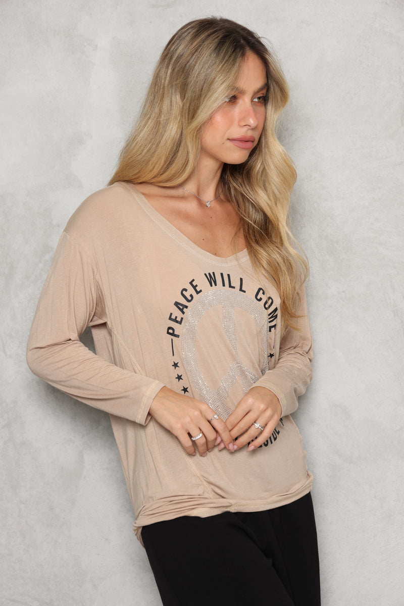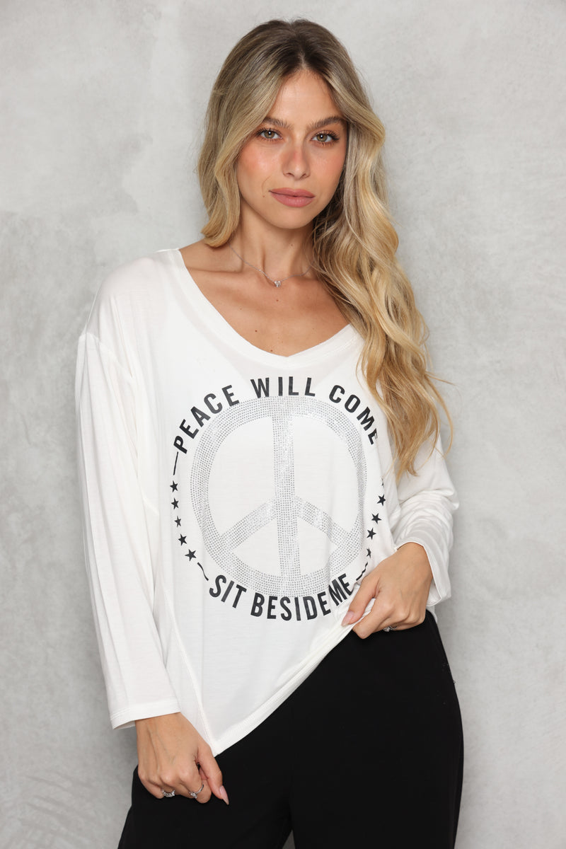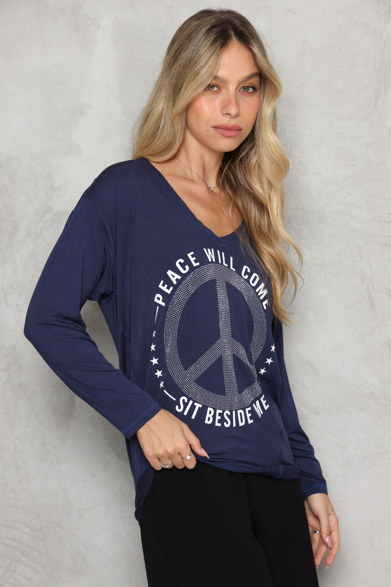 חולצת וי מבד סימפוניה במגע רך עם דפוס פיס.