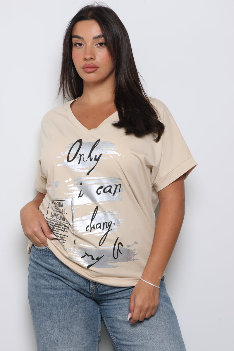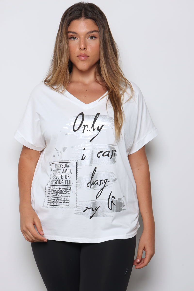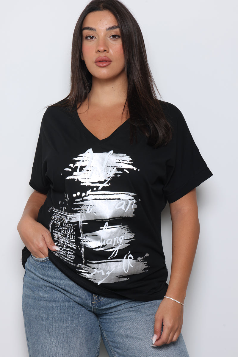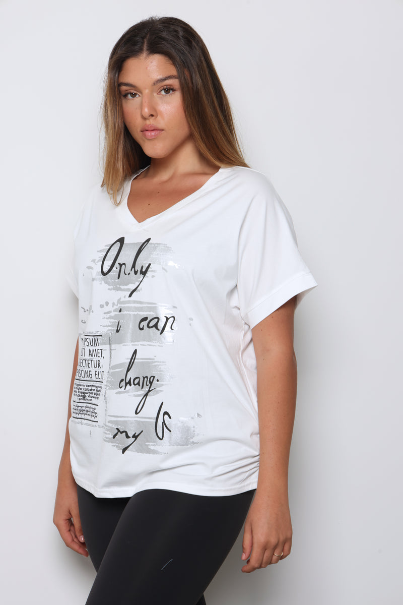 חולצת פלאס מבד כותנה לייקרה עם צווארון וי ודפוס קדמי.