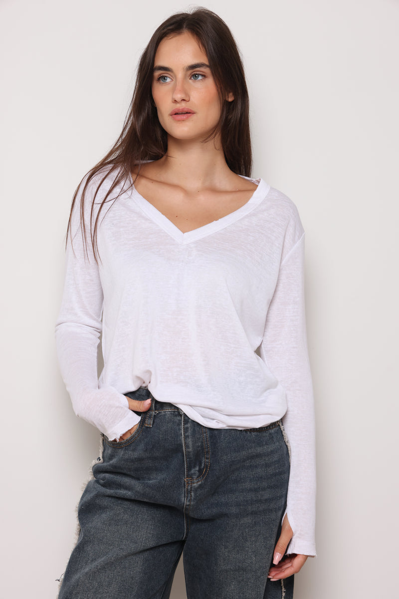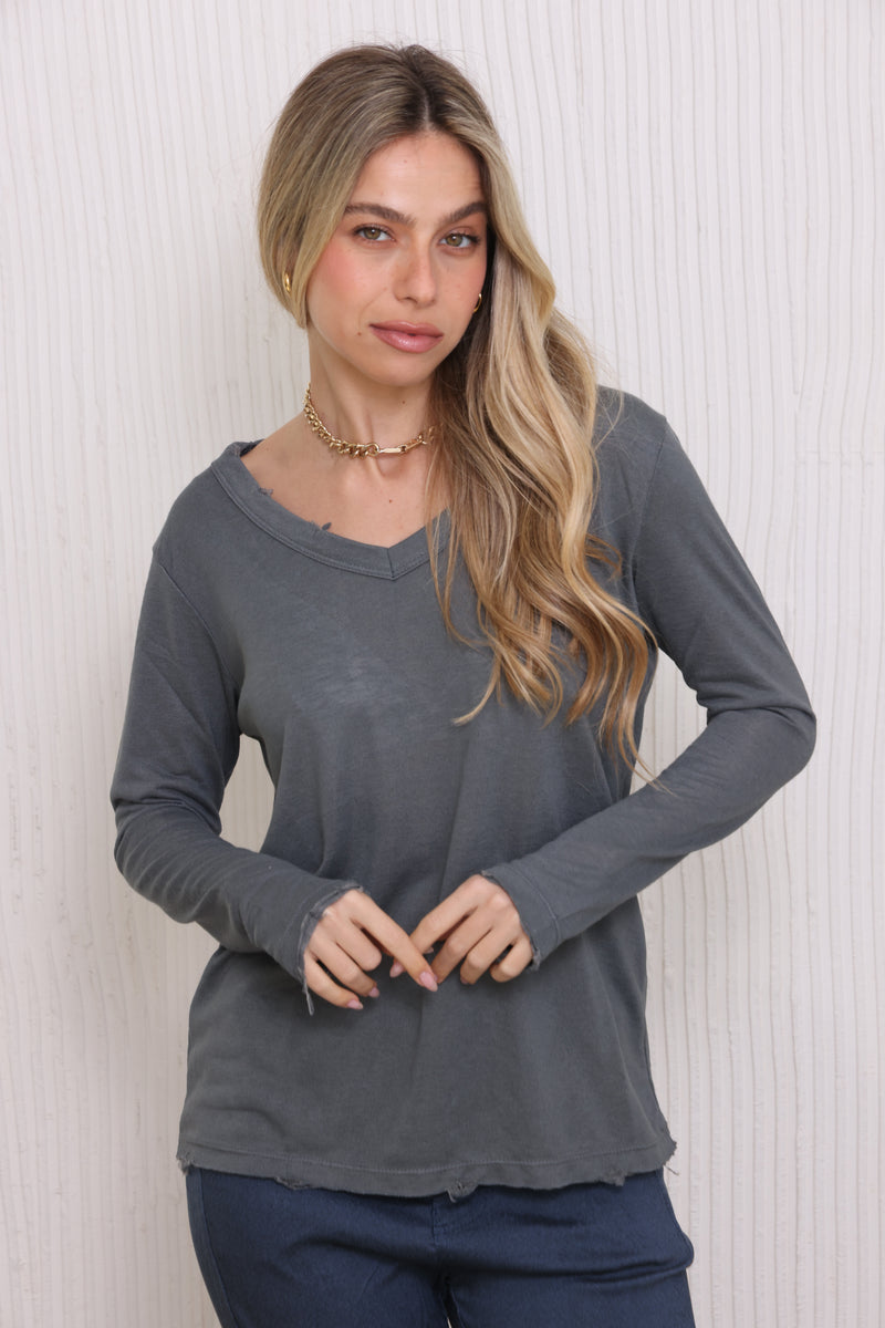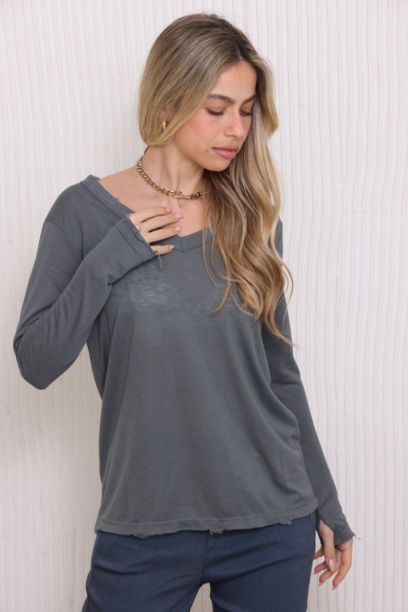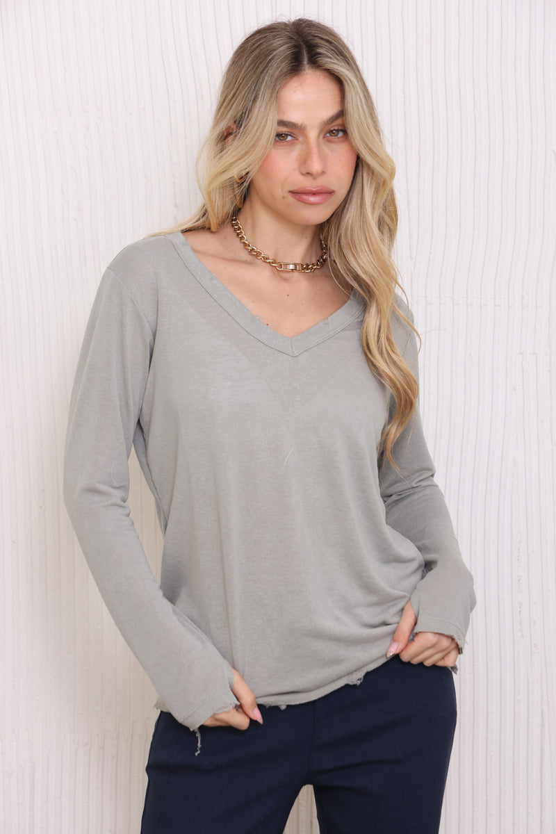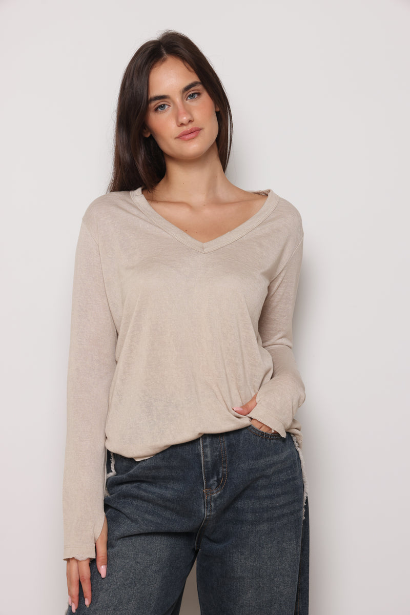 חולצת בייסיק מבד פשתן סלאב בעלת צווארון וי וקרעים,שרוולים ארוכים שמקפיצים את הפיס לשיא הסטייל והשיק !