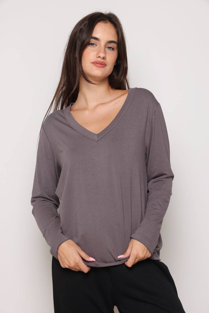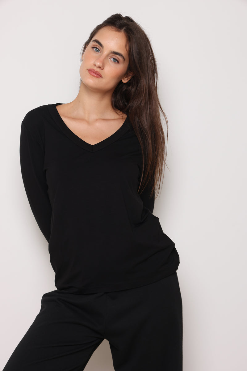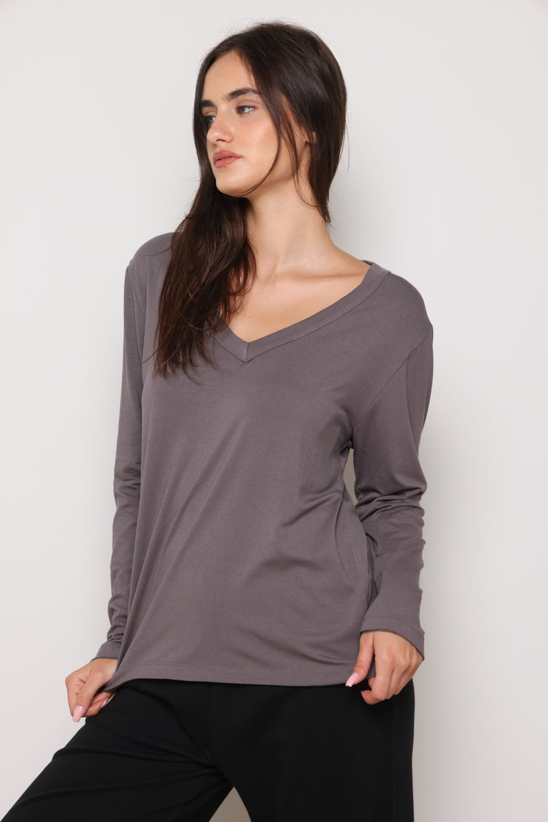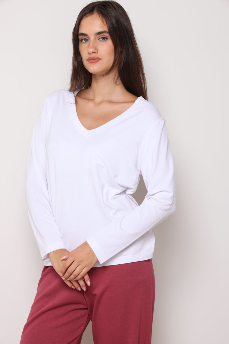 חולצת בייסיק מבד סימפוניה כותנה במגע רך בגזרה ישרה עם צווארון וי עבה.