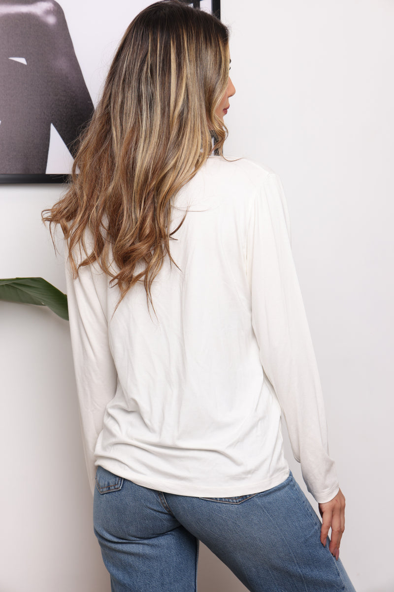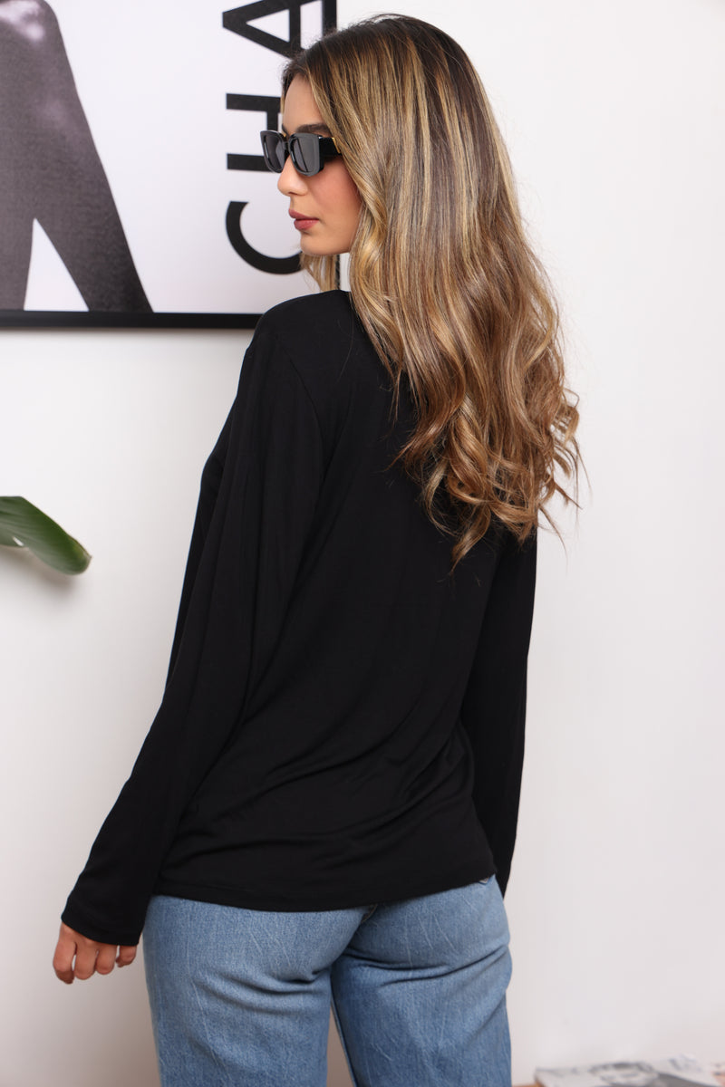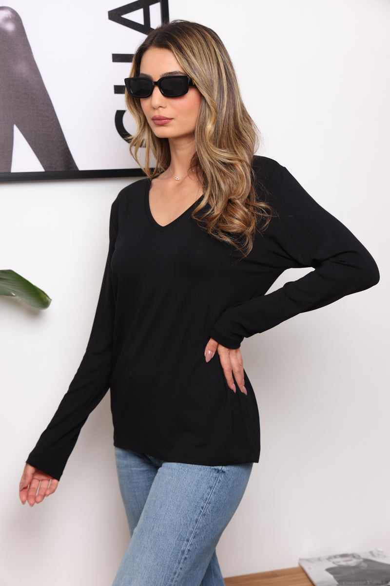 הבייסיק הכי מאסט שכל אישה צריכה בארון ! טי-שירט מבד סימפוניה עם שרוולים ארוכים וצווארון וי.