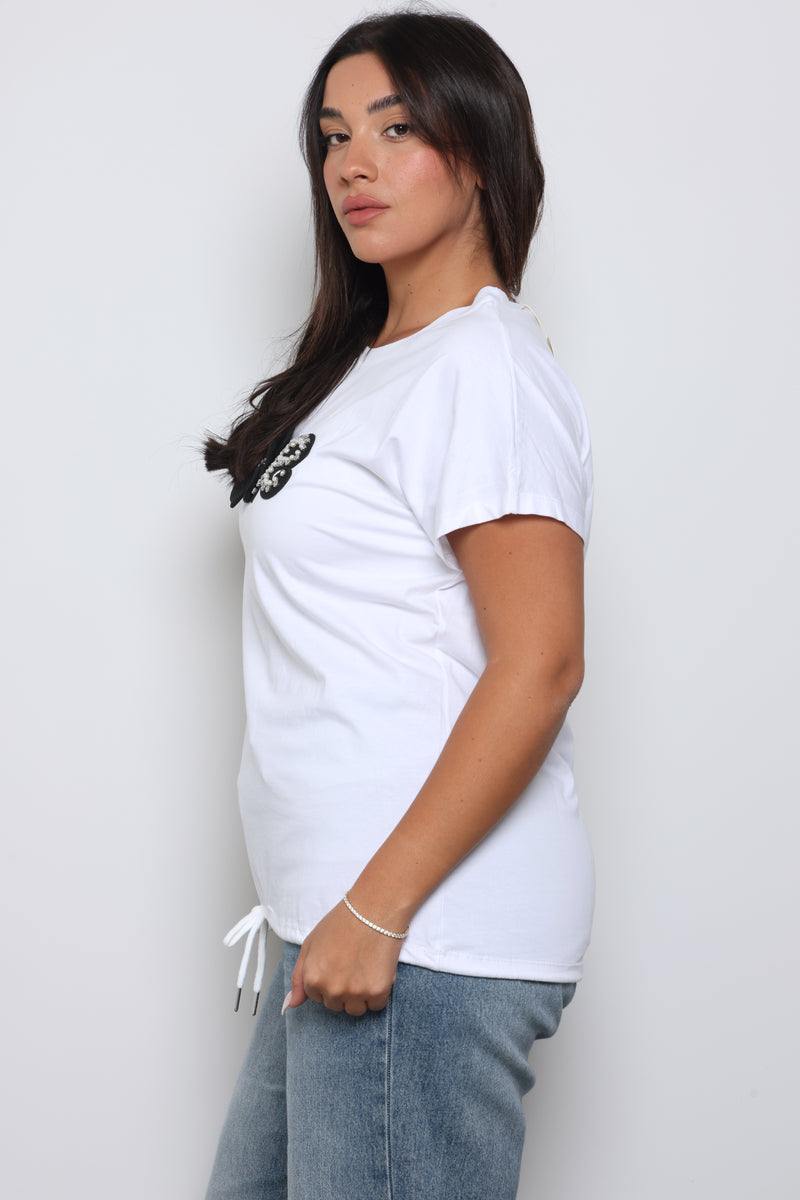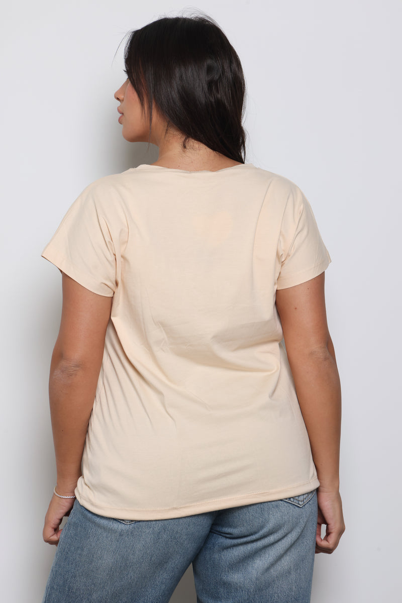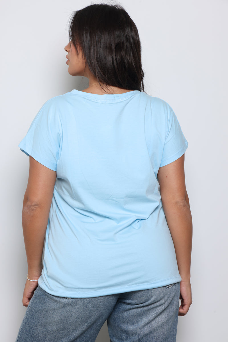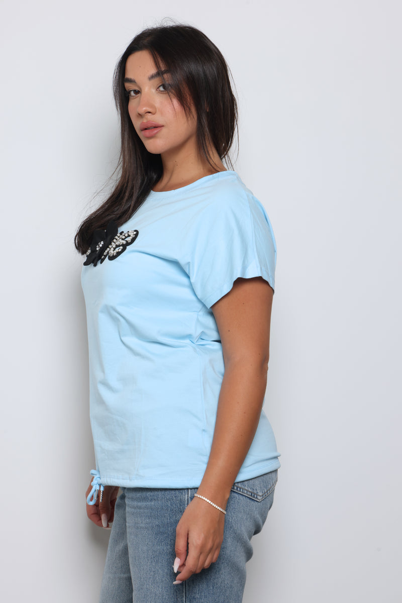 החולצה עם צווארון עגול ושרוולים קצרים.
