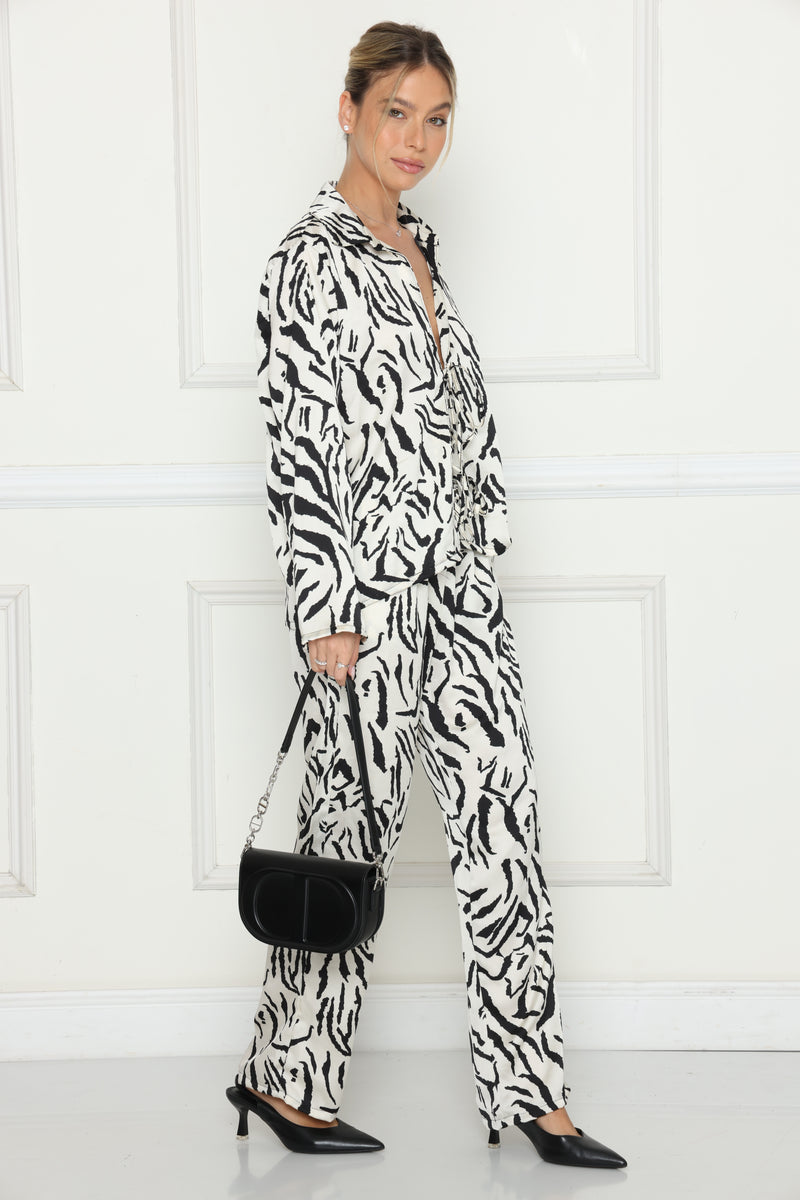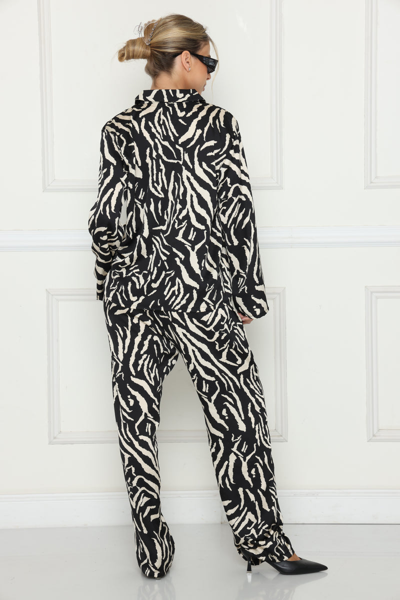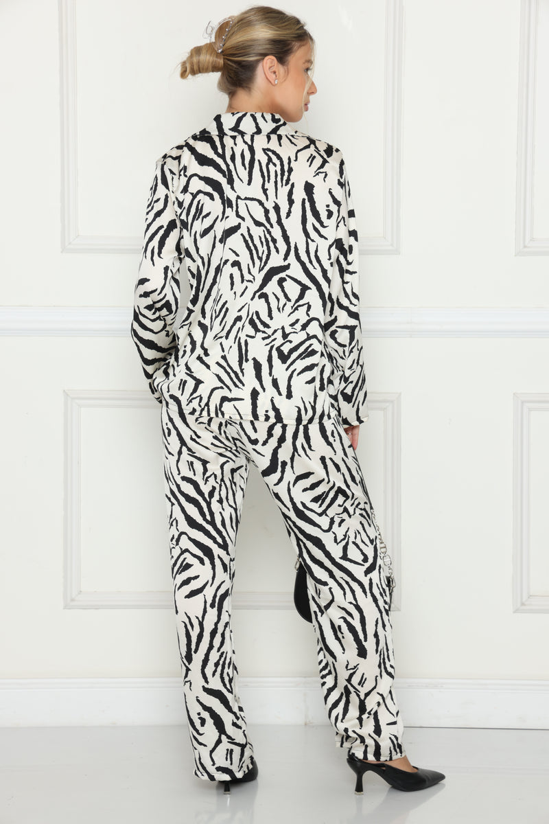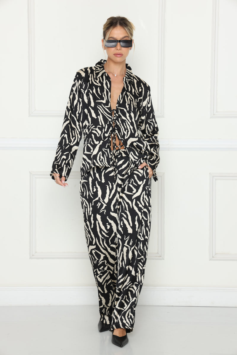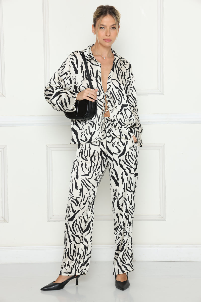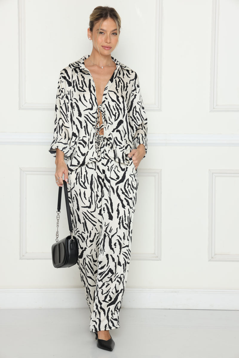 חליפת קשירות מבד סאטן אלגנטי עם מכנסיים מתרחבים,מותן אלסטית עם שרוך קשירה וצמד כיסים צדדיים.