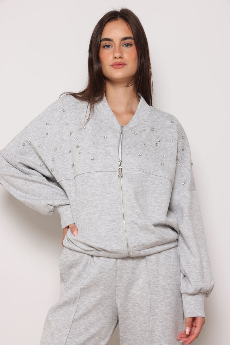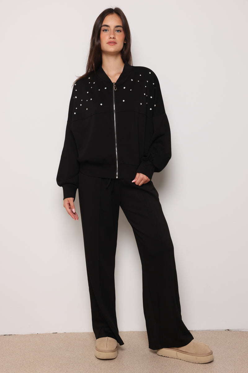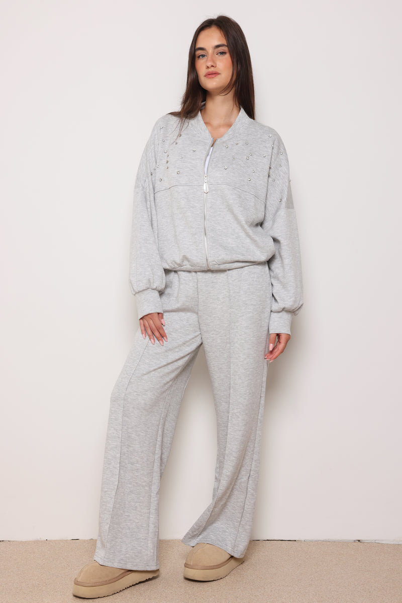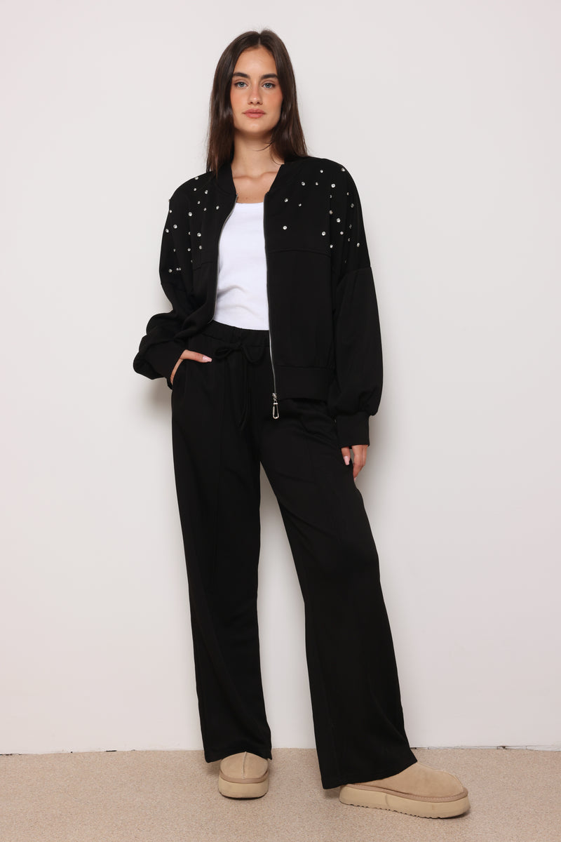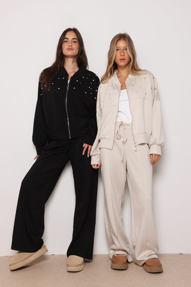 חליפה מבד ג'רסי לייקרה סופר נעים בשילוב אבנים בפרונט ורוכסן קדמי.