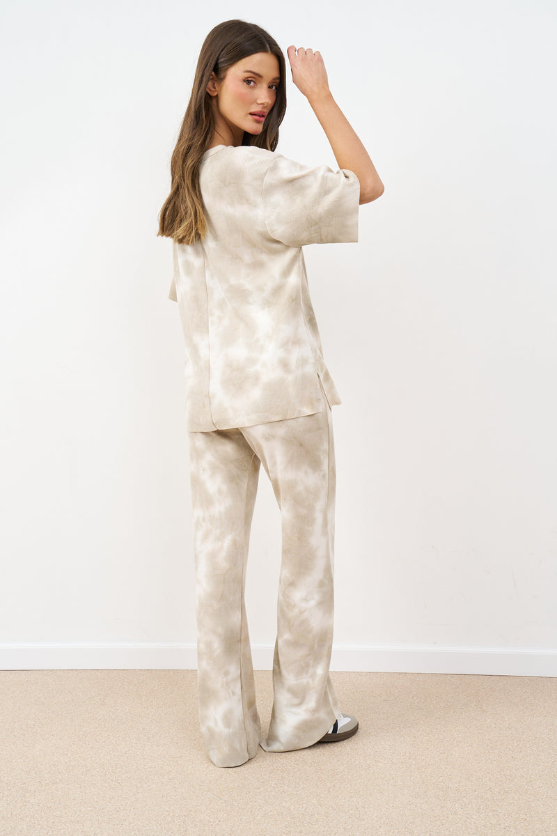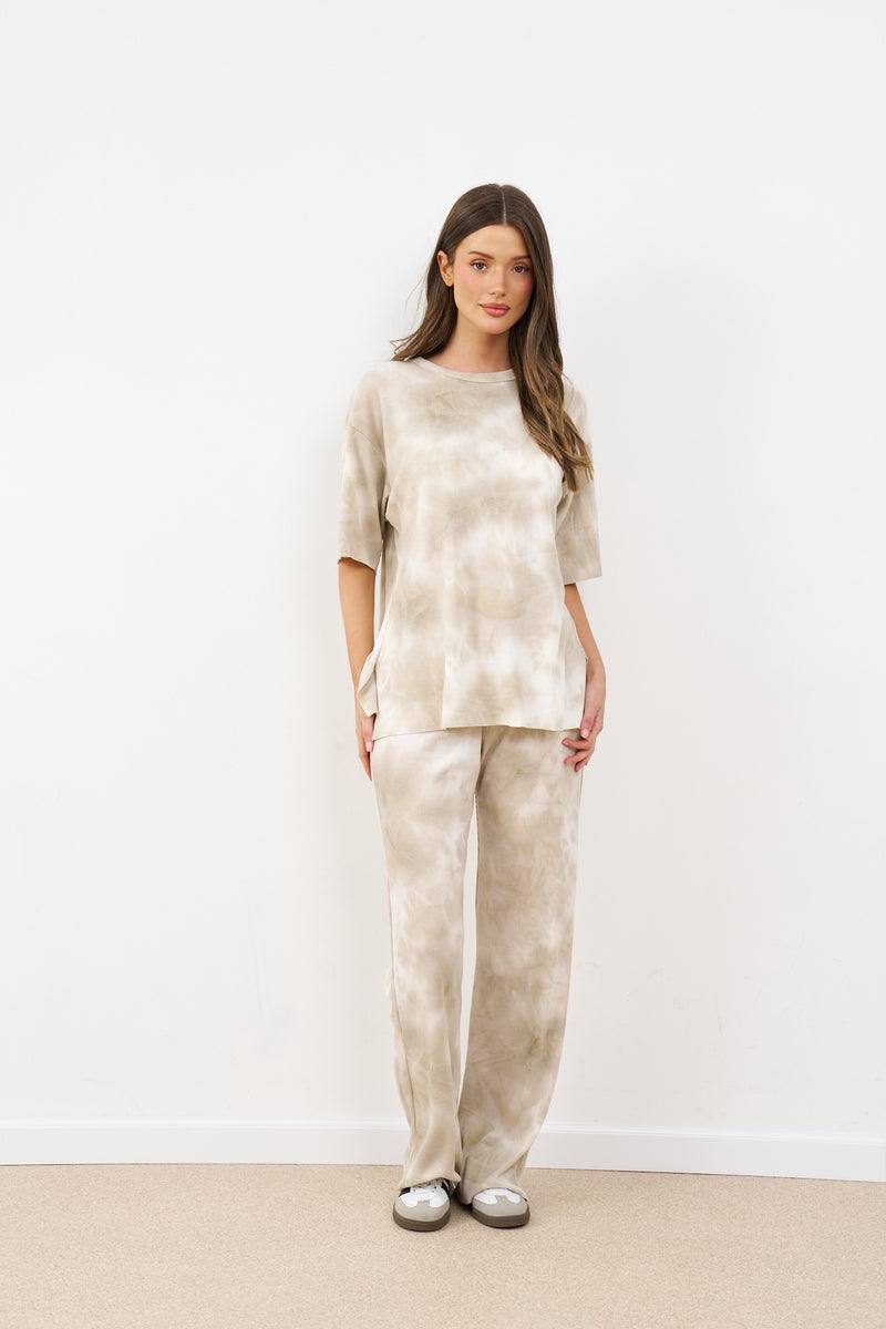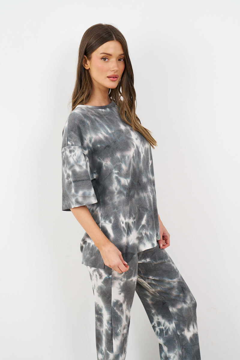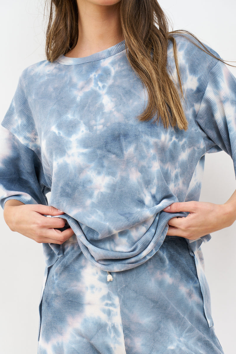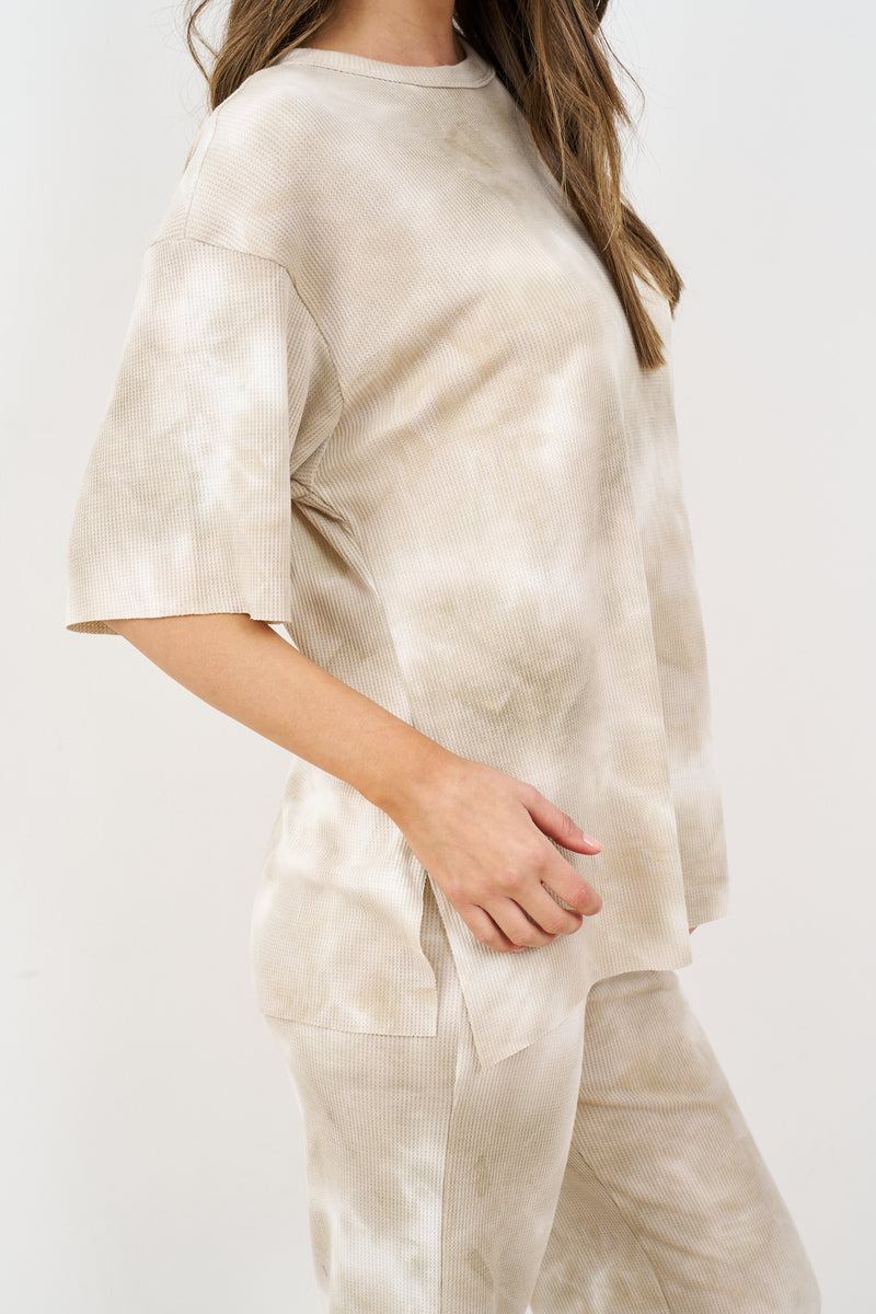 סט קזואל מבד וופל טיידי עם צווארון עגול, שרוולים קצרים ומכנסיים מתרחבים עם גומי במותן ושרוך קשירה.