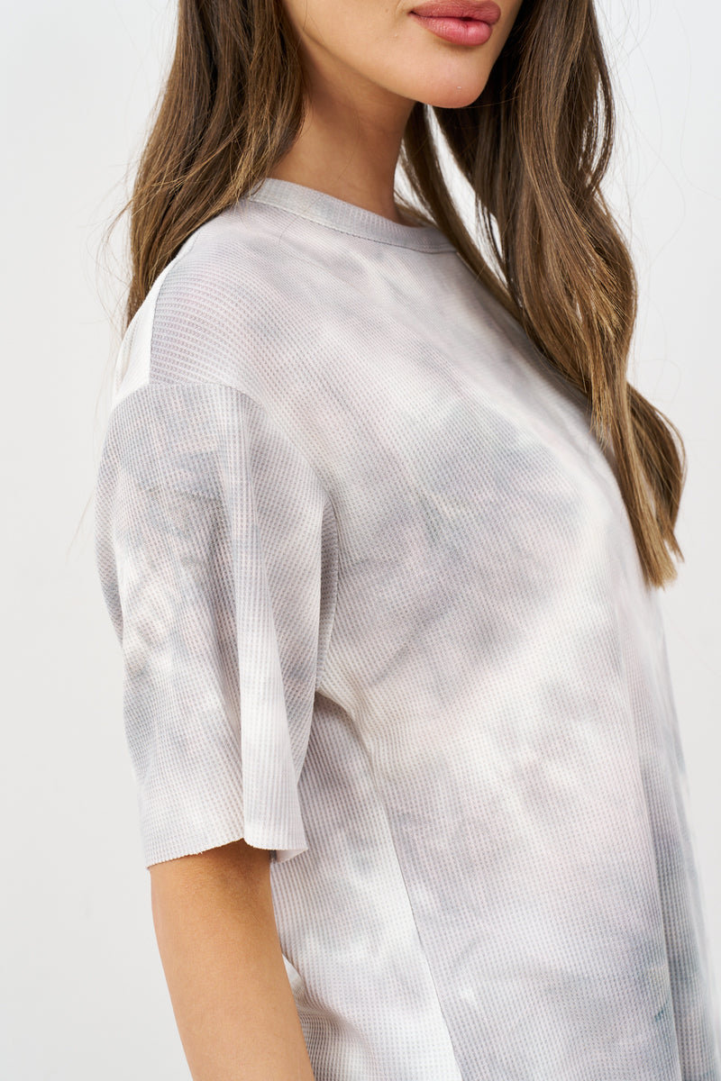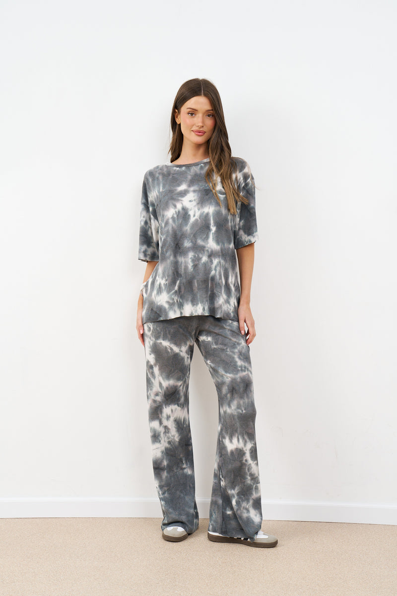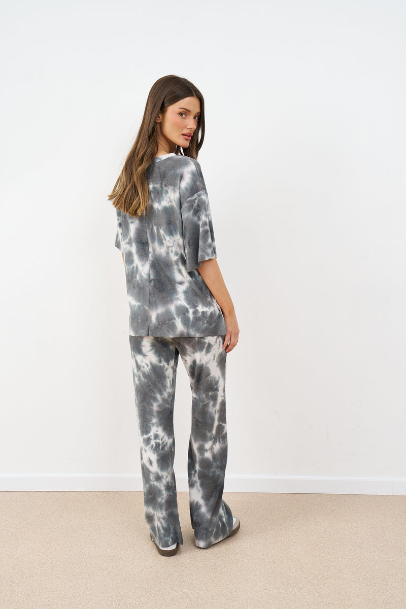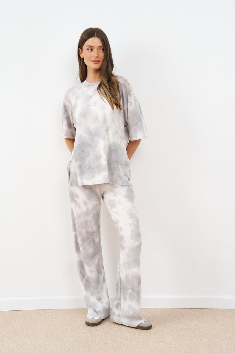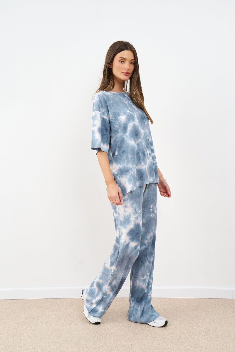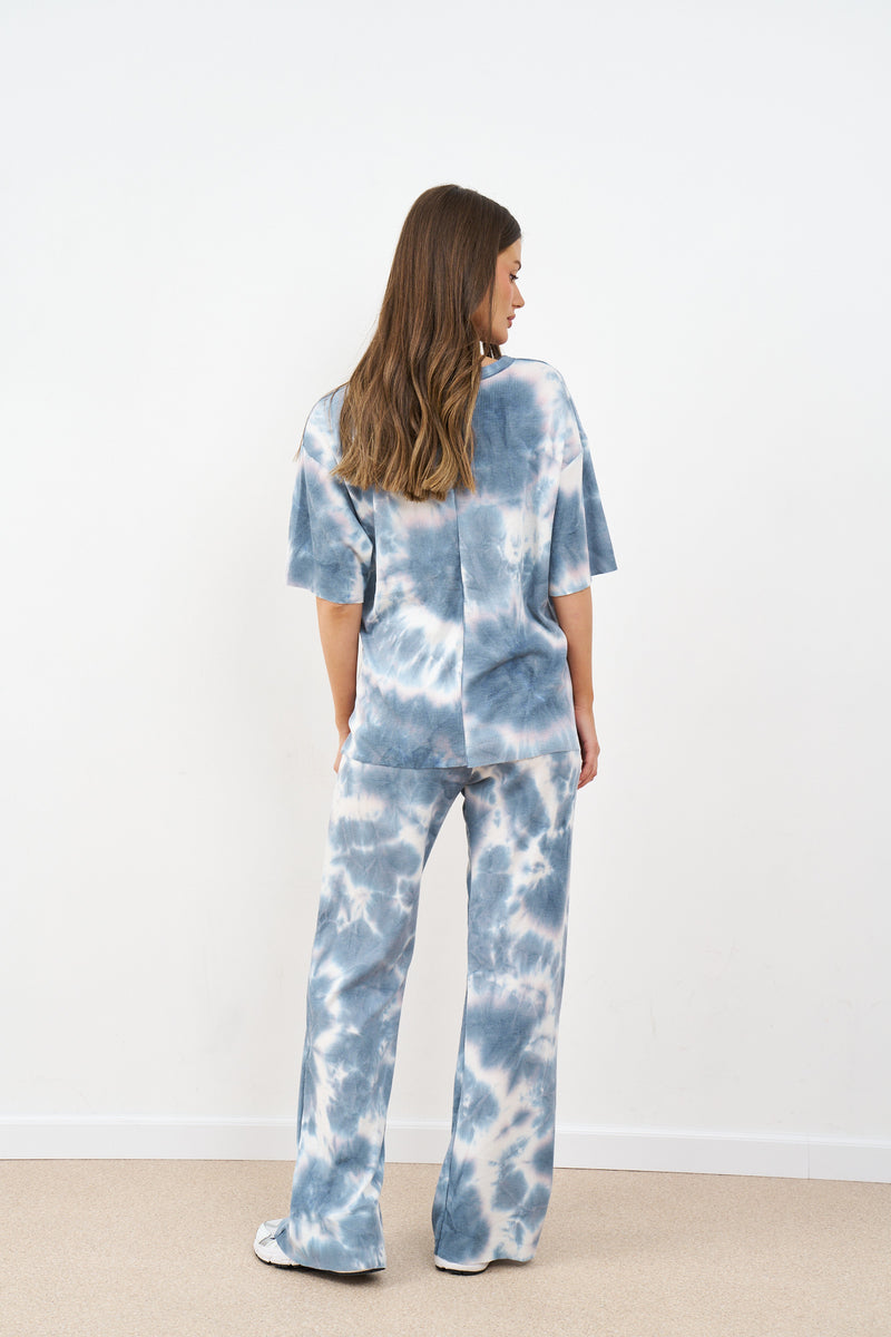 סט קזואל מבד וופל טיידי עם צווארון עגול, שרוולים קצרים ומכנסיים מתרחבים עם גומי במותן ושרוך קשירה.
