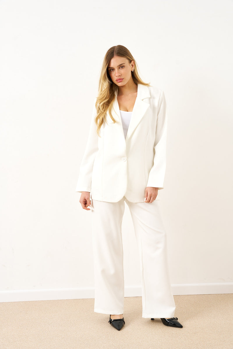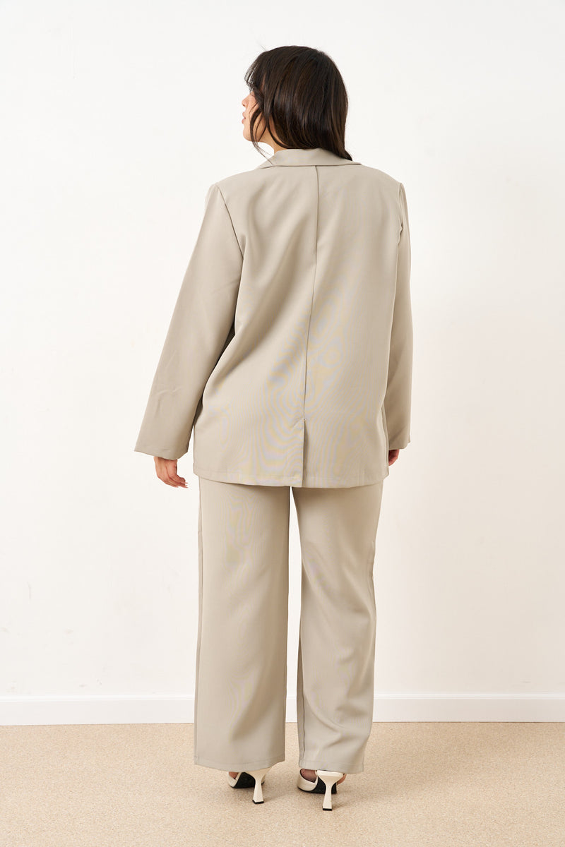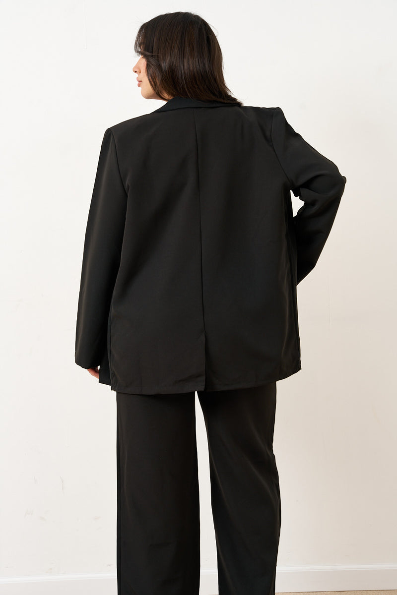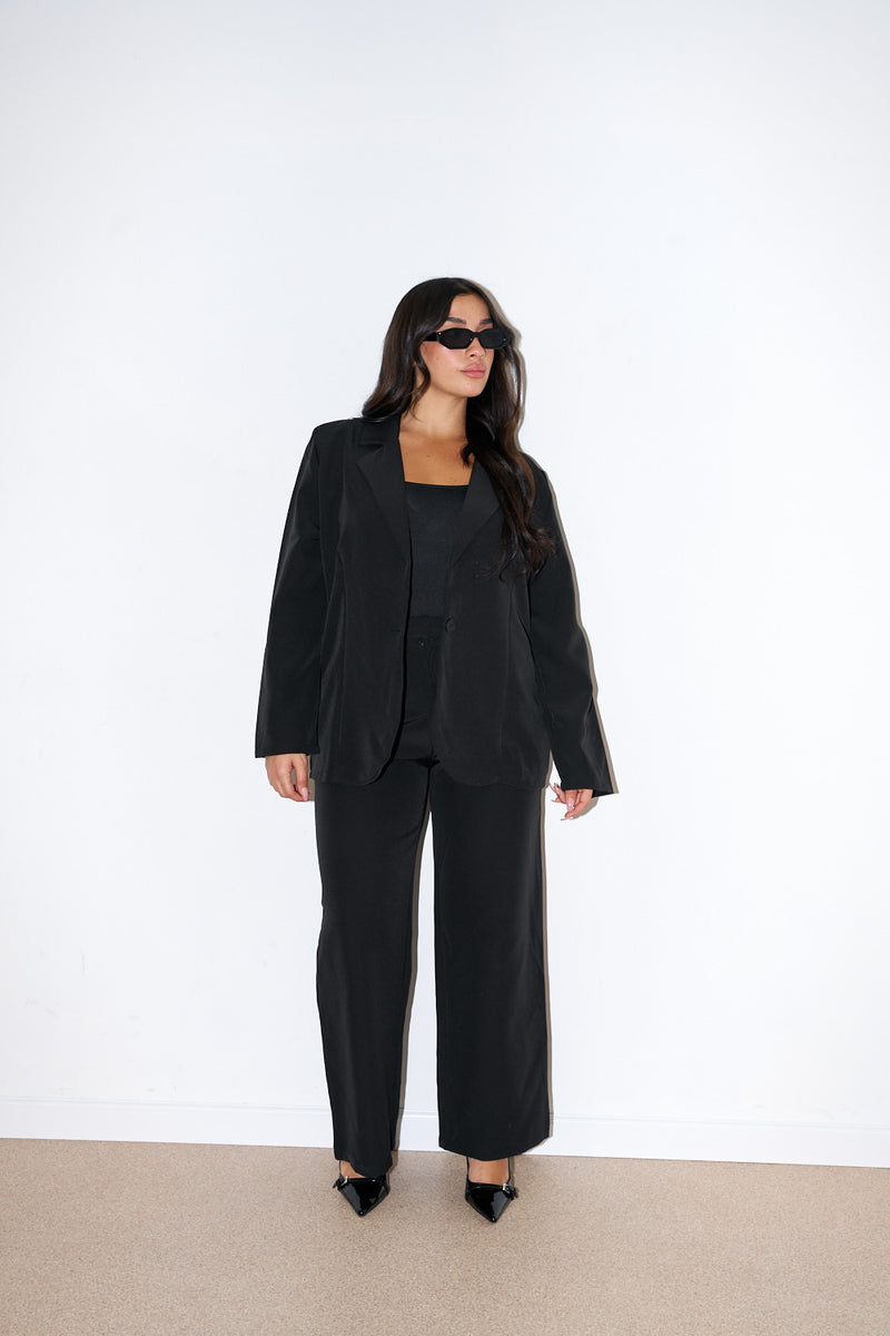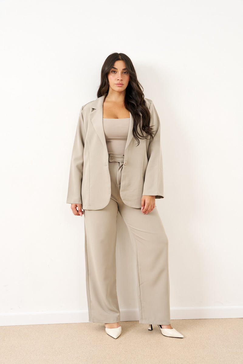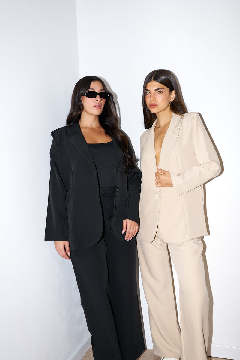 הבלייזר בעל כתפיים מובנות וקווים נקיים, בשילוב מכנסיים ישרים בגזרה נשפכת – יוצרים לוק עוצמתי שמתאים גם לפגישת עסקים וגם לערב עם עקבים.