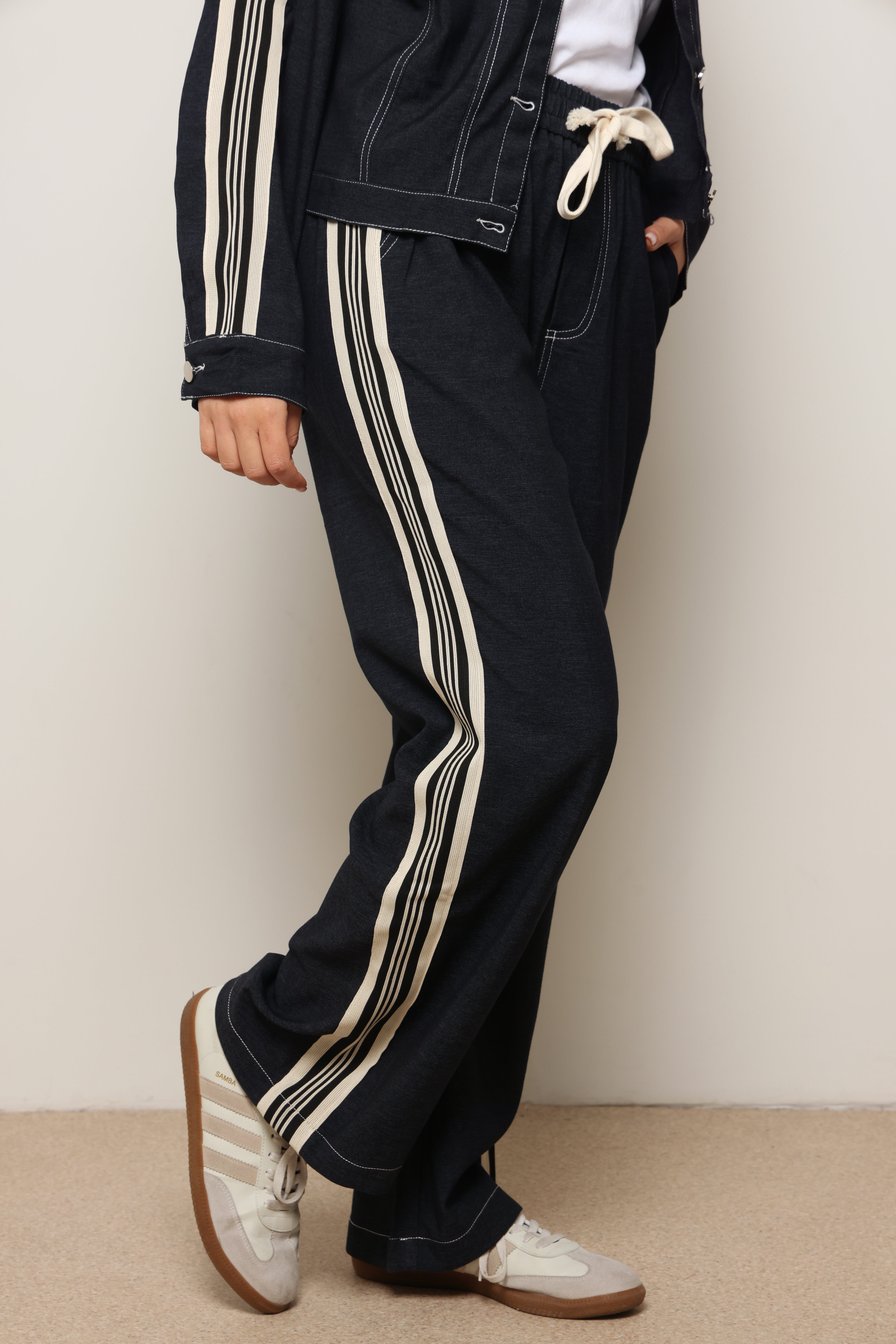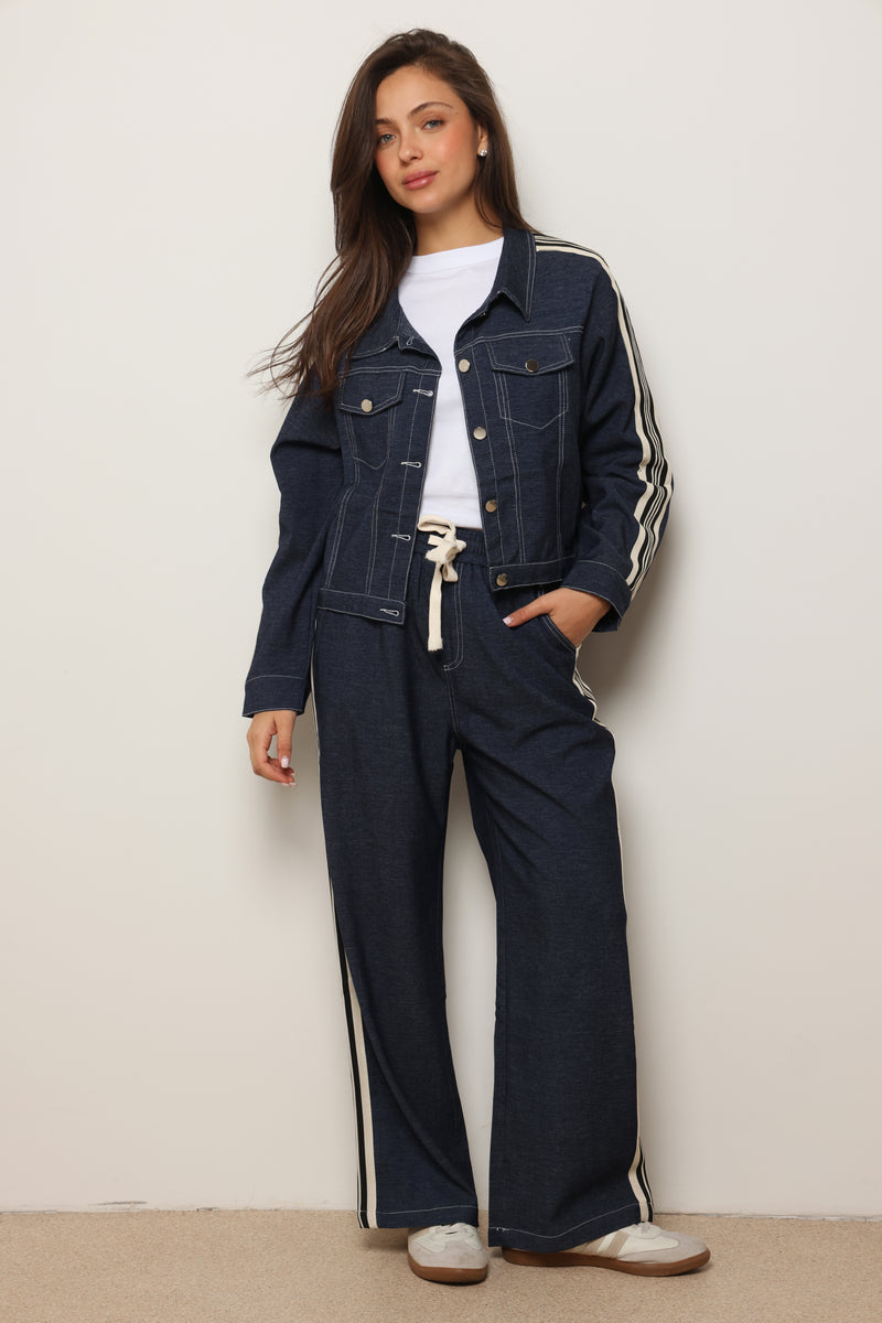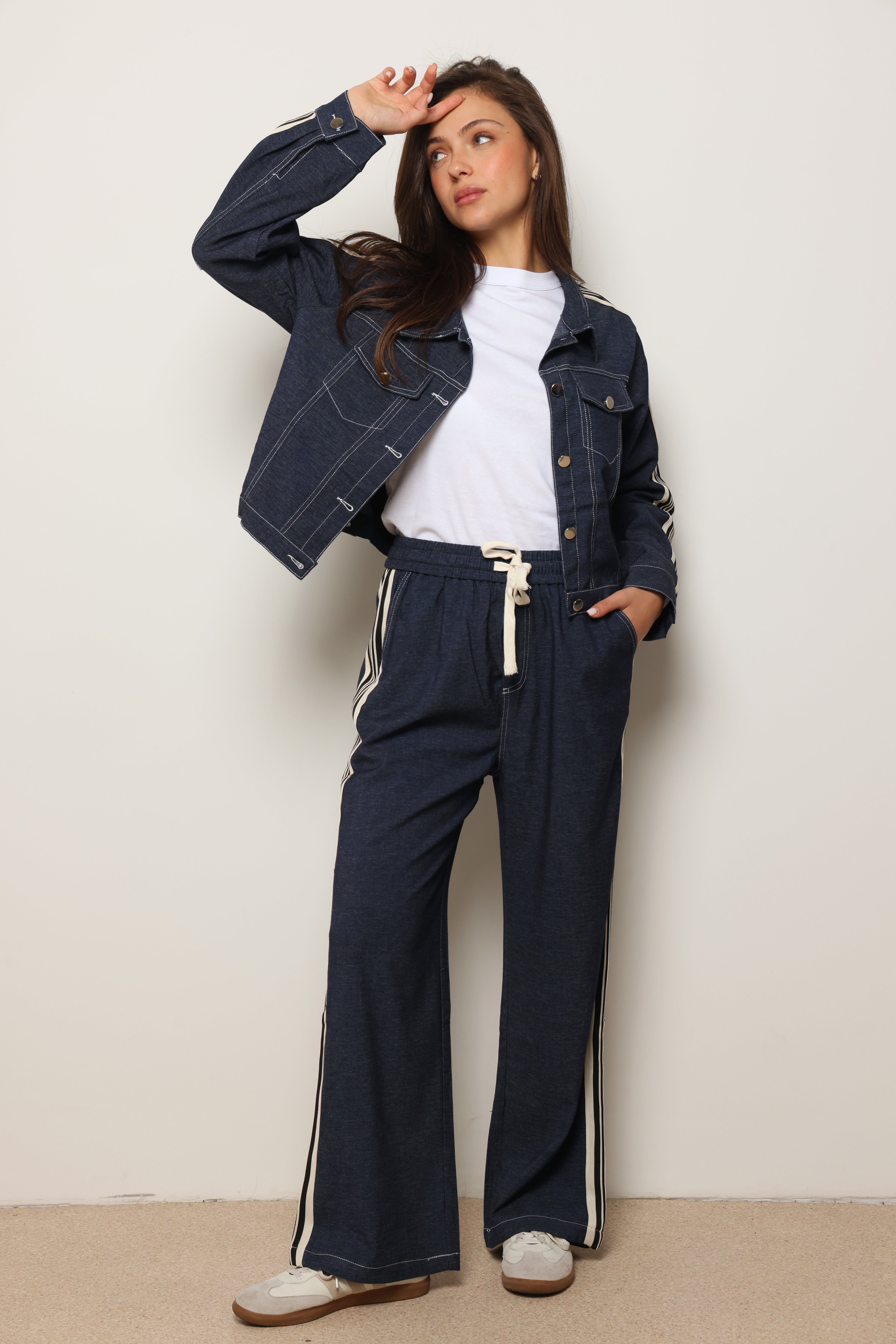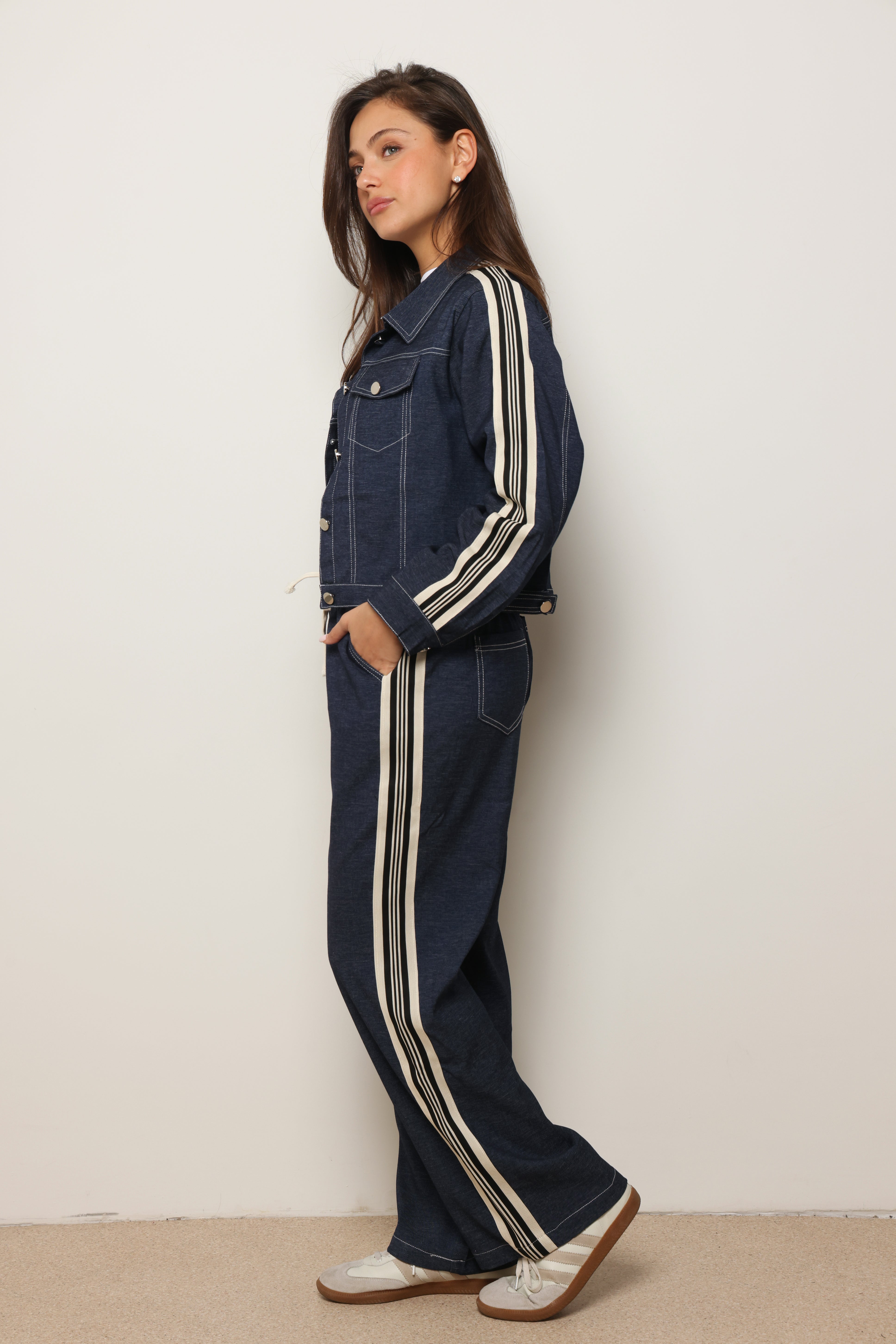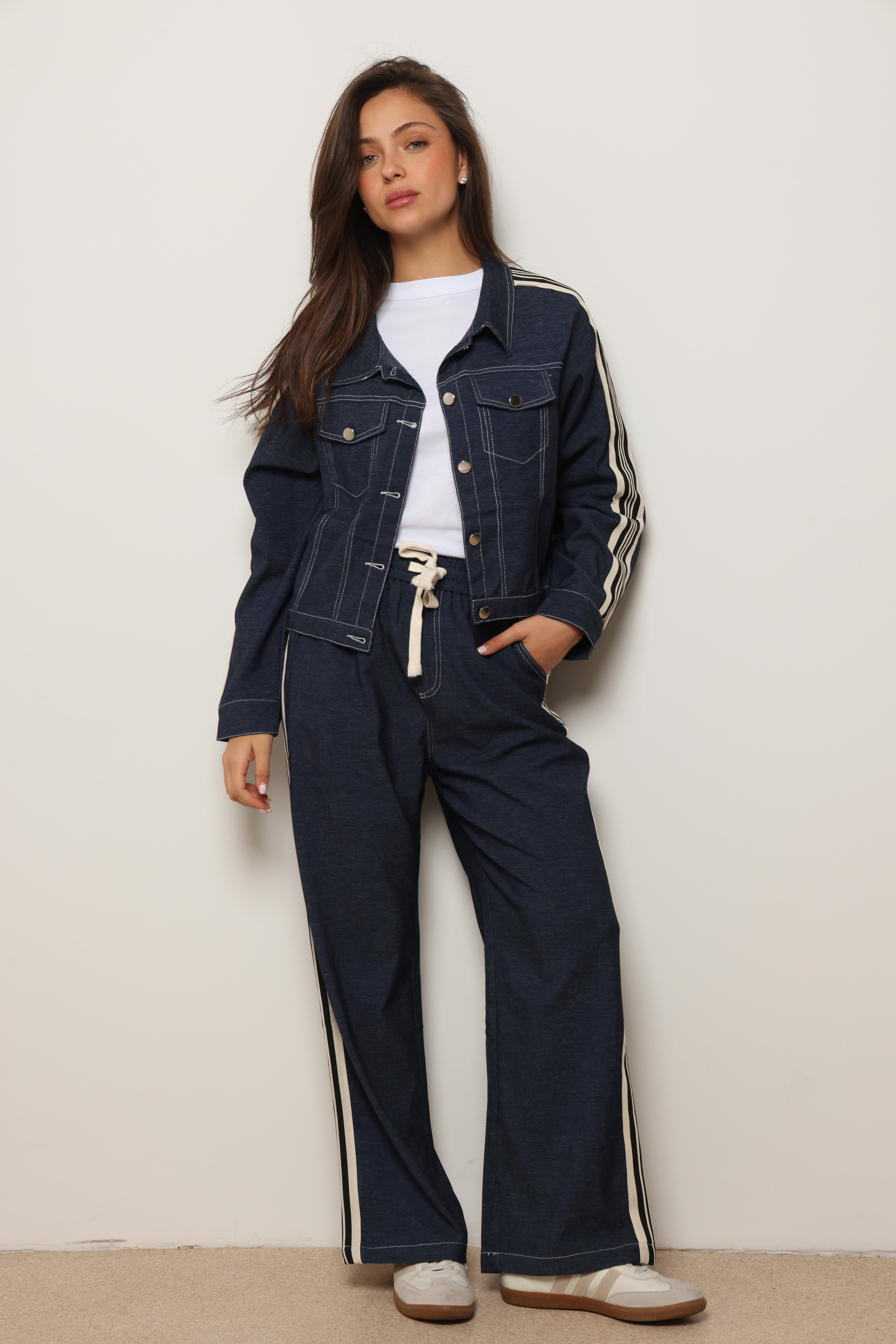 סט אלגנטי מבד ג'ינס לייקרה עם כפתורים קדמיים.