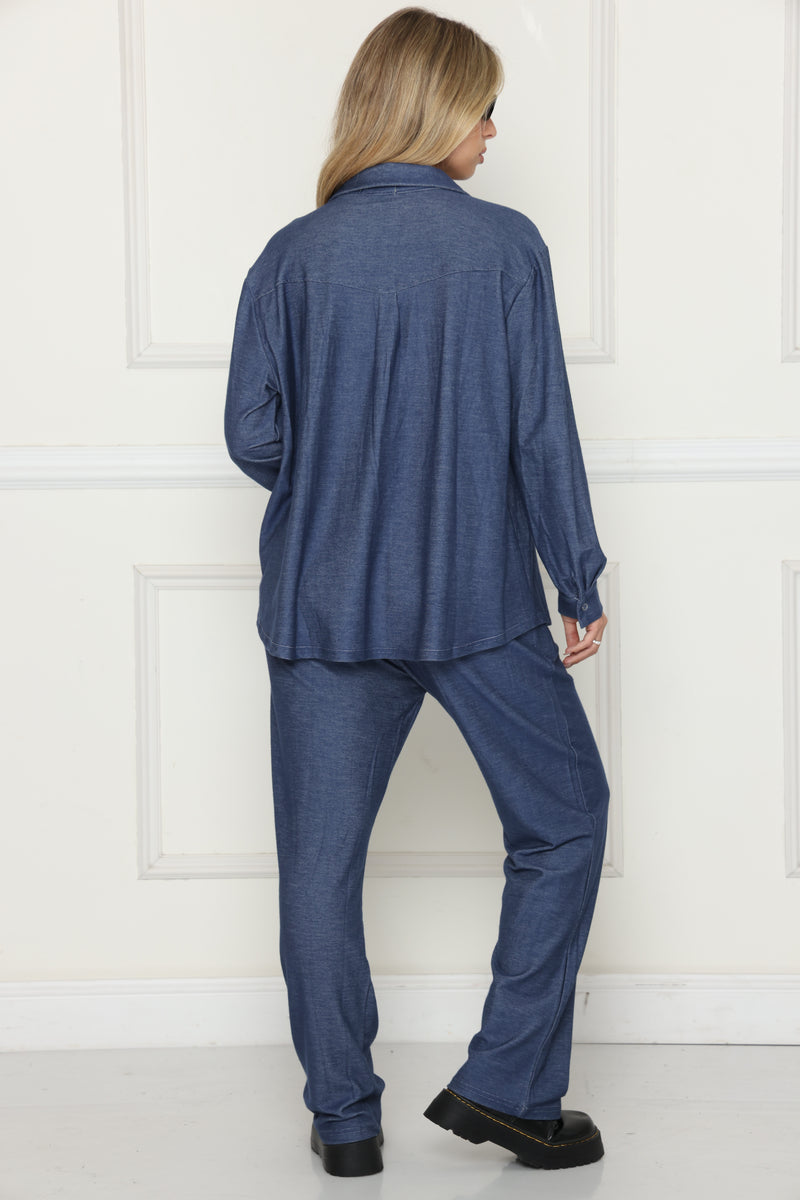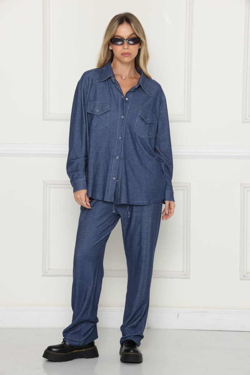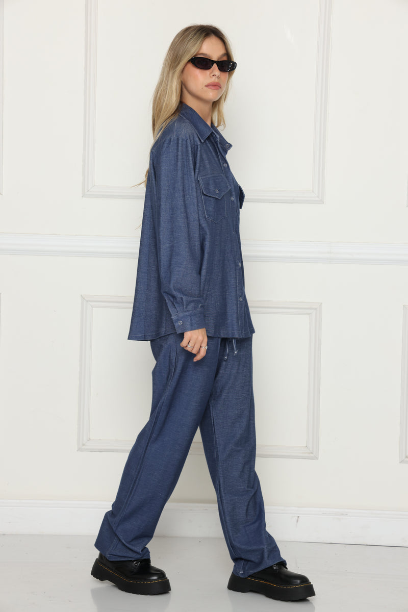 החליפה הכי יפה ומדויקת שתראי. בד ג'ינס לייקרה בעלת סגירת טיק-טק בחולצה, מכנסיים עם גומי במותן ושרוך קשירה.