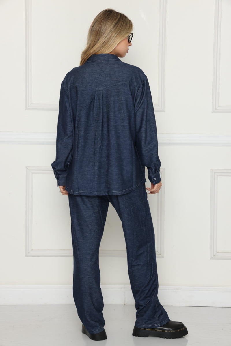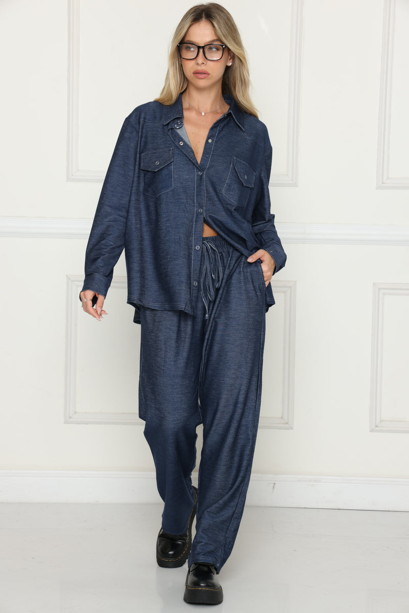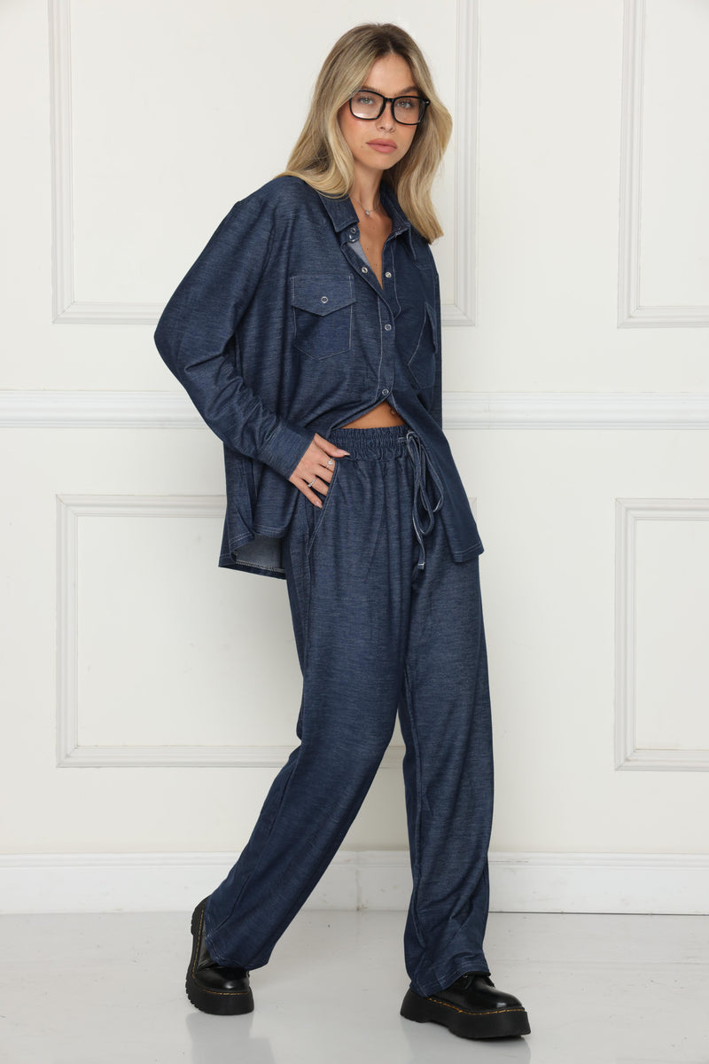החליפה הכי יפה ומדויקת שתראי. בד ג'ינס לייקרה בעלת סגירת טיק-טק בחולצה, מכנסיים עם גומי במותן ושרוך קשירה.