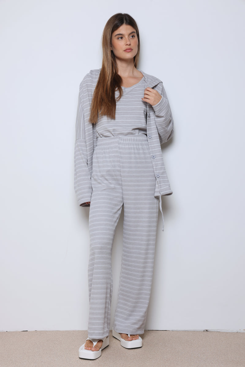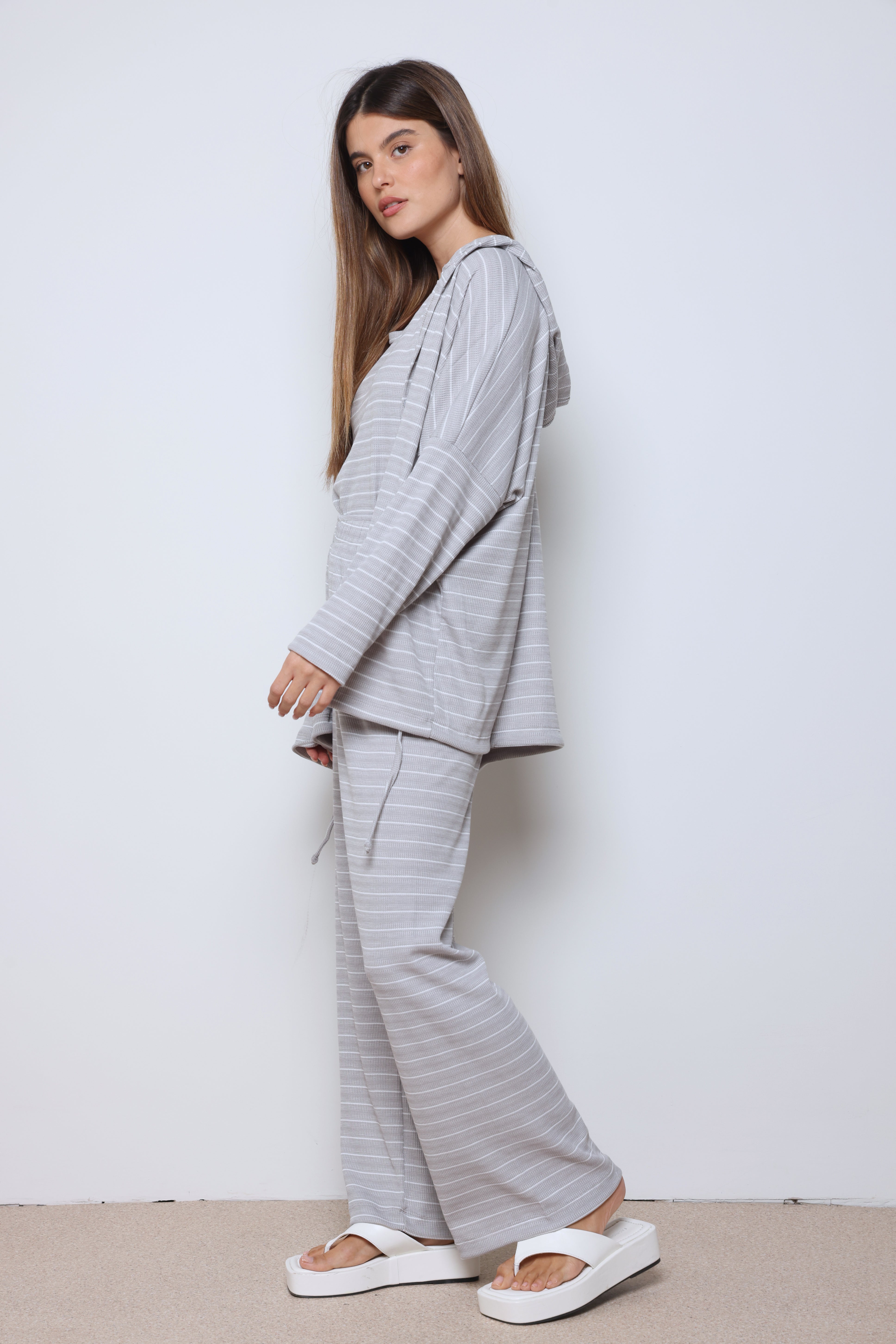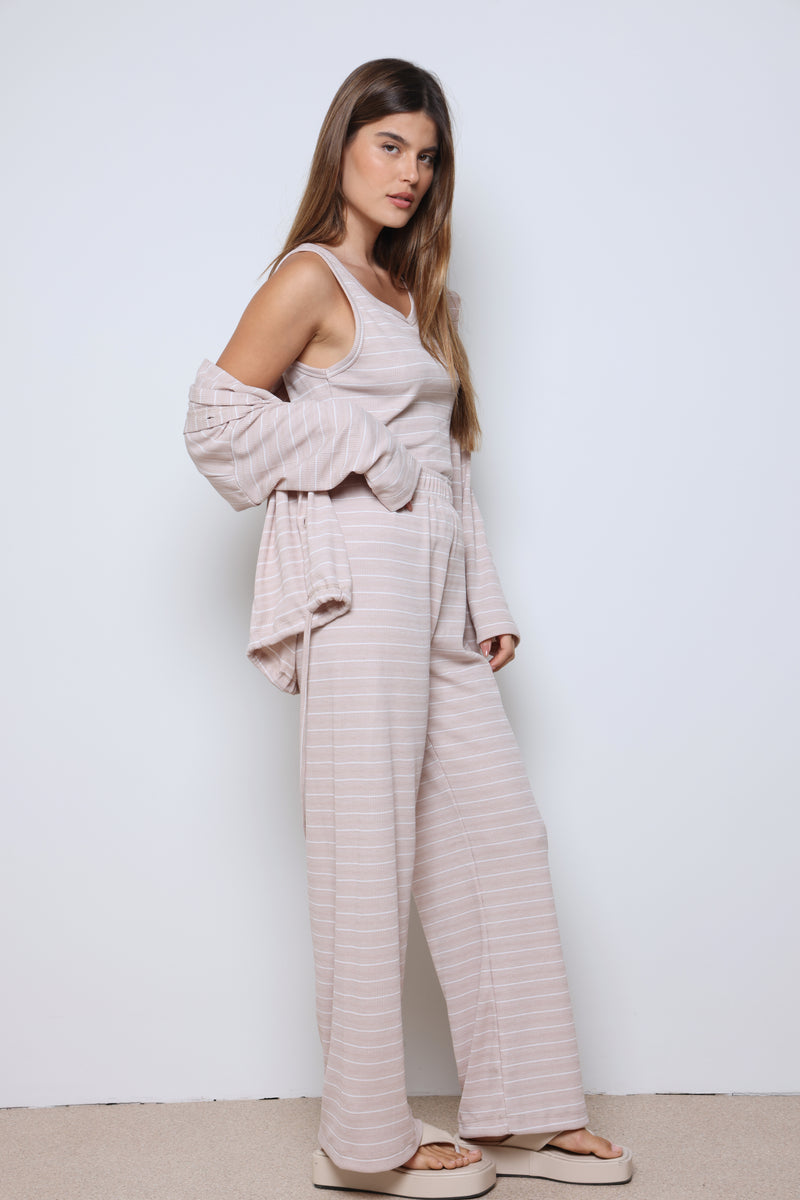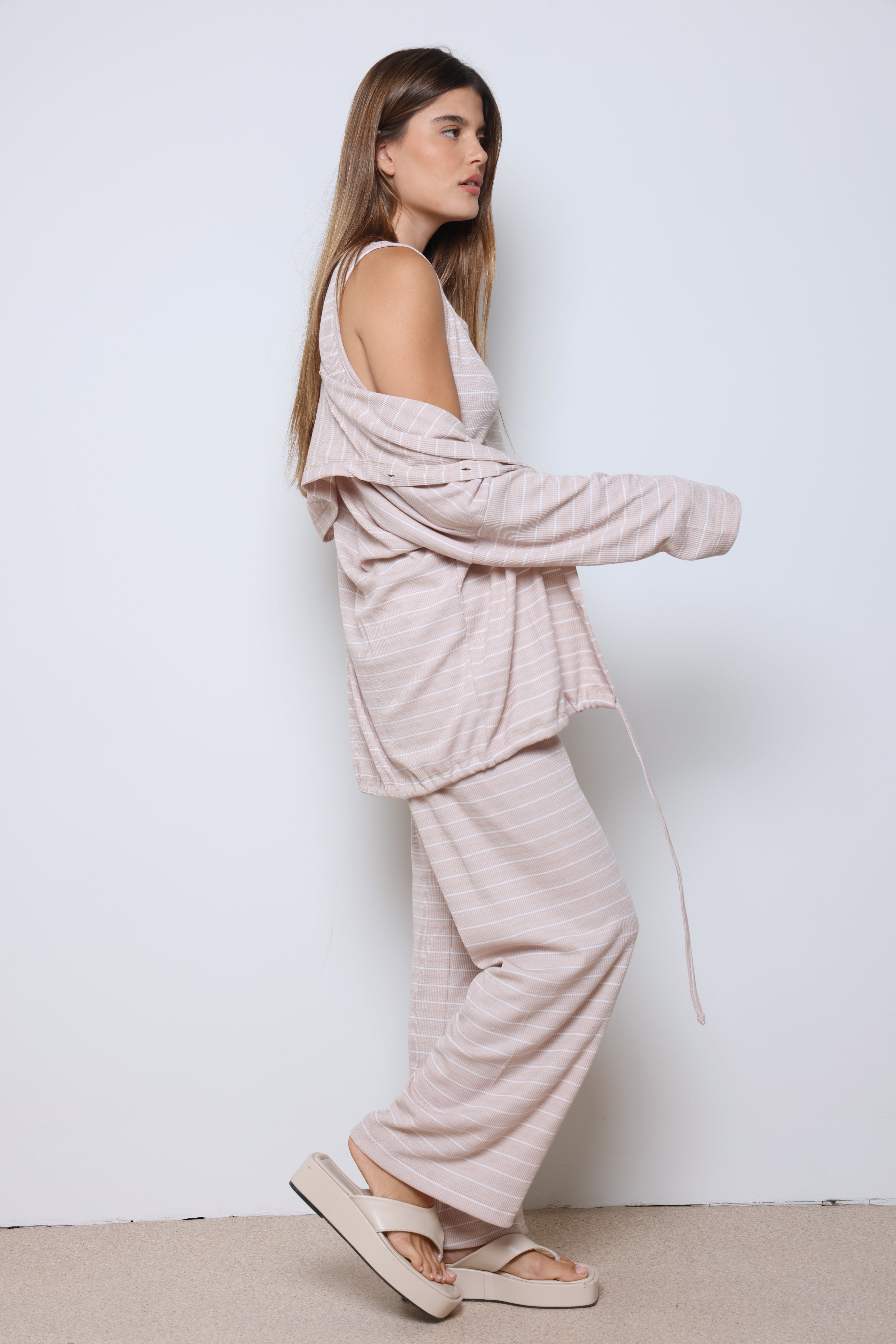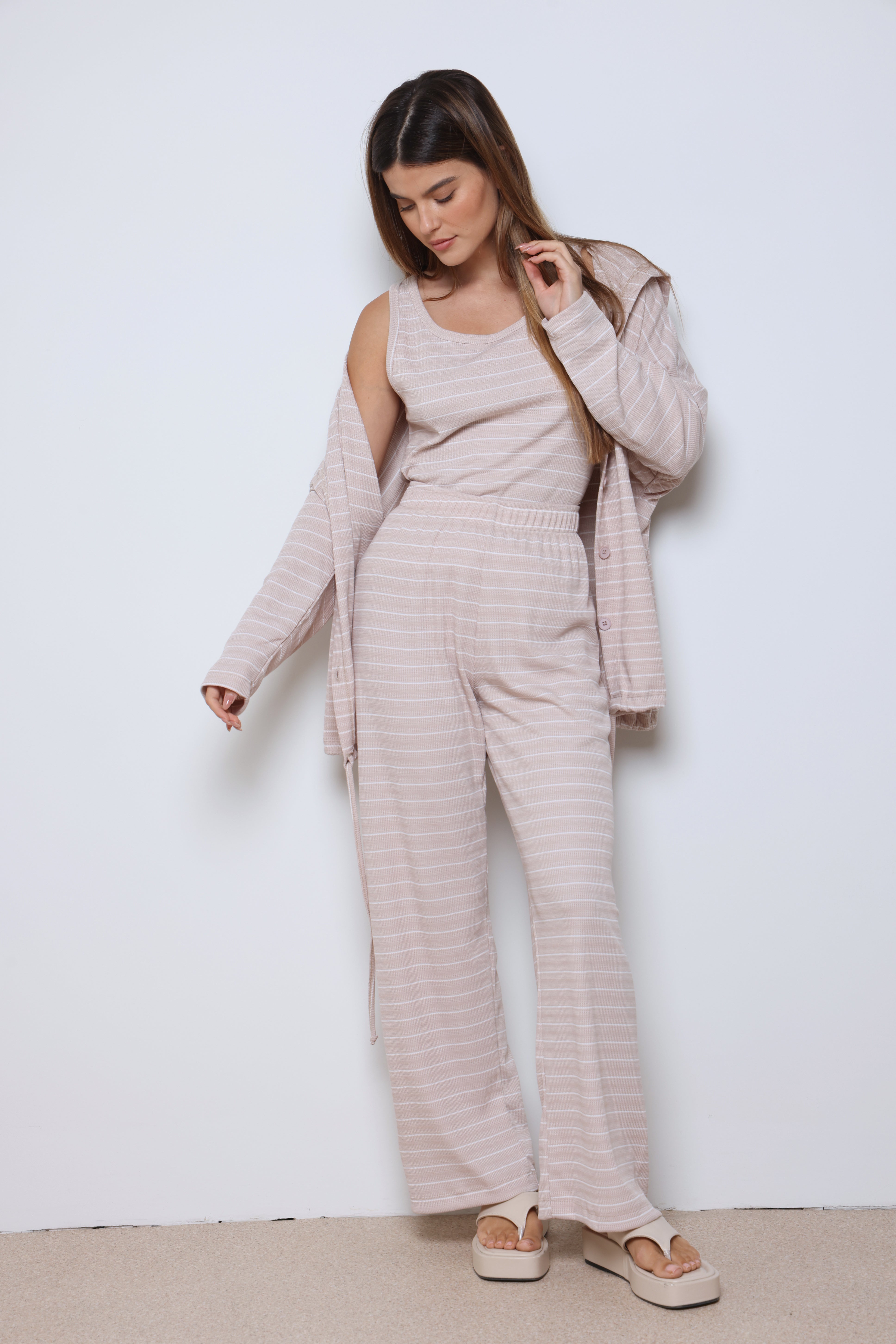חליפת וופל פסים בשילוב מנצח של נוחות וסטייל עם בד וופל רך ואוורירי, פסים עדינים שמוסיפים טאץ’ אופנתי, וגזרה מחויטת שמעניקה מראה מודרני ומדויק.