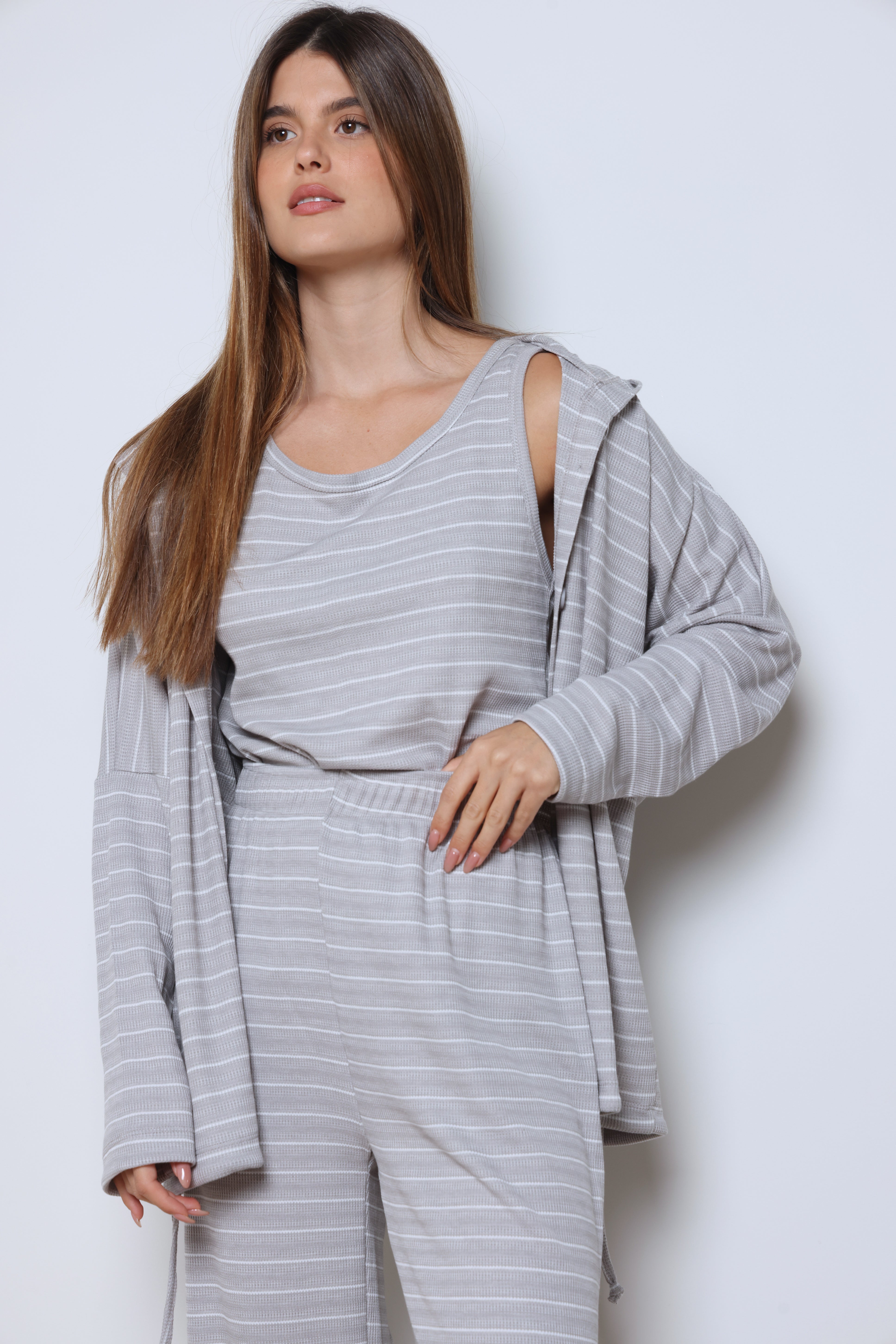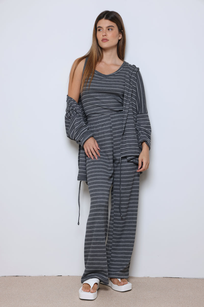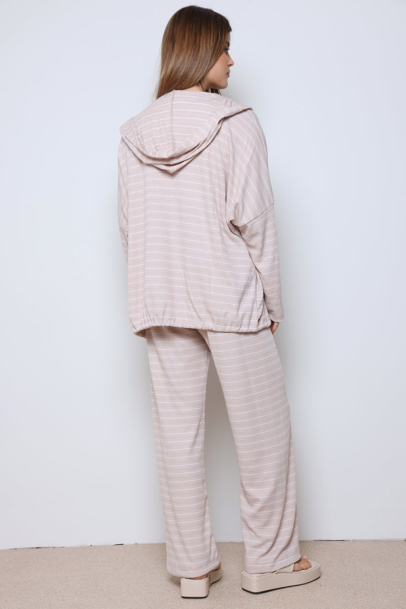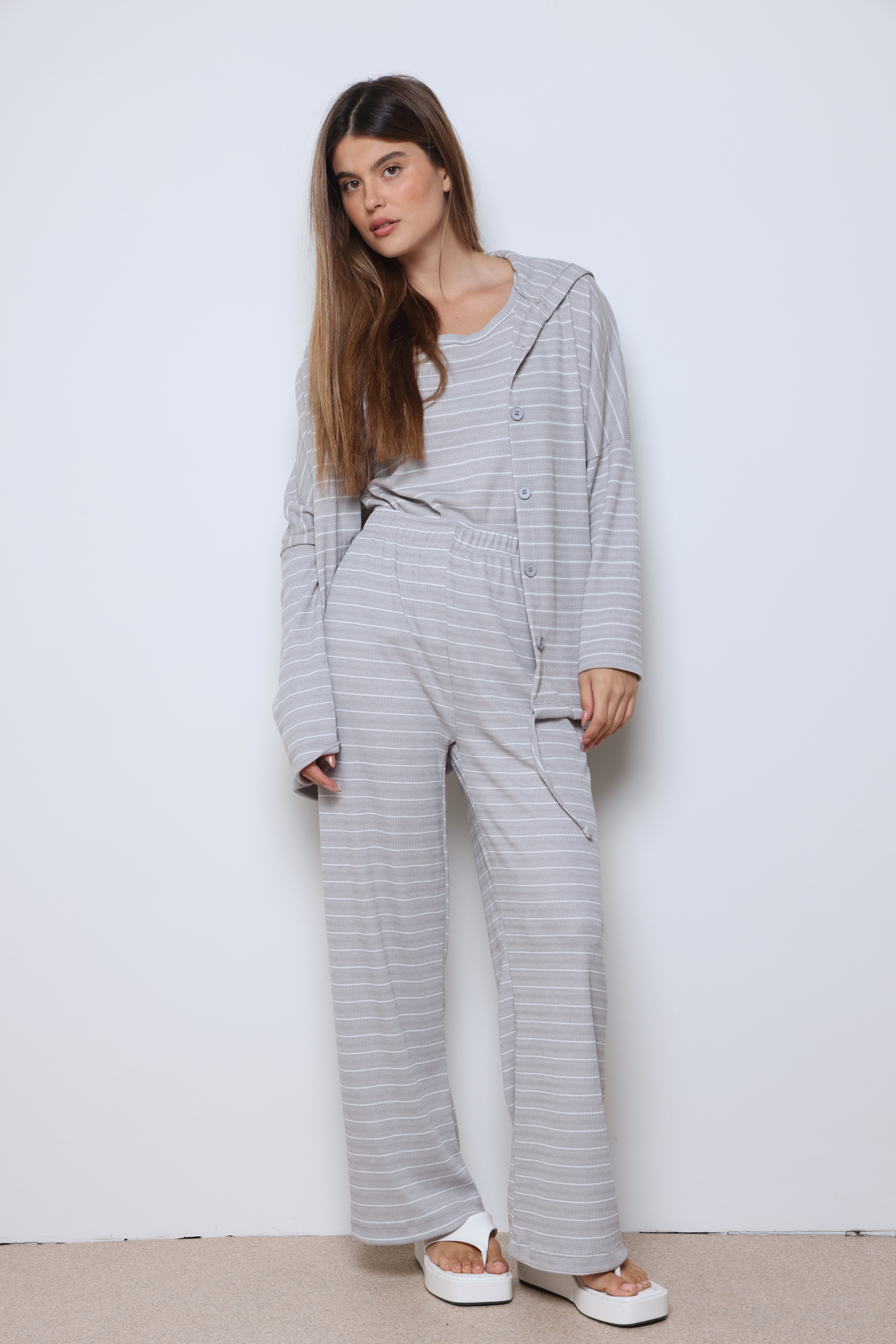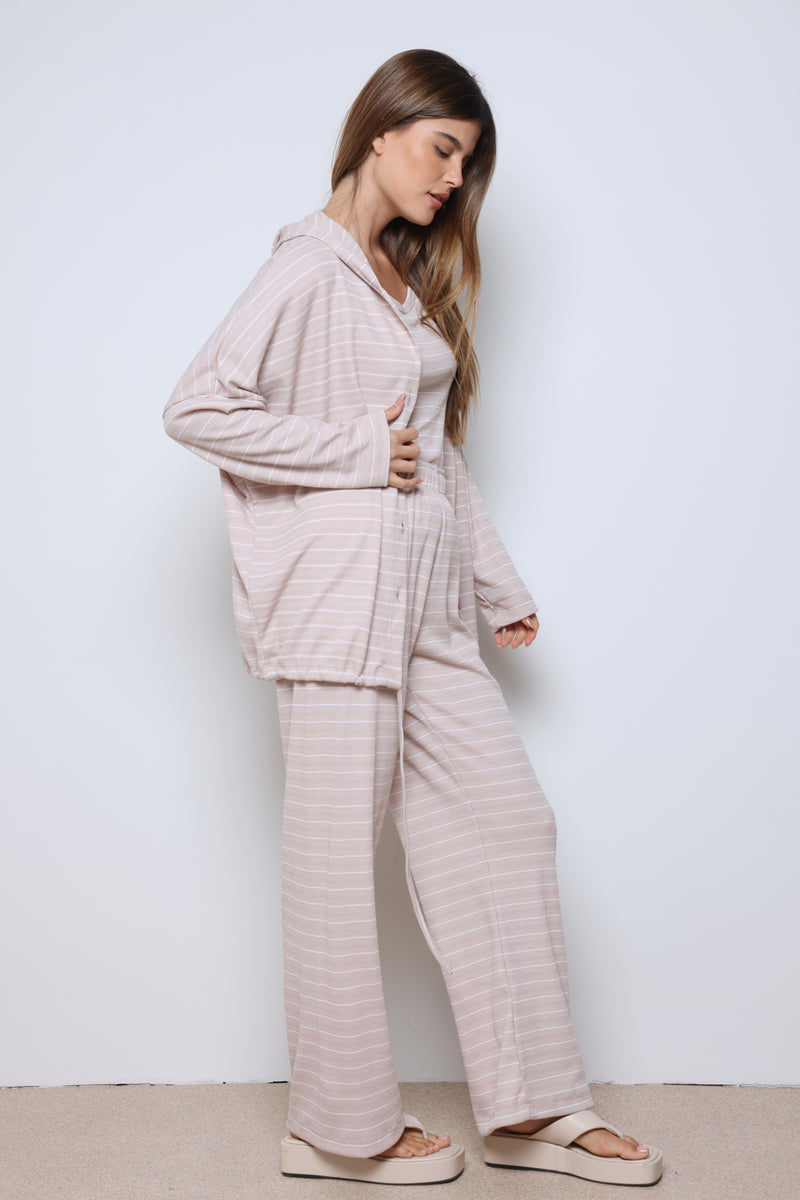 חליפת וופל פסים בשילוב מנצח של נוחות וסטייל עם בד וופל רך ואוורירי, פסים עדינים שמוסיפים טאץ’ אופנתי, וגזרה מחויטת שמעניקה מראה מודרני ומדויק.