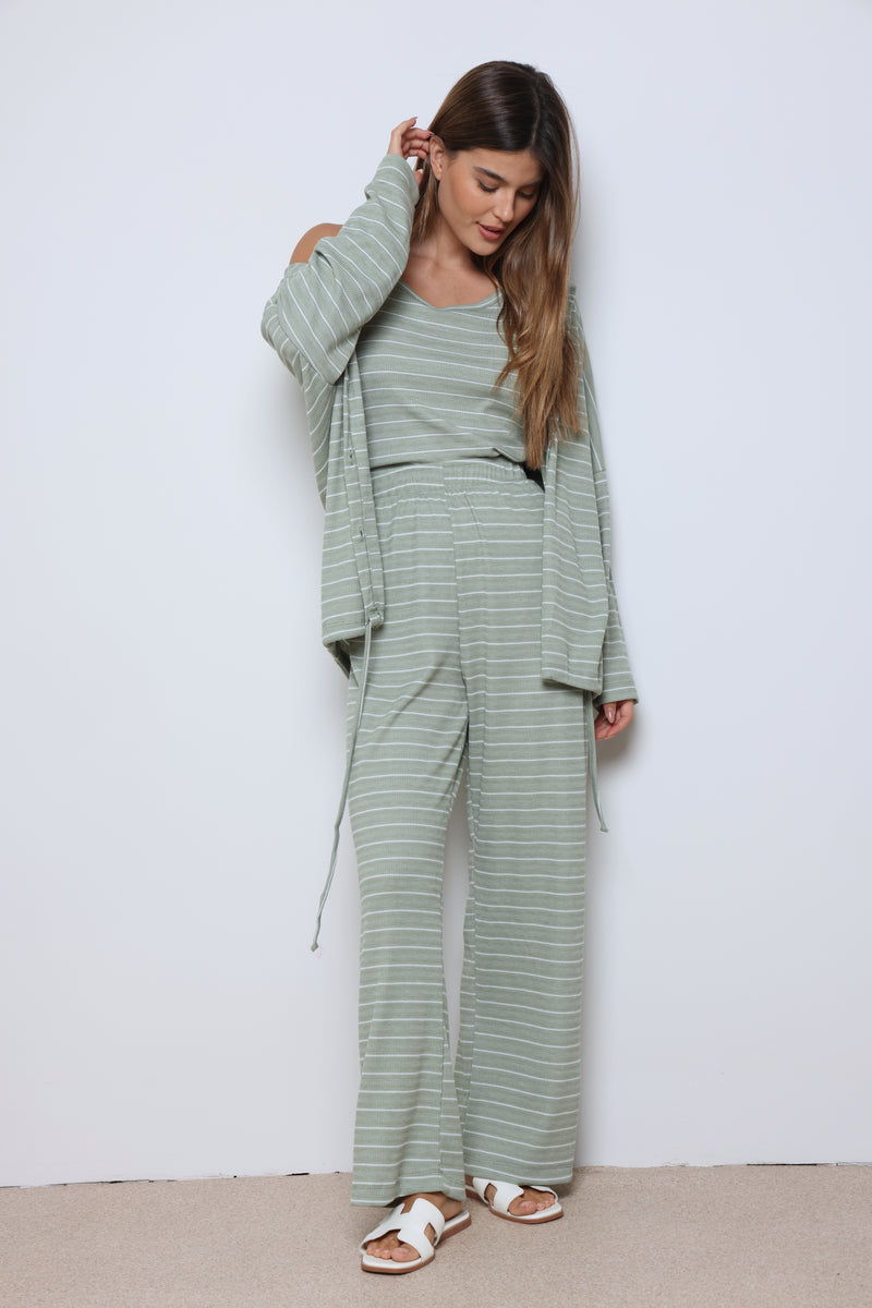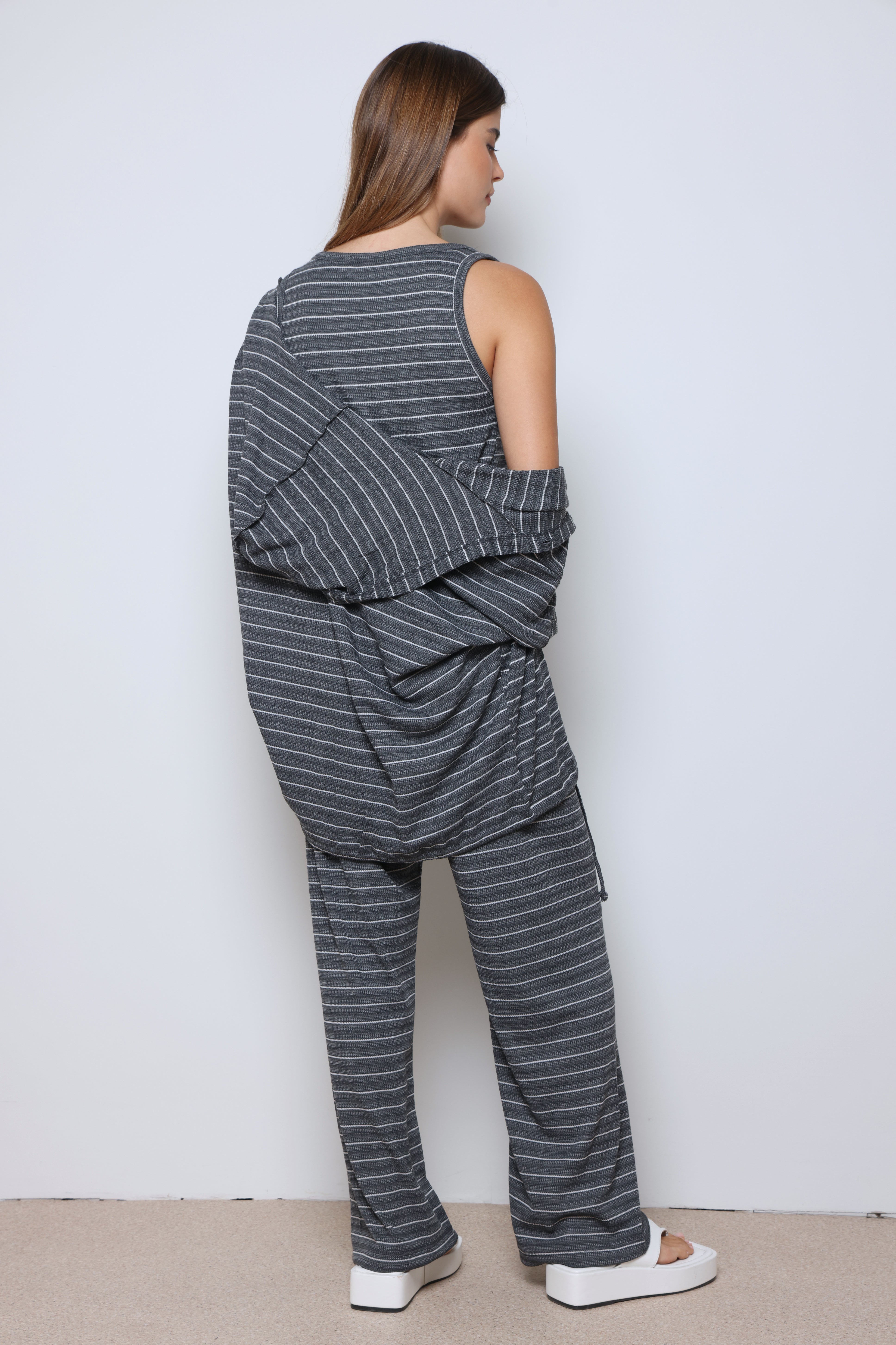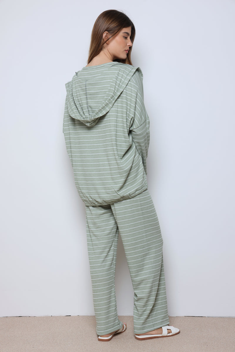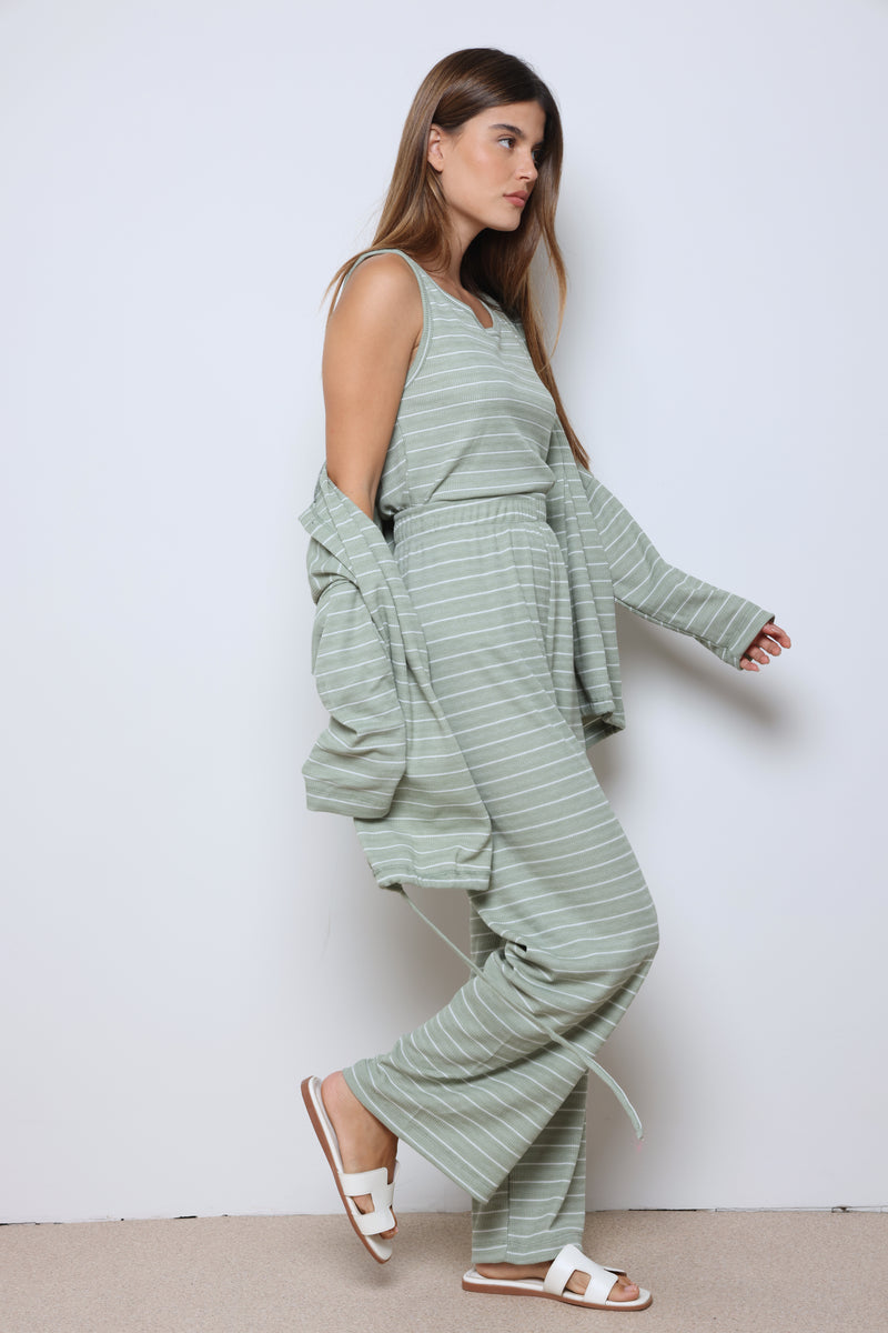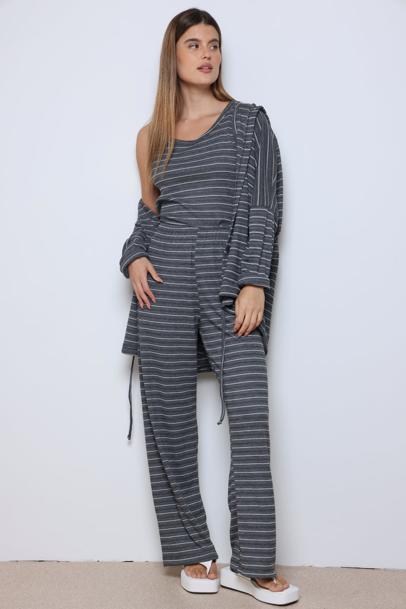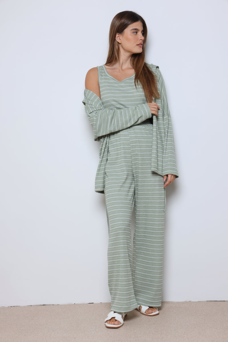 חליפת וופל פסים בשילוב מנצח של נוחות וסטייל עם בד וופל רך ואוורירי, פסים עדינים שמוסיפים טאץ’ אופנתי, וגזרה מחויטת שמעניקה מראה מודרני ומדויק.