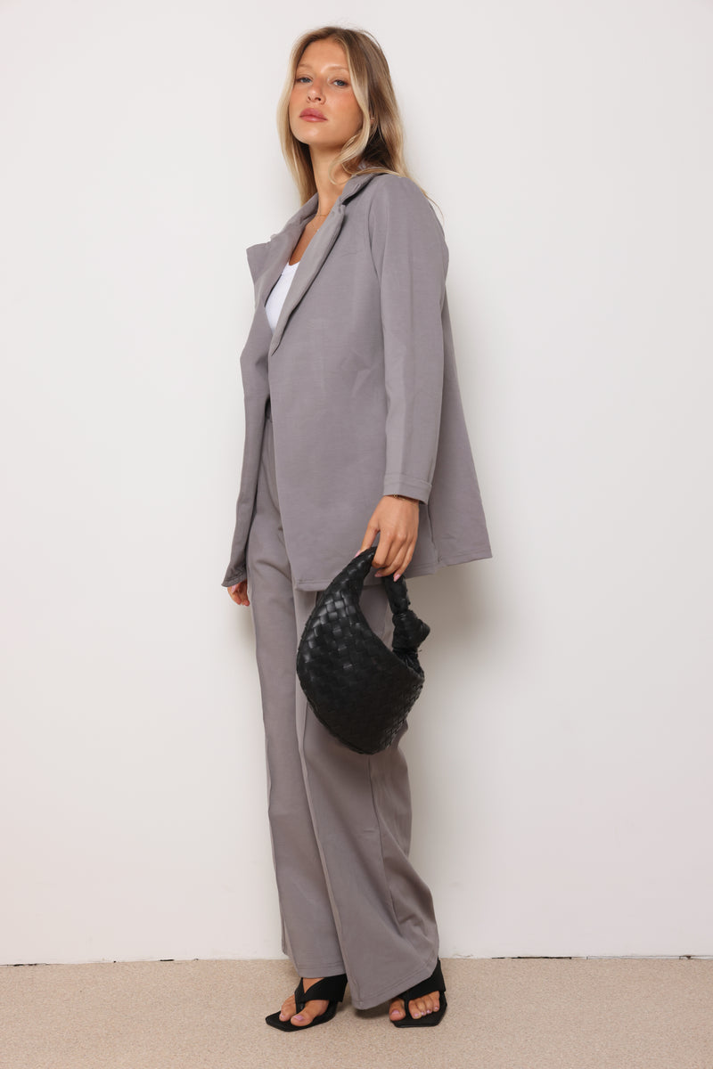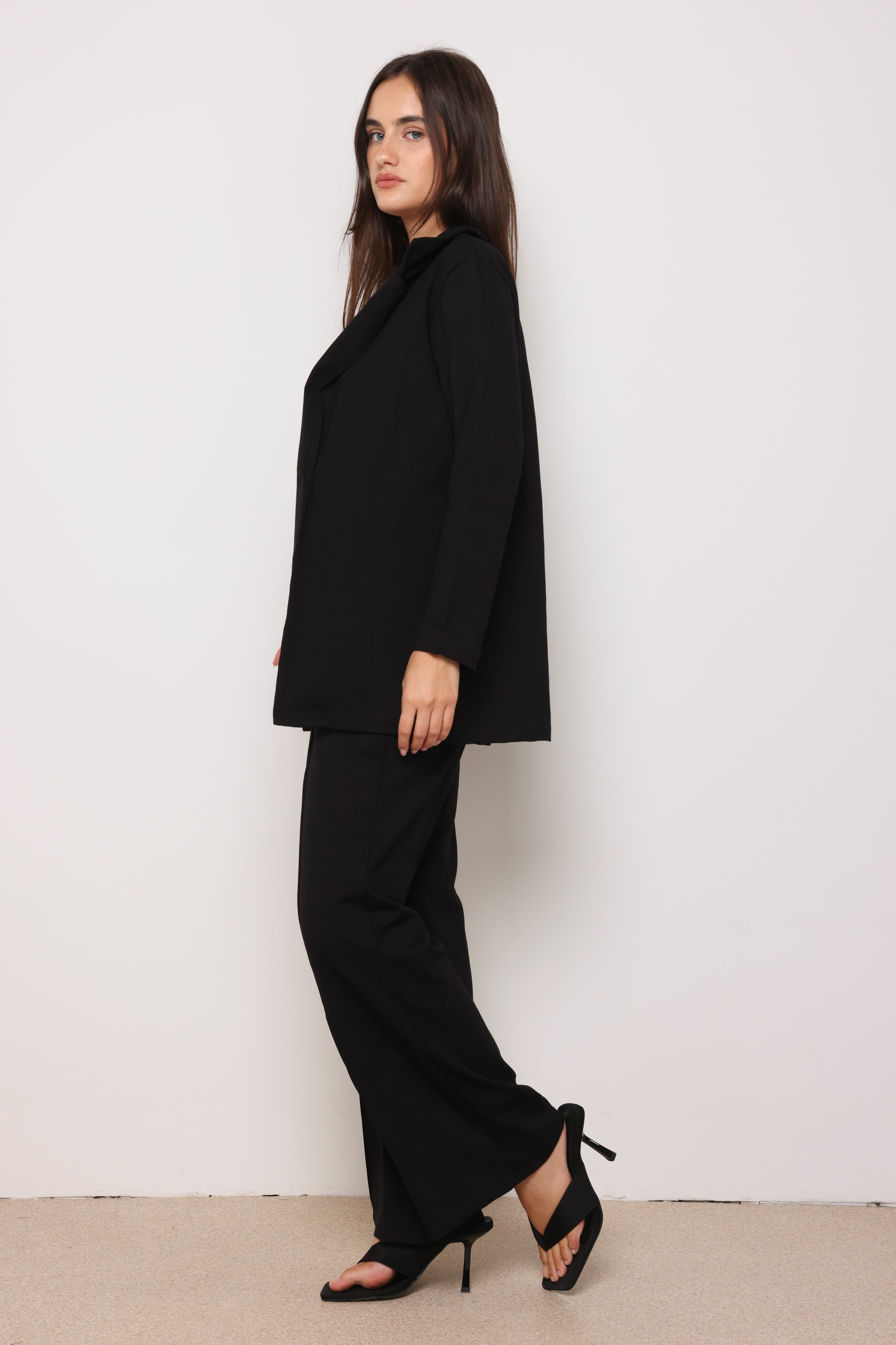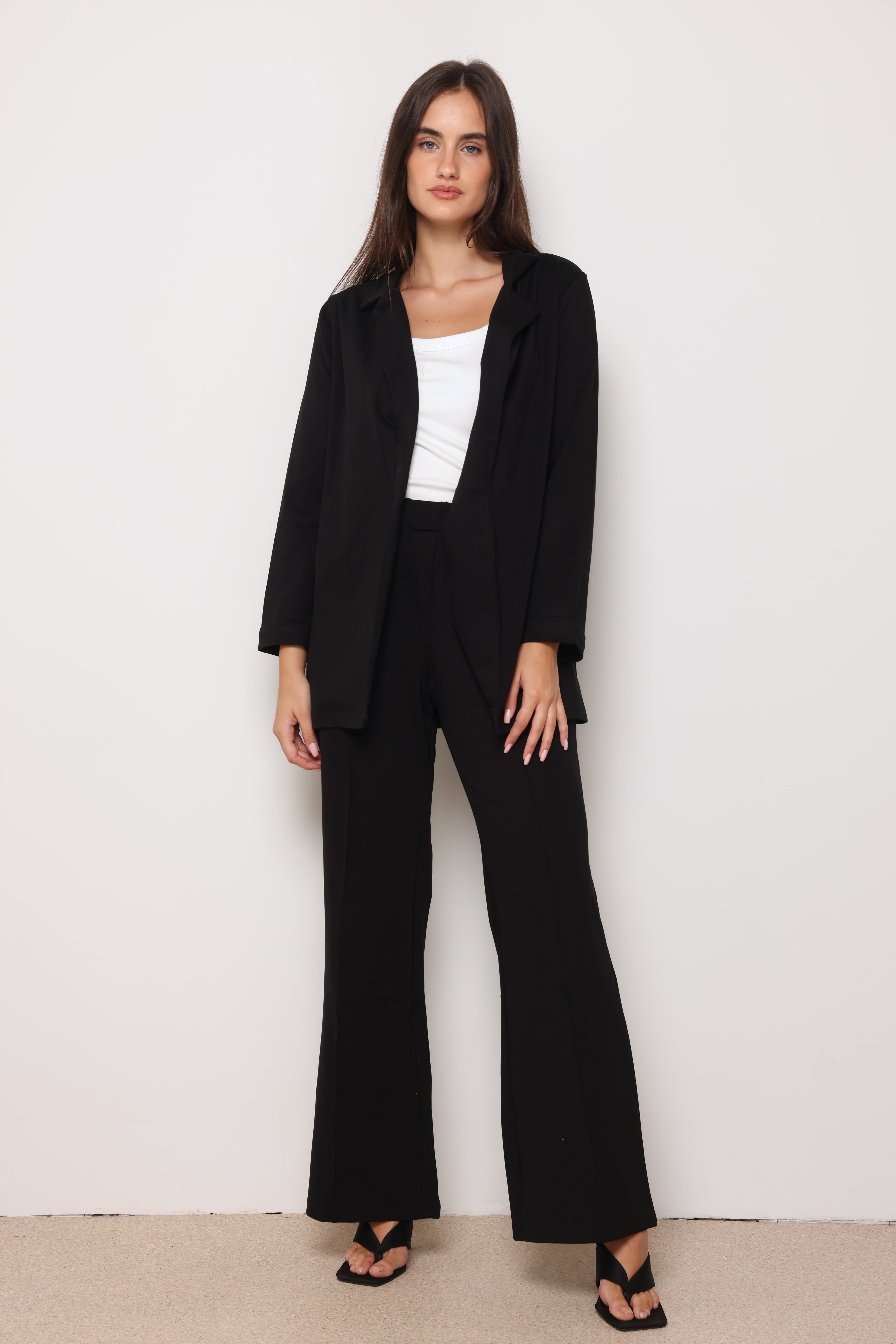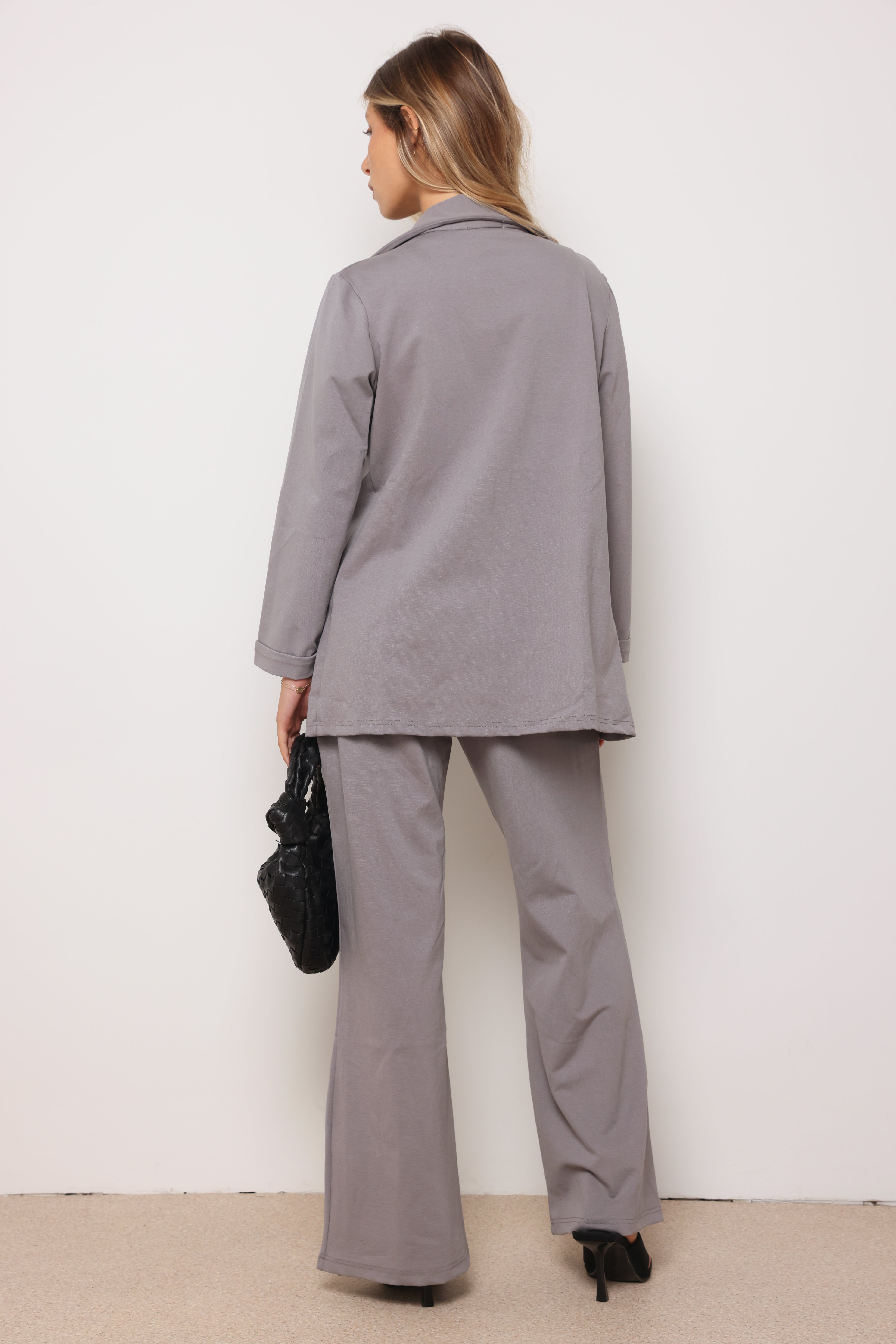 חליפה אלגנטית מבד ג'רסי פרימיום עם בלייזר פתוח ומכנסיים עם גומי במותן בסיומת מתרחבת.