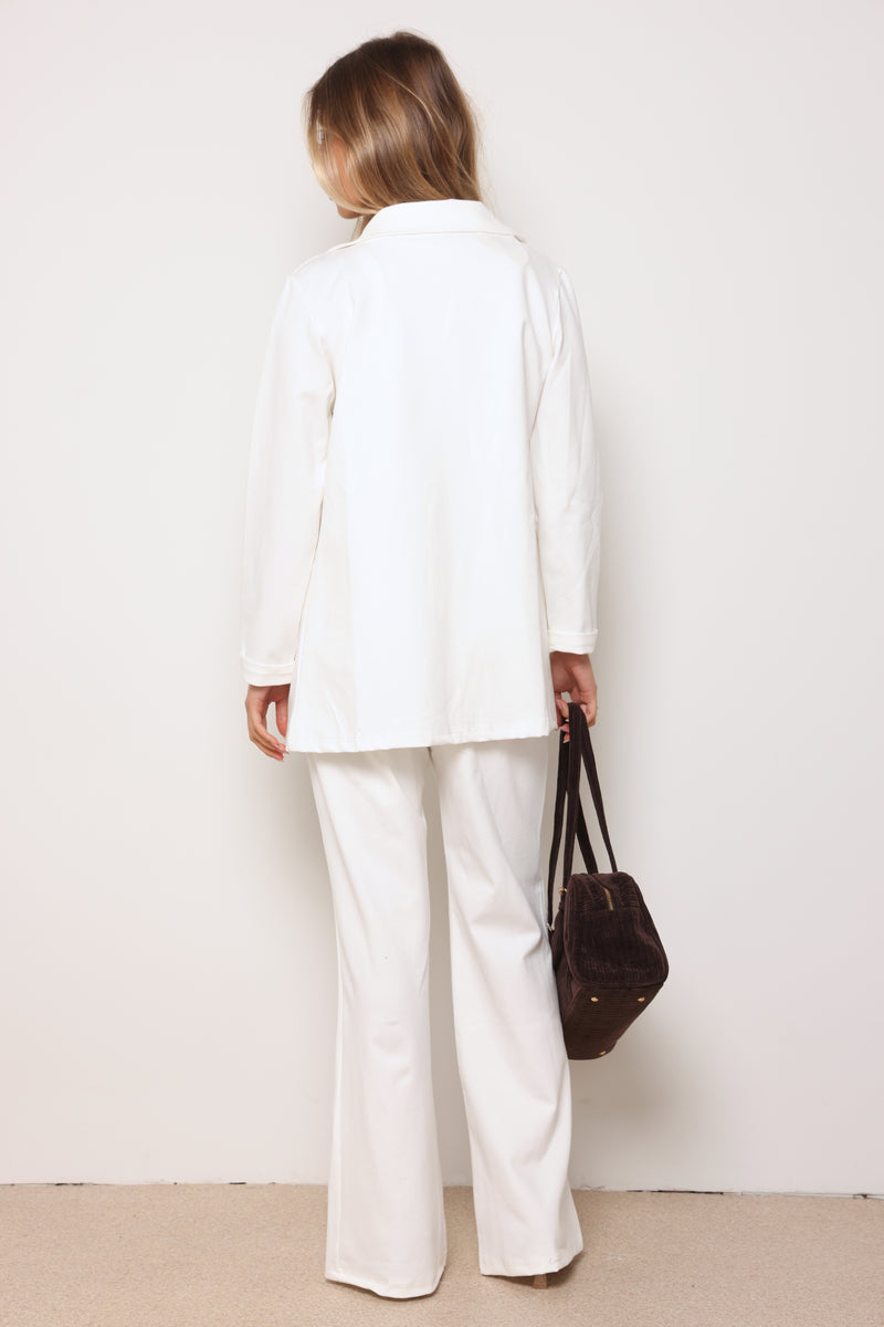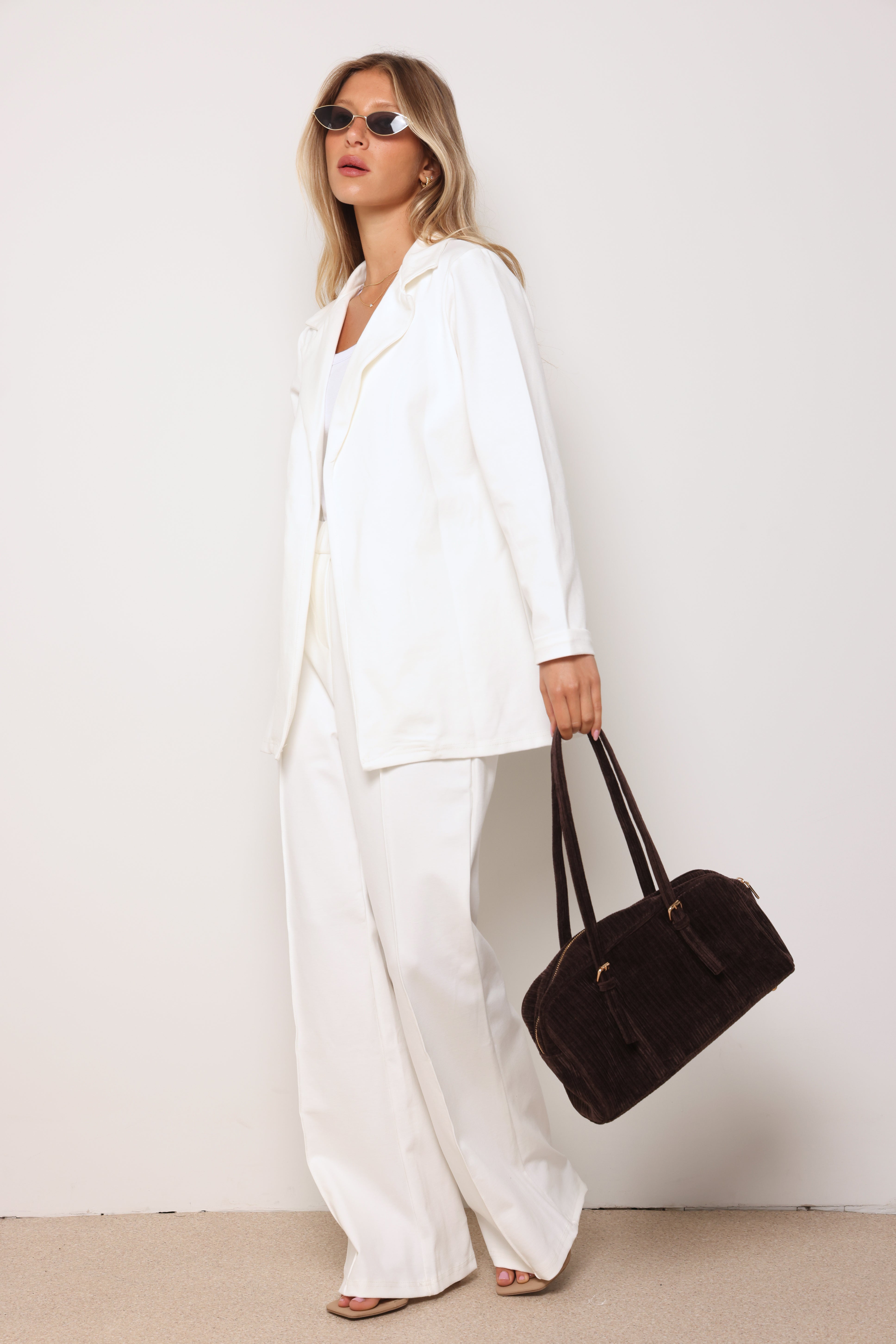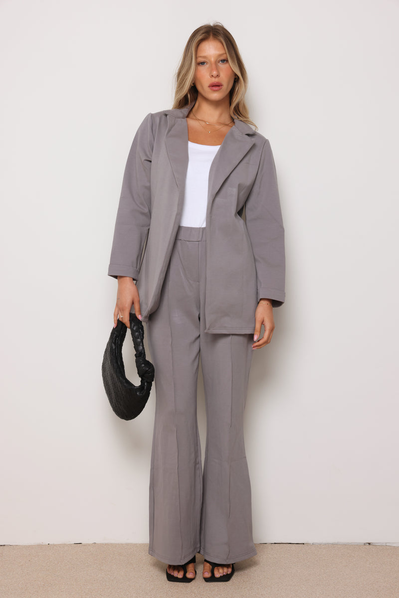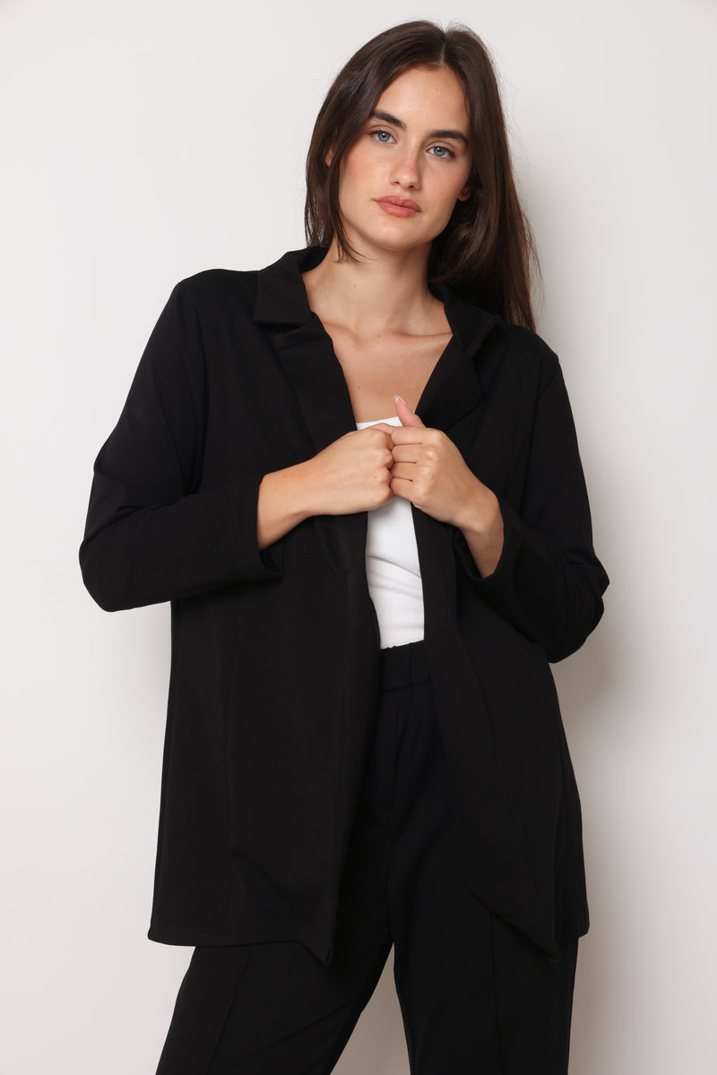 חליפה אלגנטית מבד ג'רסי פרימיום עם בלייזר פתוח ומכנסיים עם גומי במותן בסיומת מתרחבת.