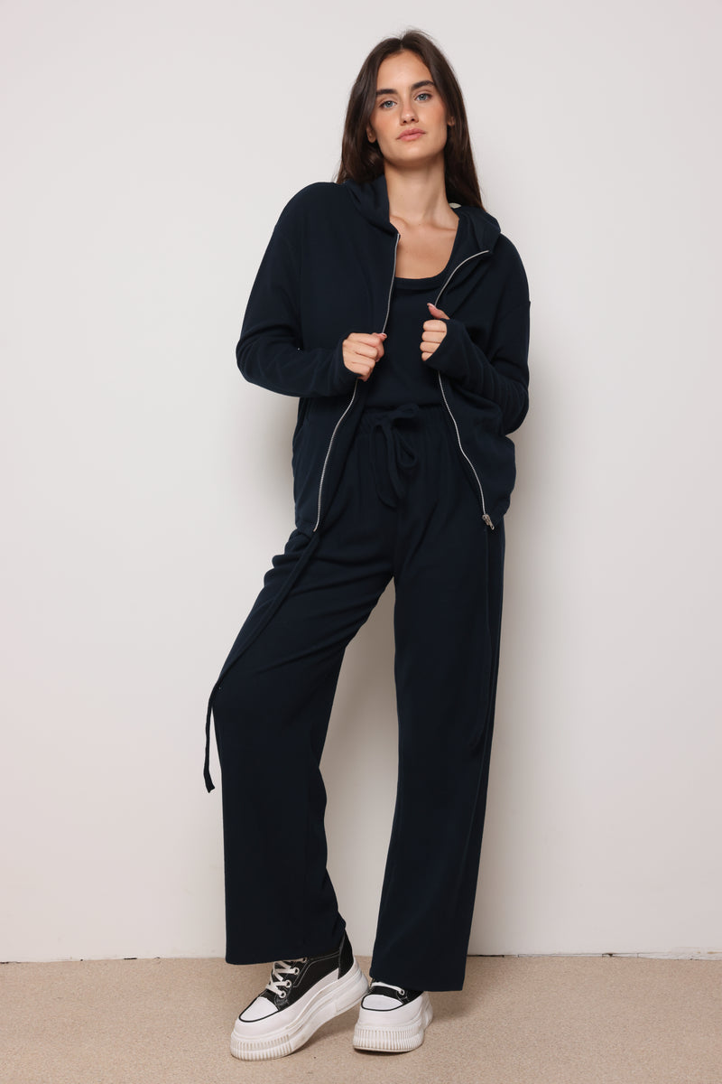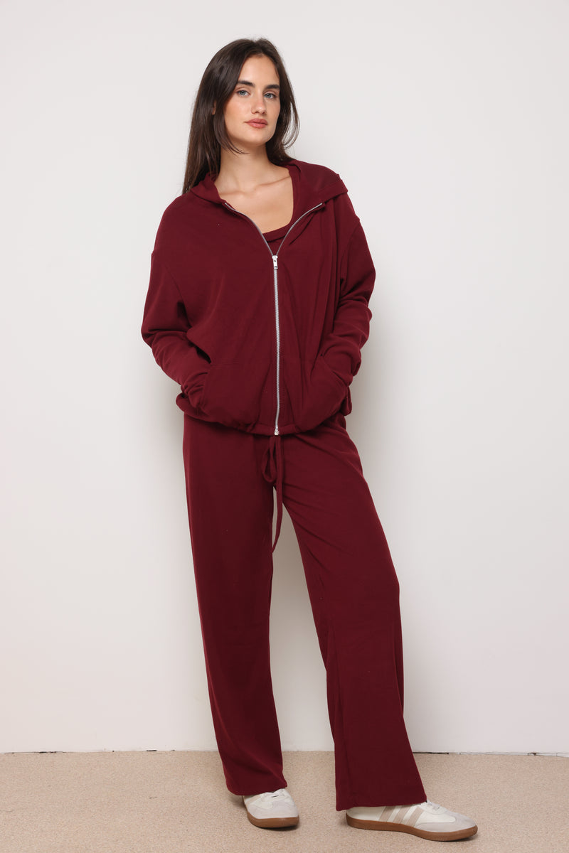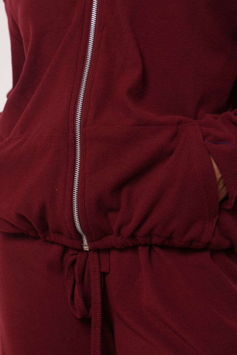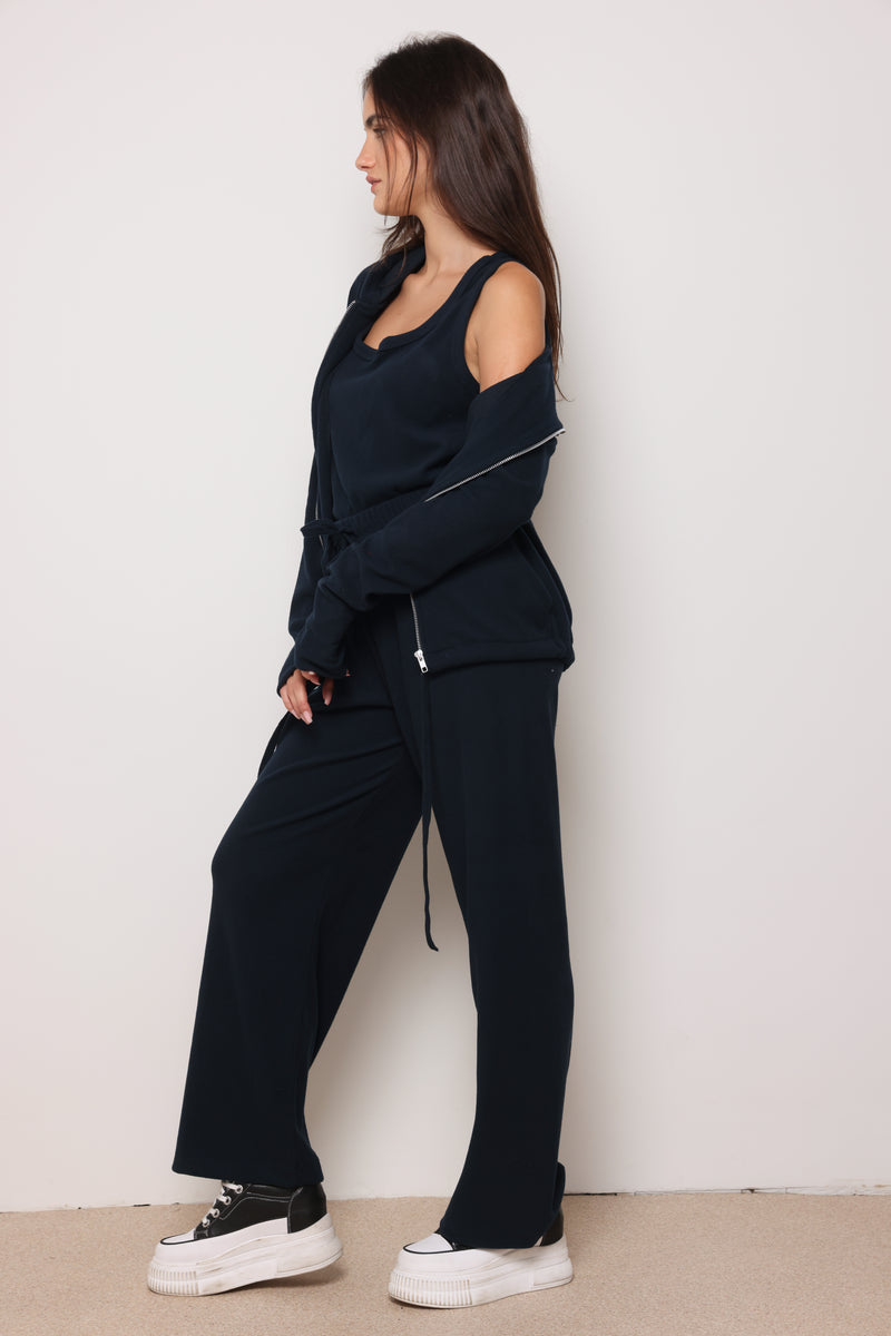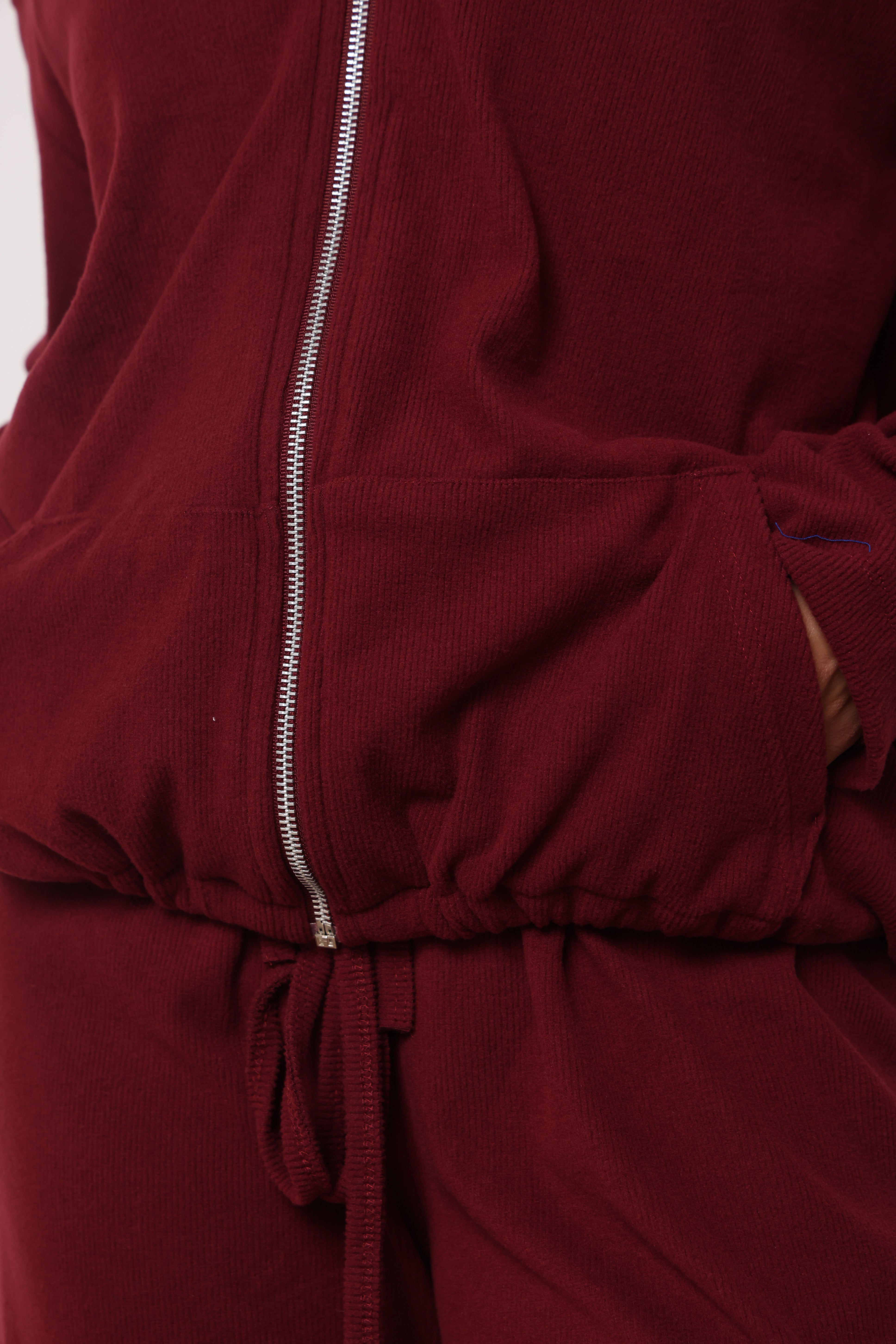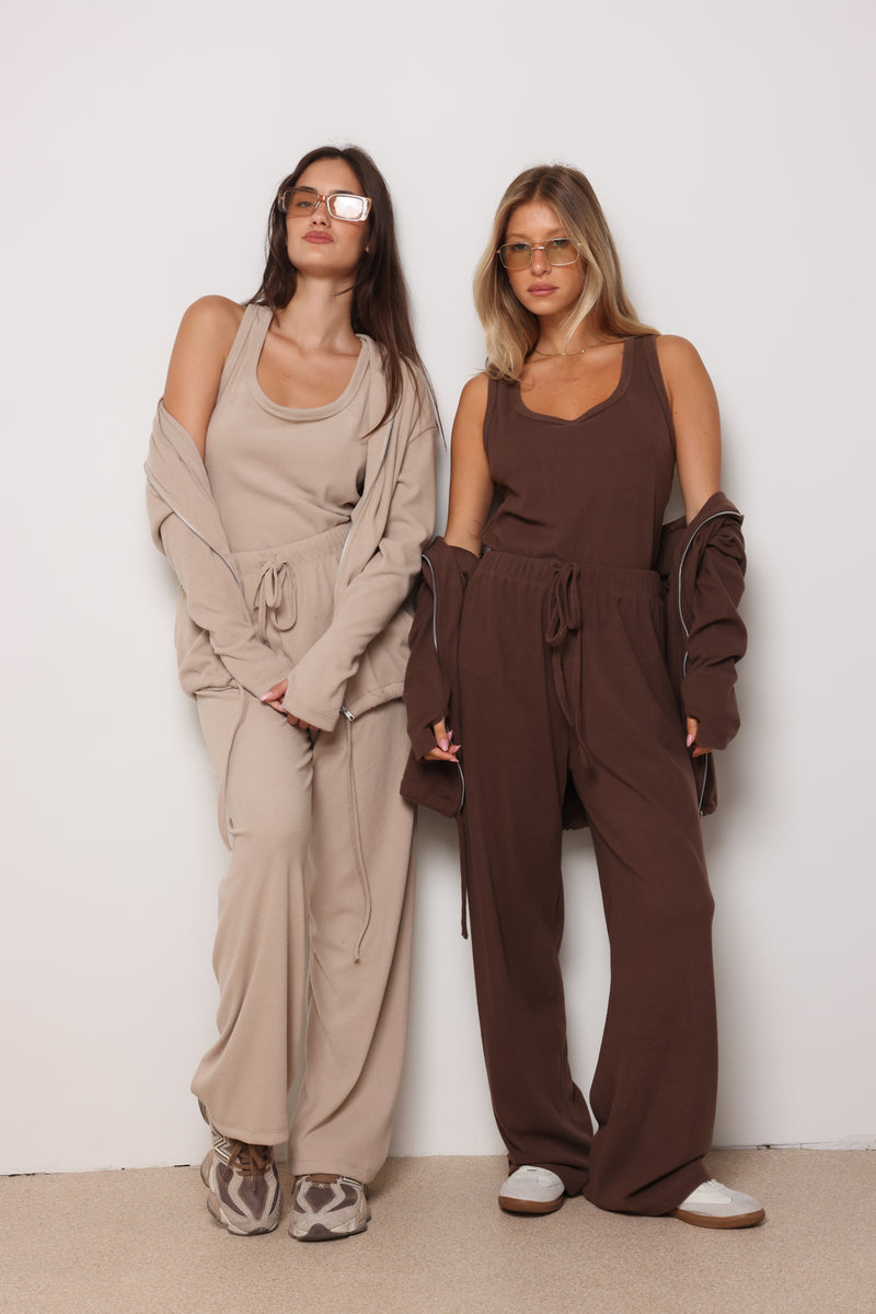 חליפה מבד ריב מגורד כותנה עם לייקרה ,רוכסן בפרונט ,כובע קפוצון ,גופיה תואמת ומכנסיים בגזרה ישרה משוחררת.