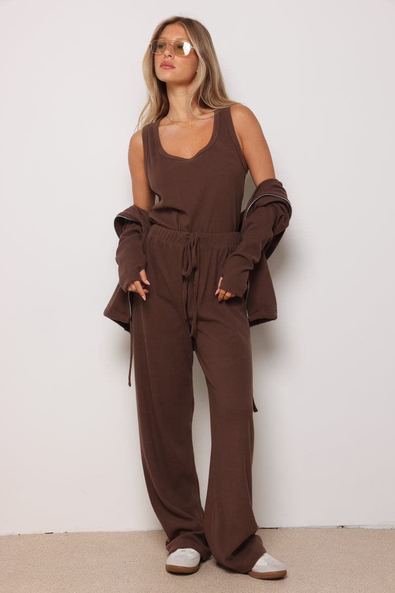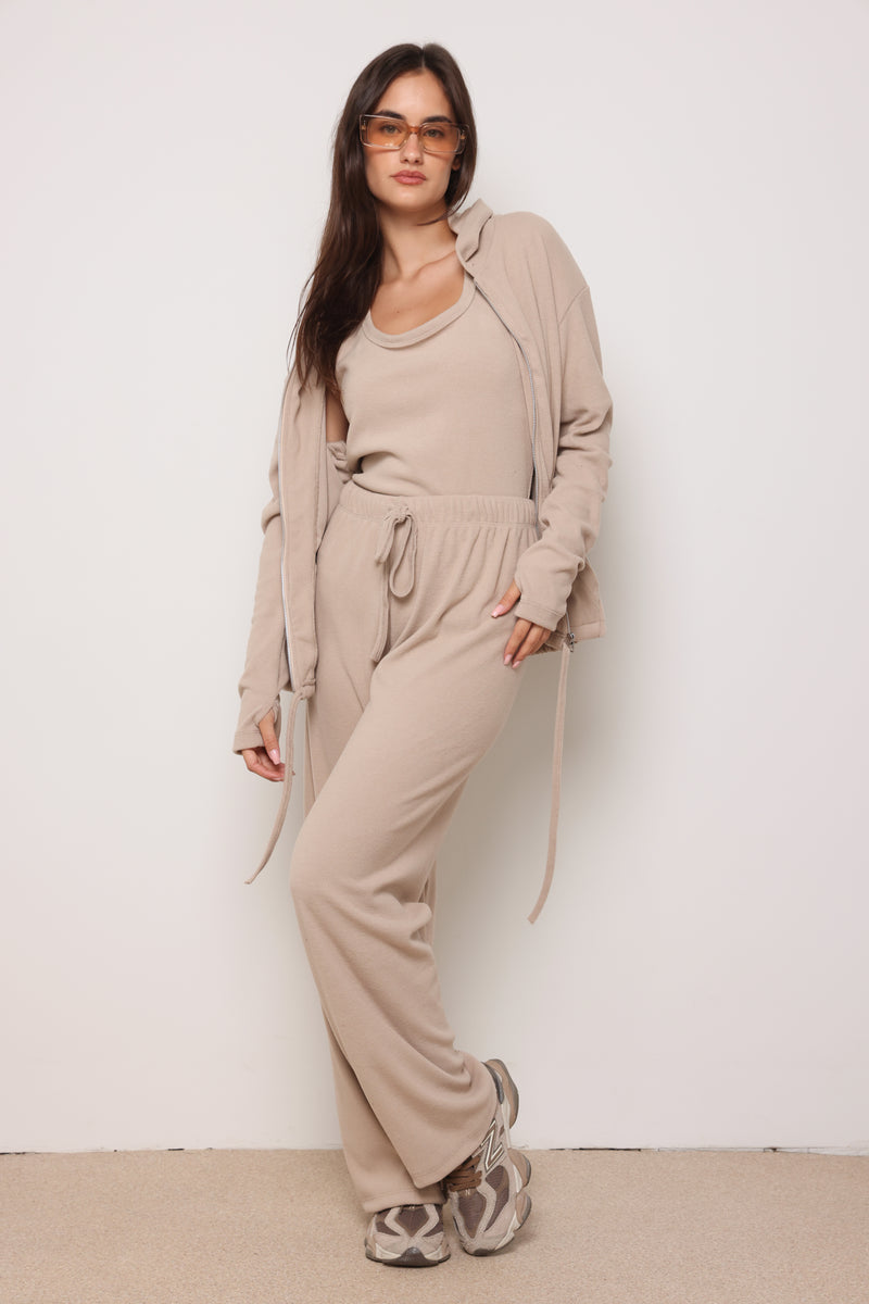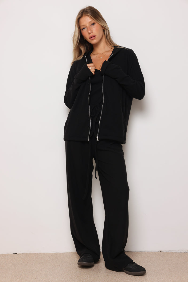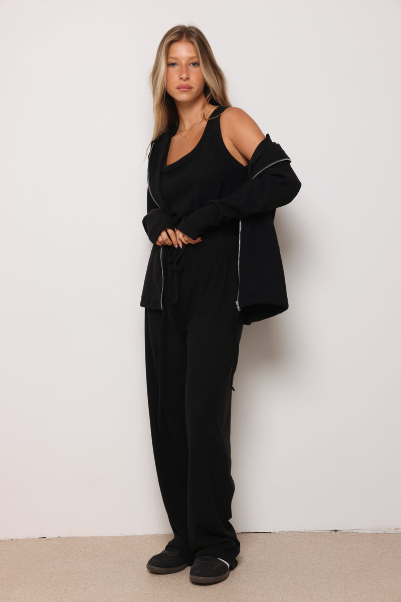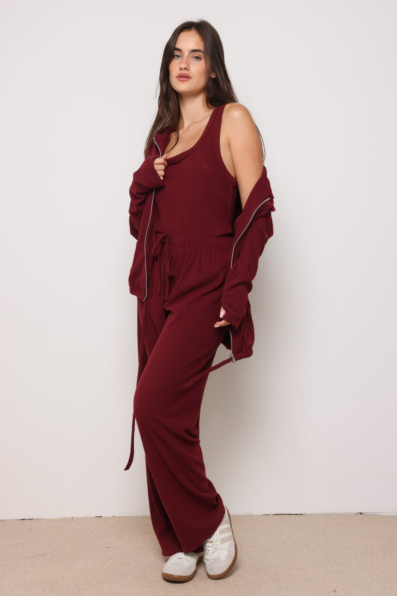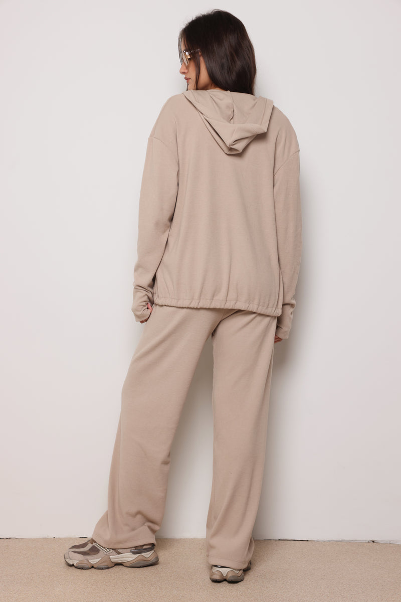 חליפה מבד ריב מגורד כותנה עם לייקרה ,רוכסן בפרונט ,כובע קפוצון ,גופיה תואמת ומכנסיים בגזרה ישרה משוחררת.