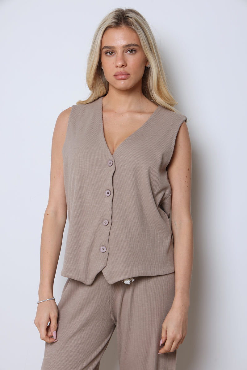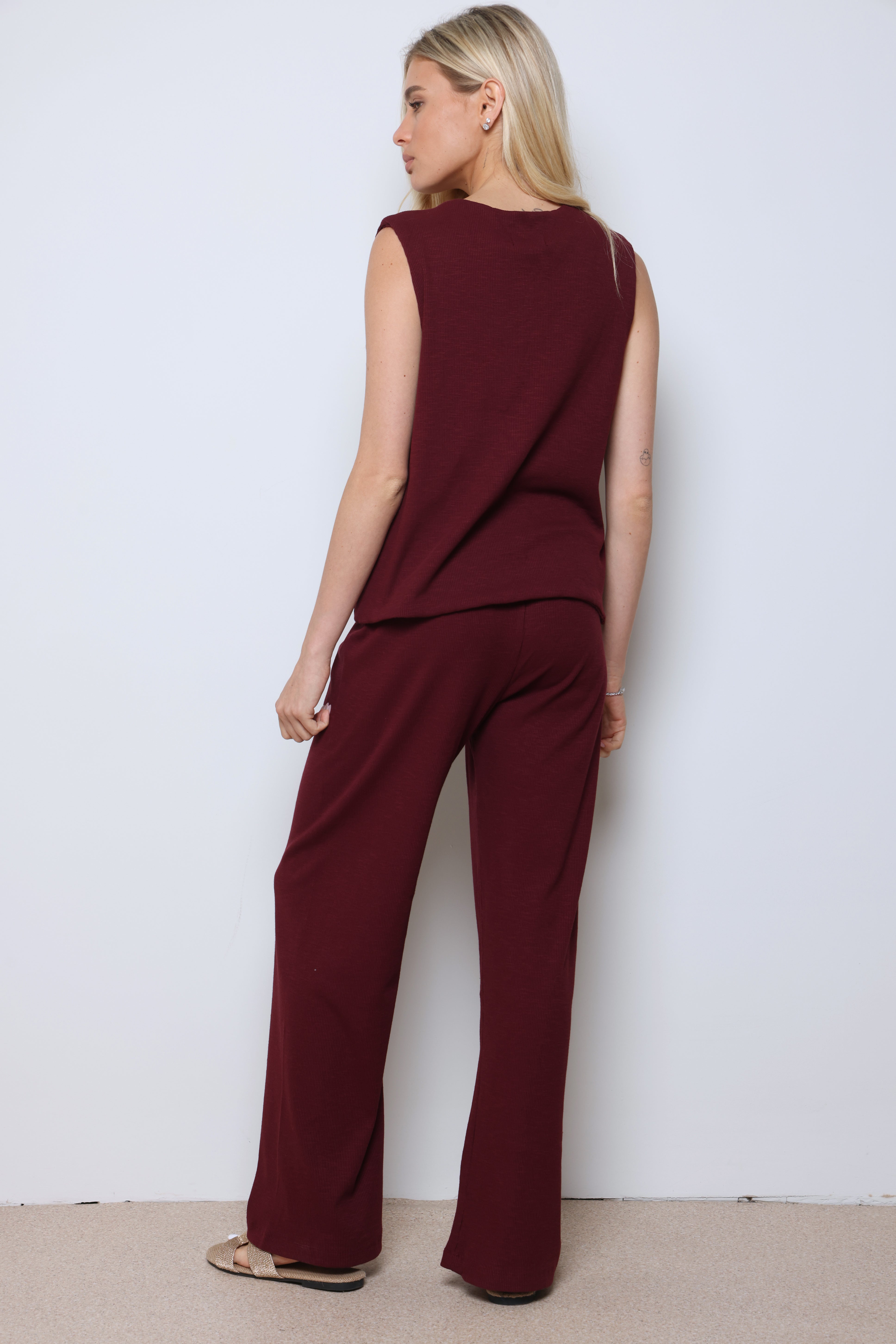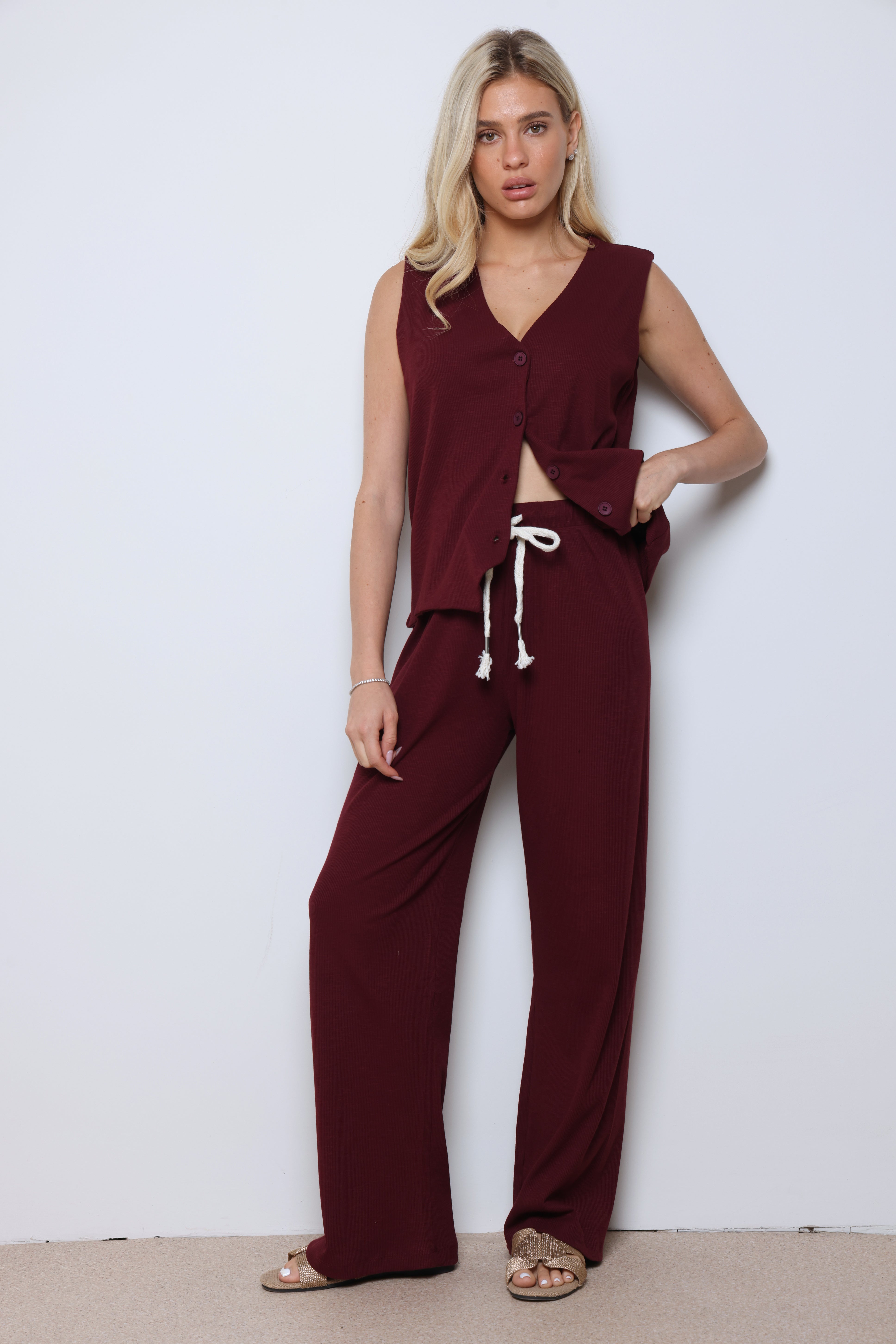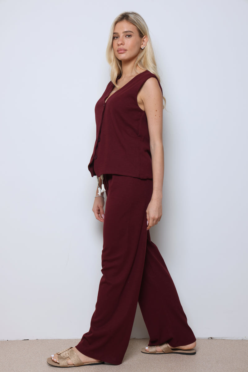 חליפה מבד ריב פלאם עם ווסט מכופתר ומכנסיים מתרחבים.