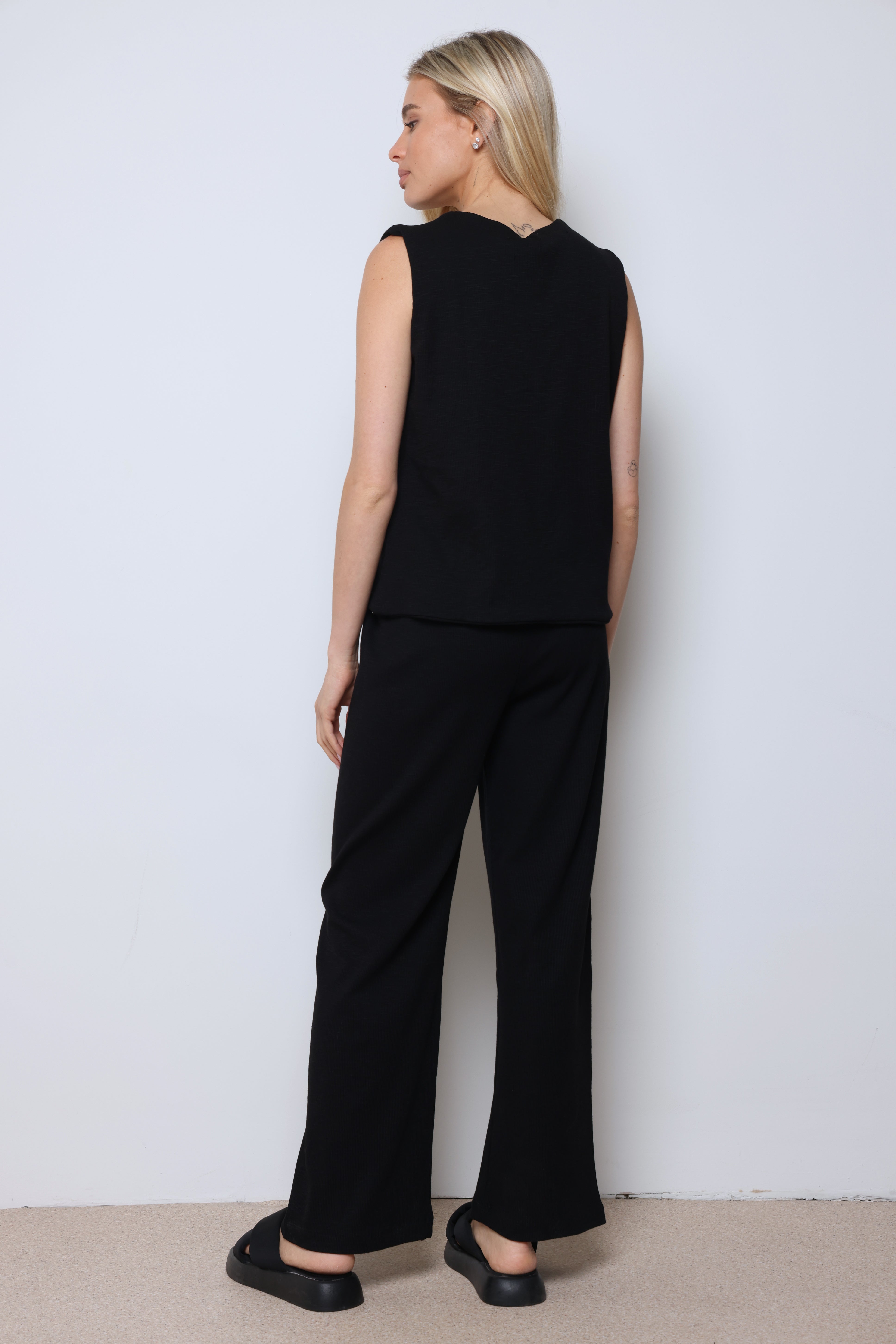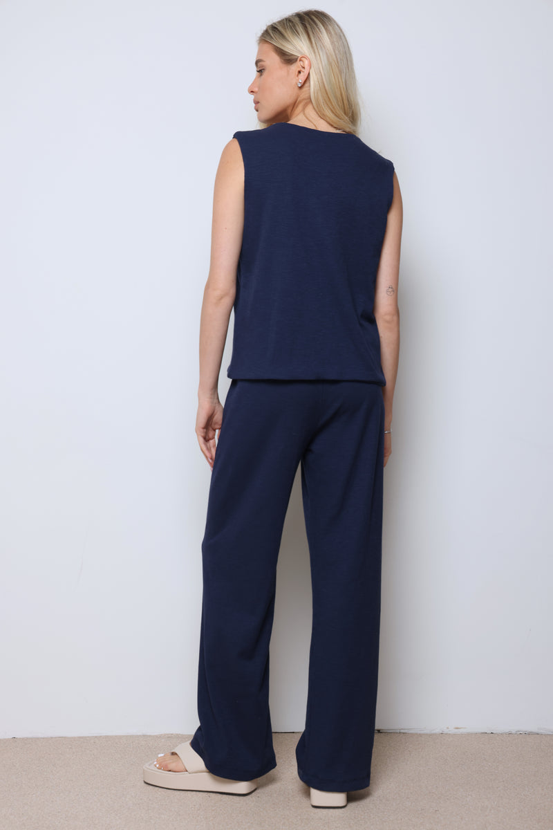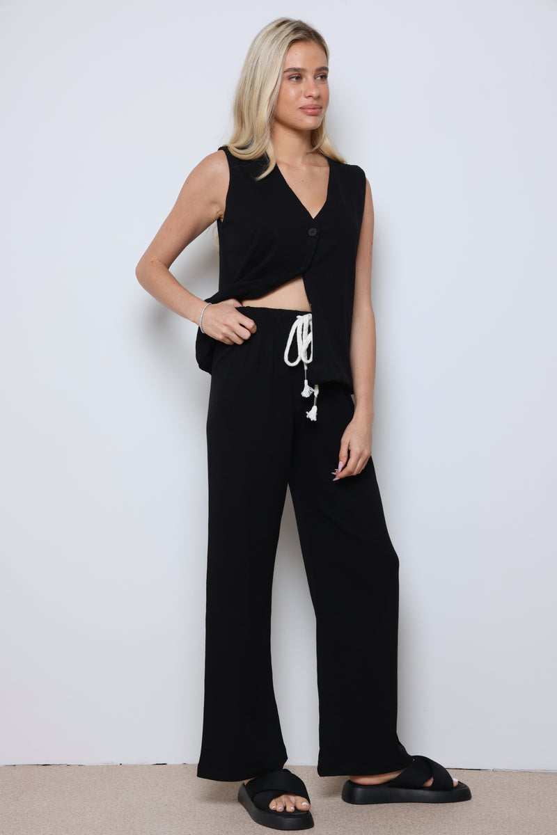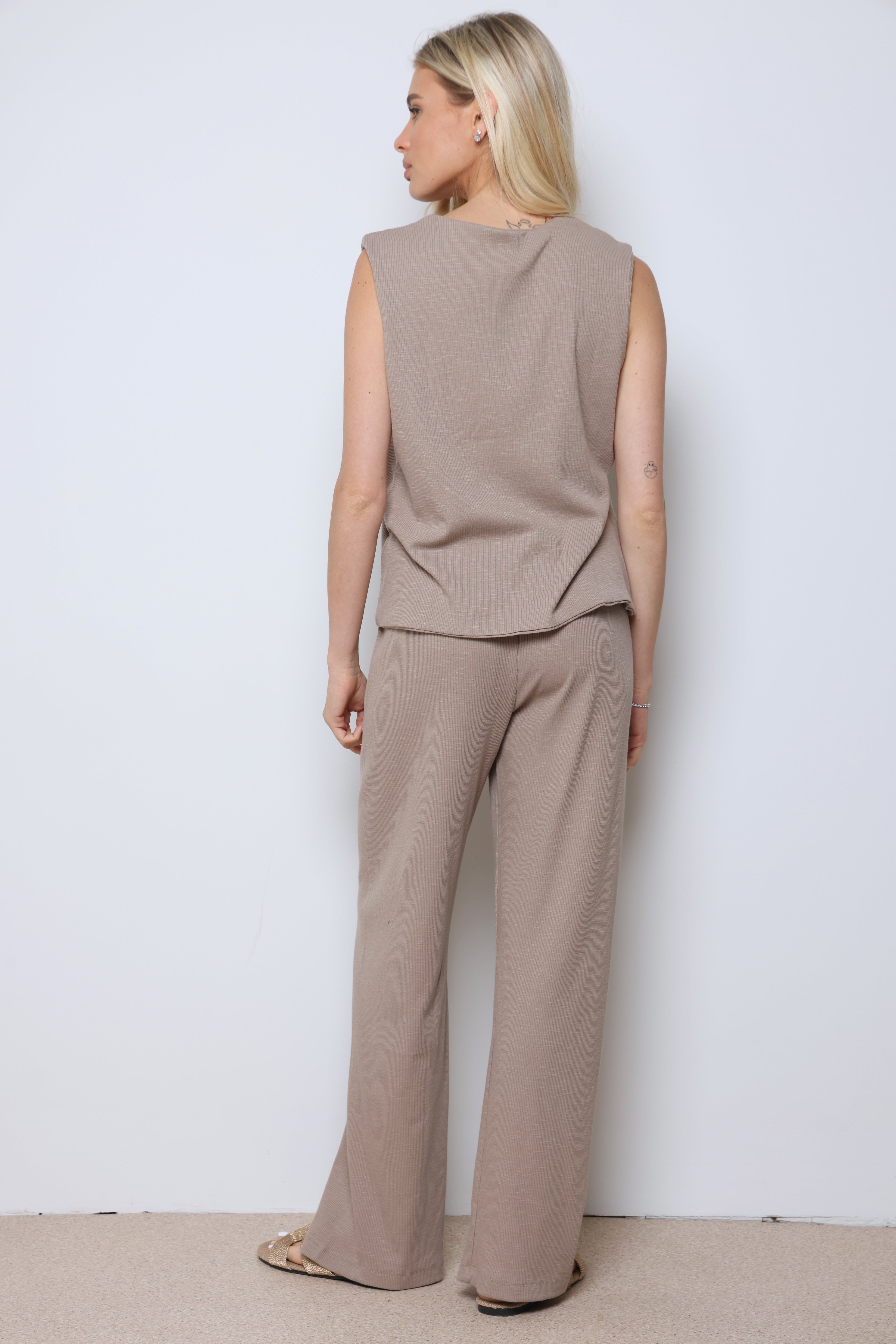 חליפה מבד ריב פלאם עם ווסט מכופתר ומכנסיים מתרחבים.