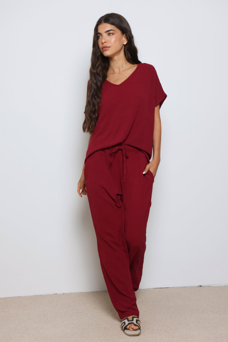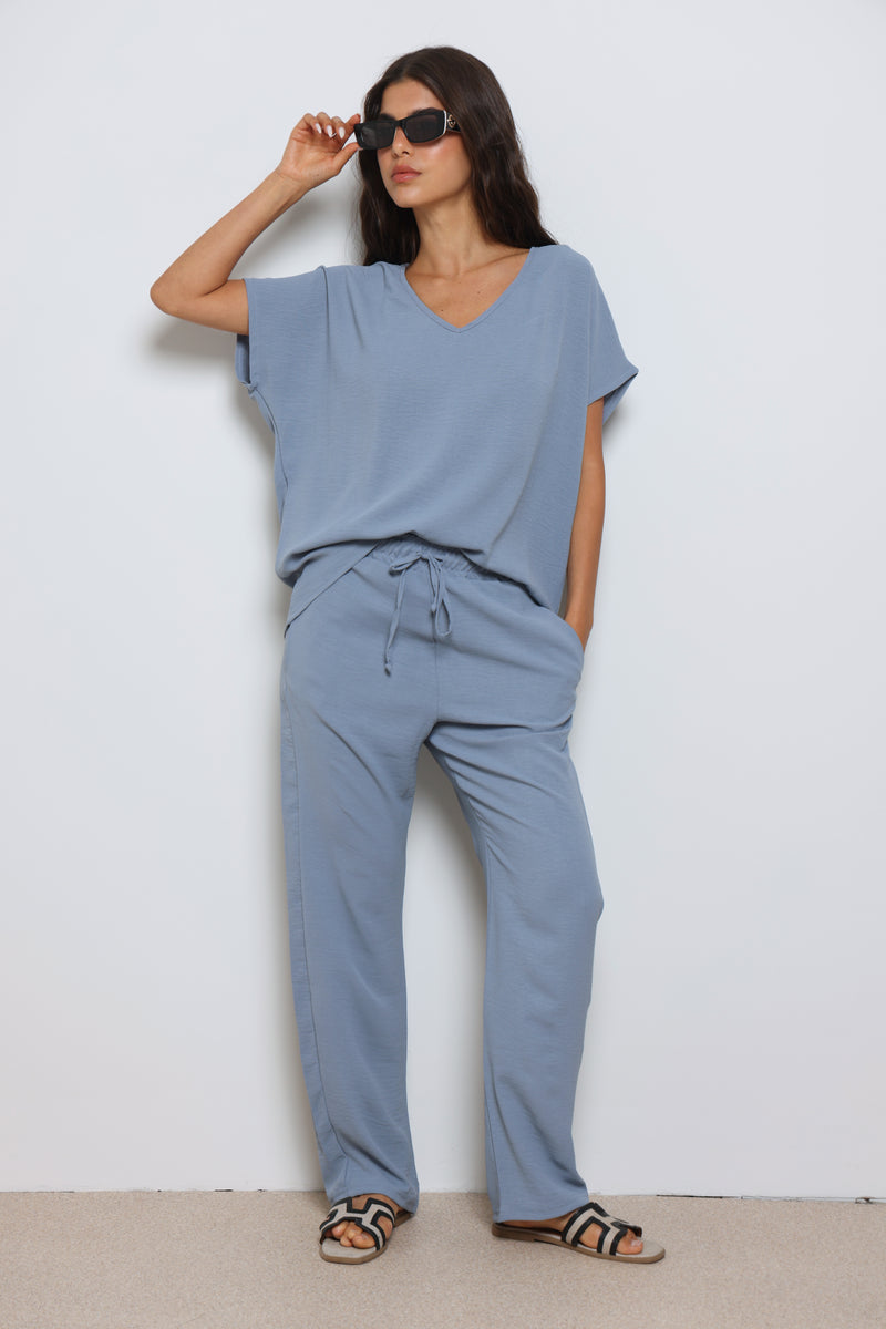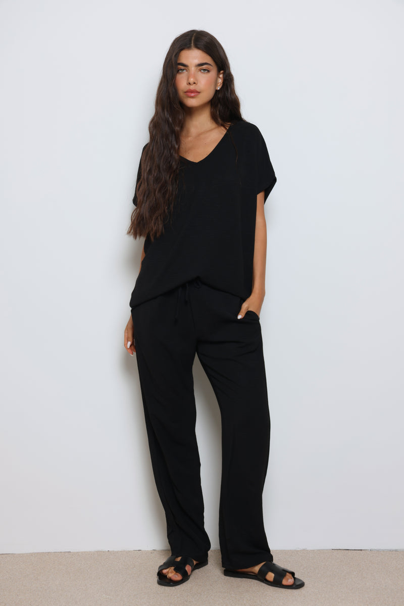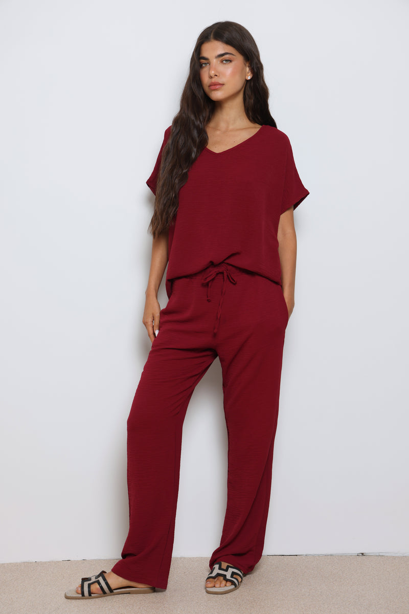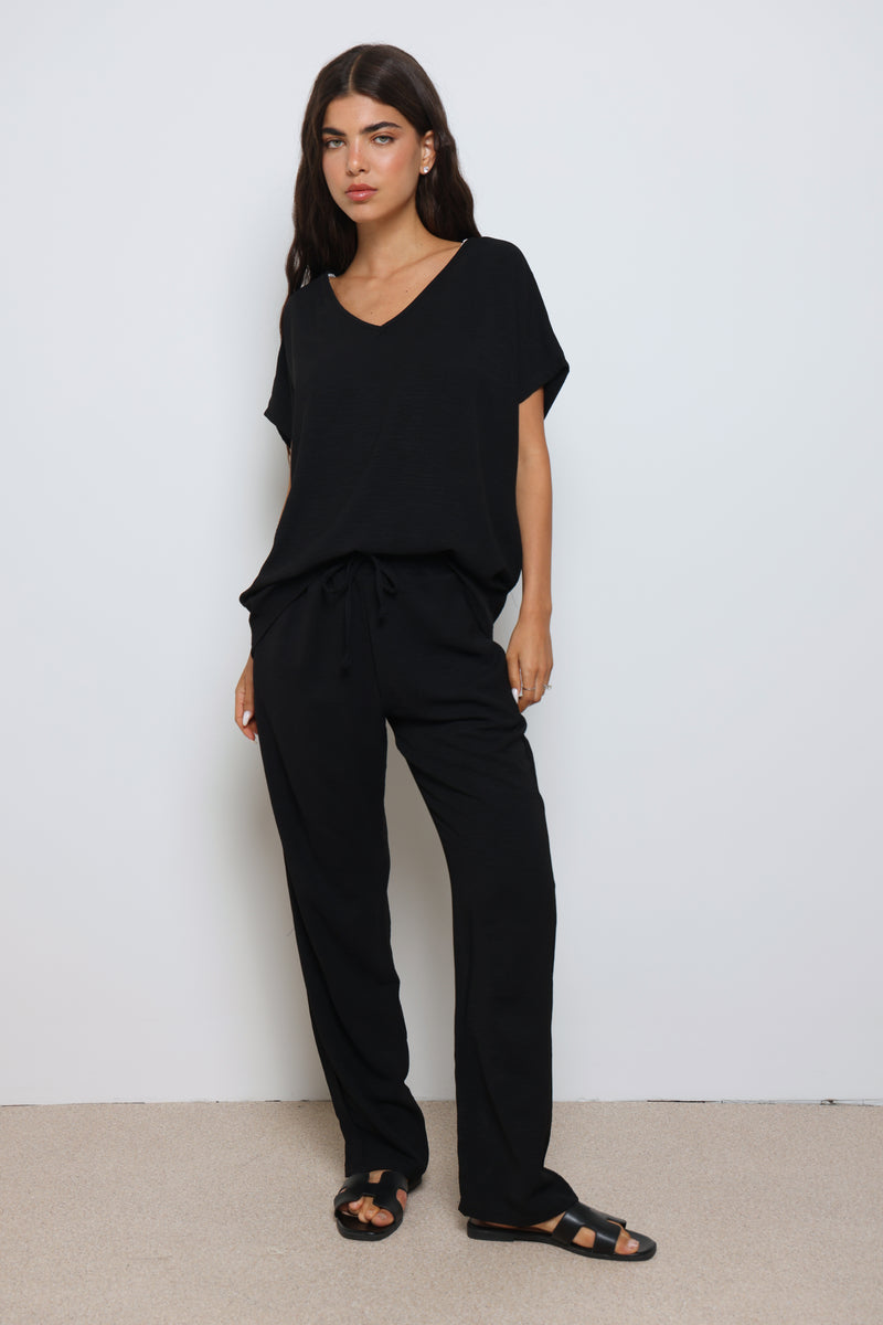 חליפה אלגנטית קלילה מבד קרפ המורכבת מחולצת וי עם שרוולים קצרים ומכנסיים בגזרה ישרה עם גומי במותן ושרוך קשירה.