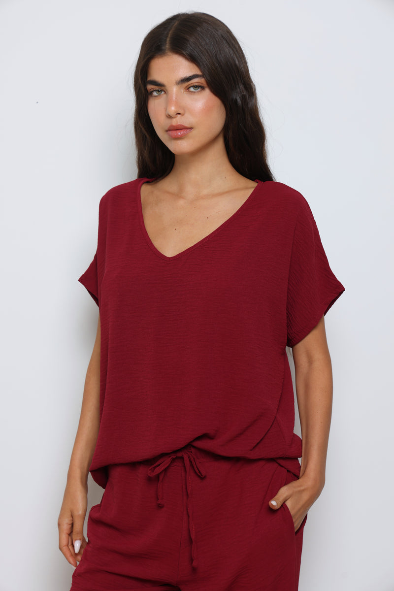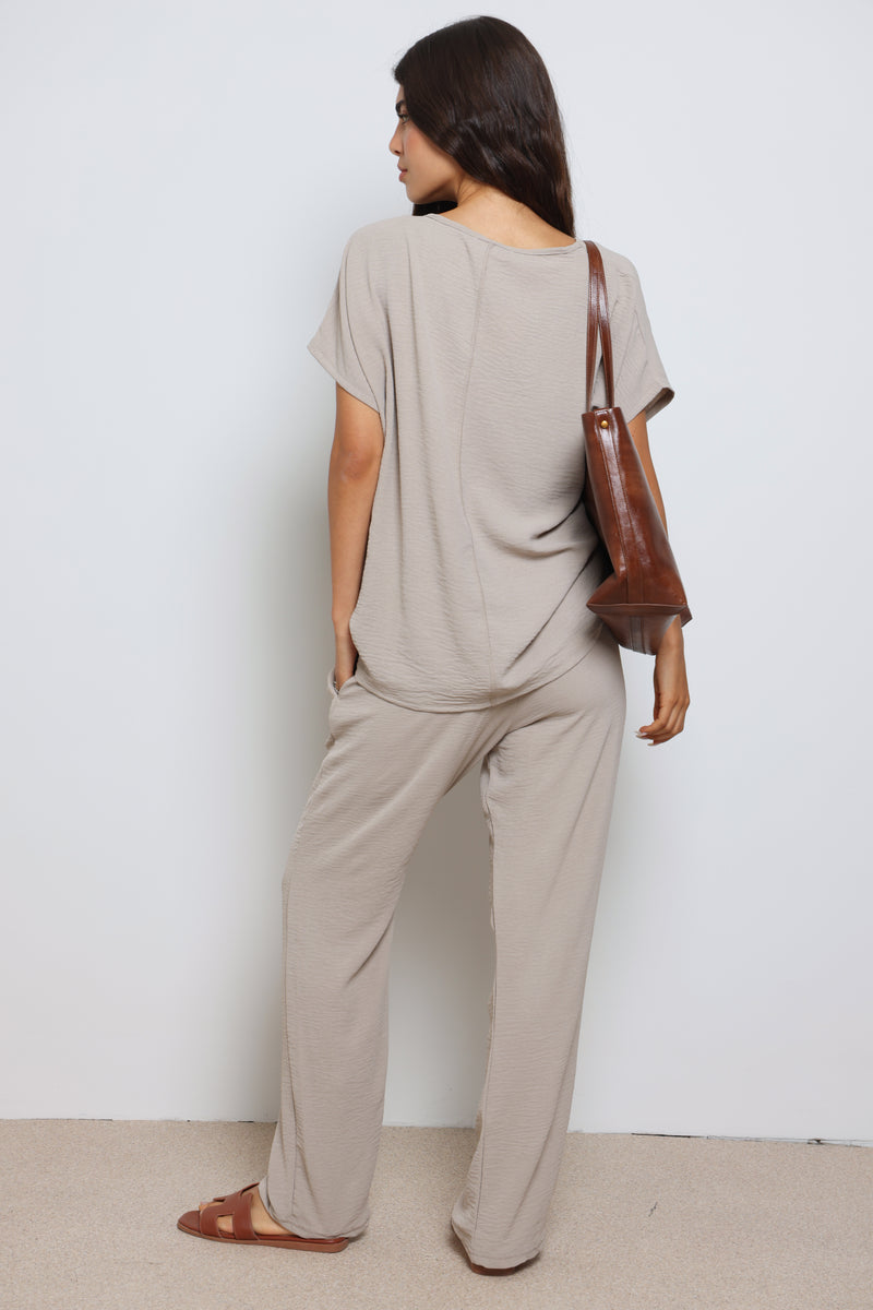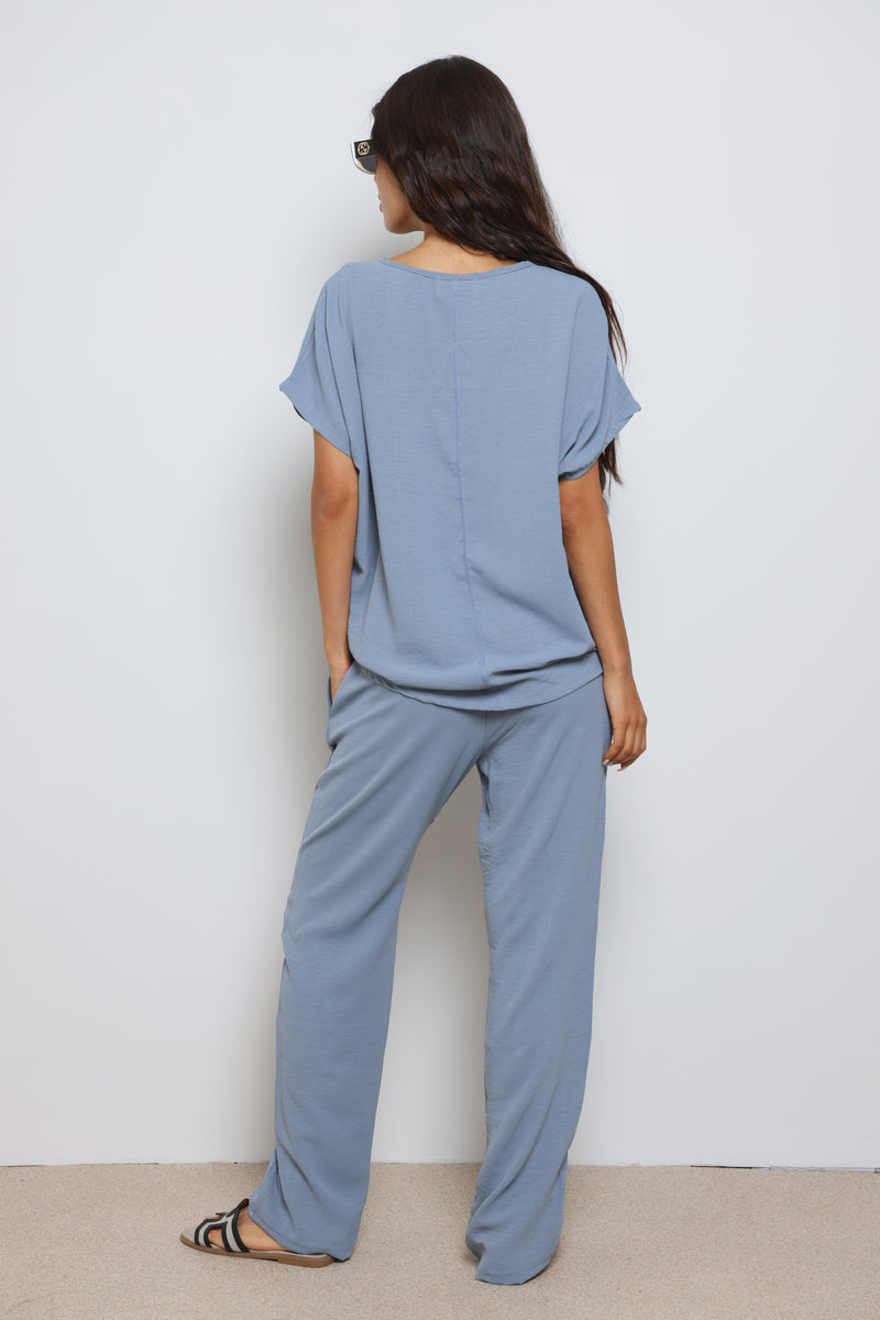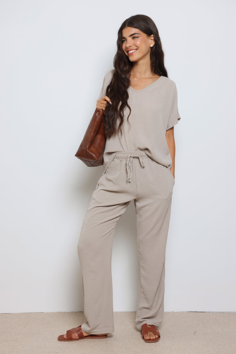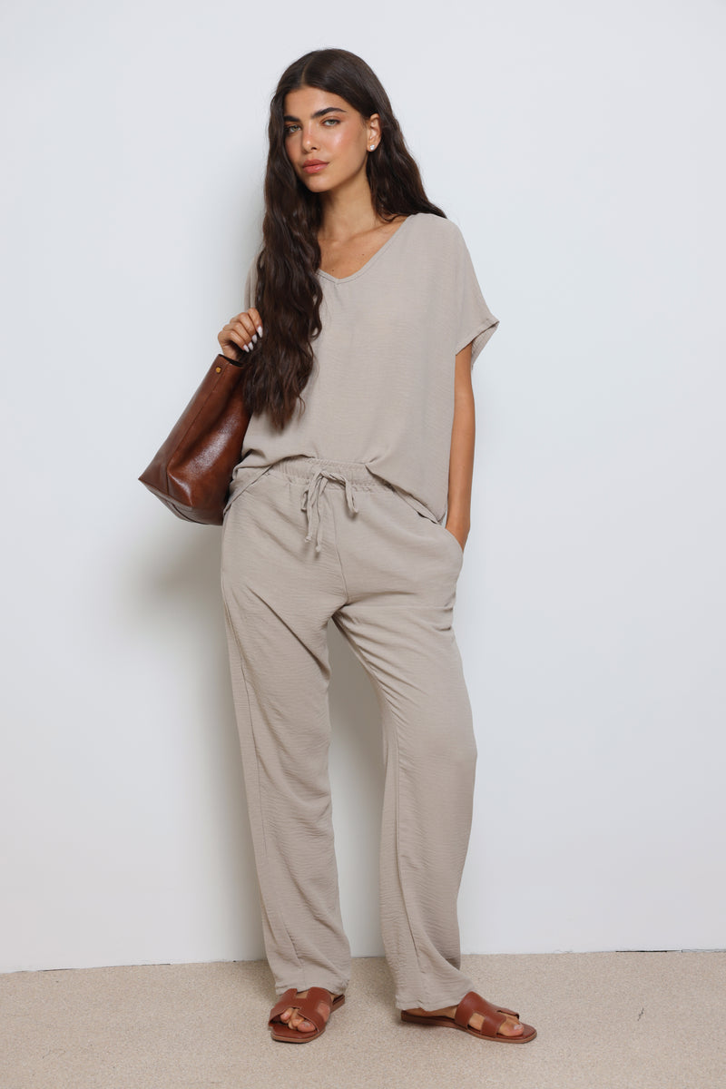 חליפה אלגנטית קלילה מבד קרפ המורכבת מחולצת וי עם שרוולים קצרים ומכנסיים בגזרה ישרה עם גומי במותן ושרוך קשירה.