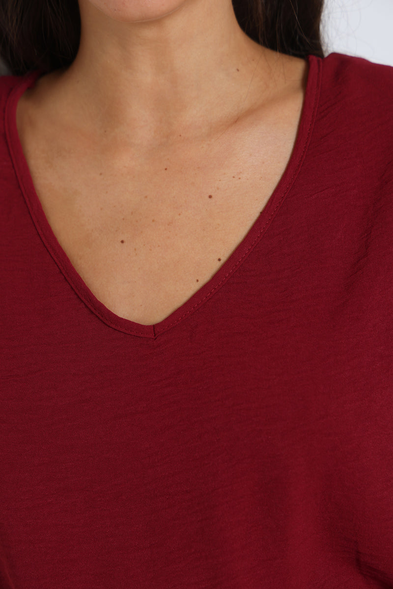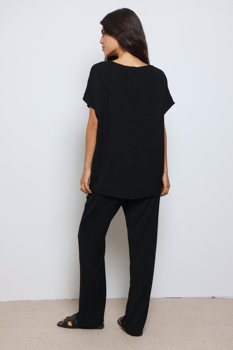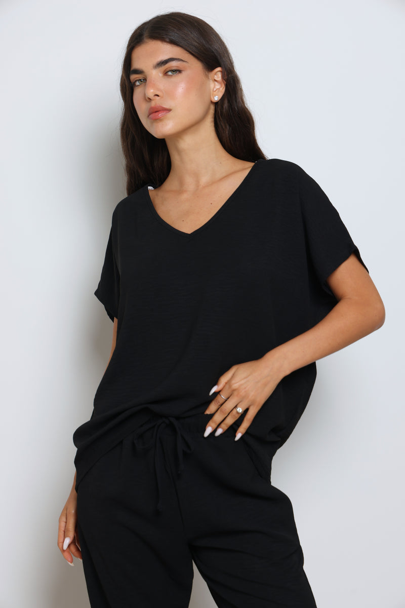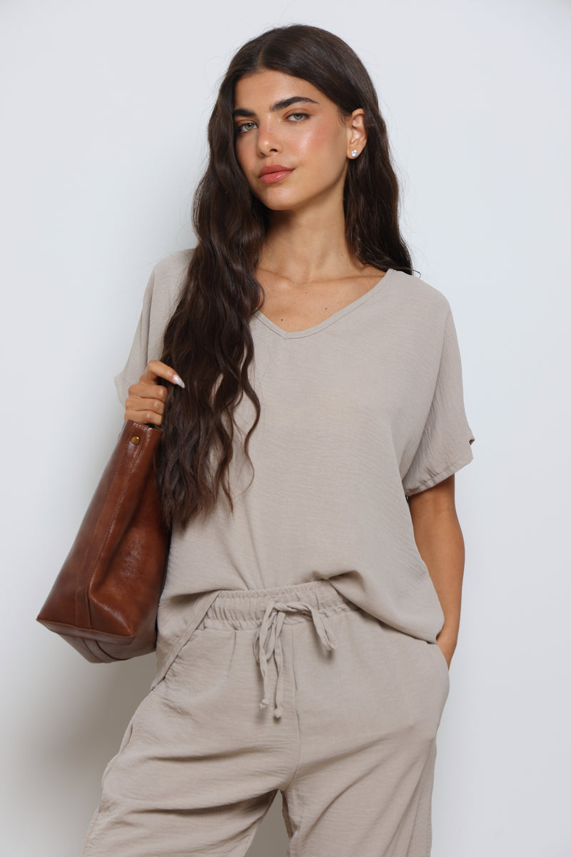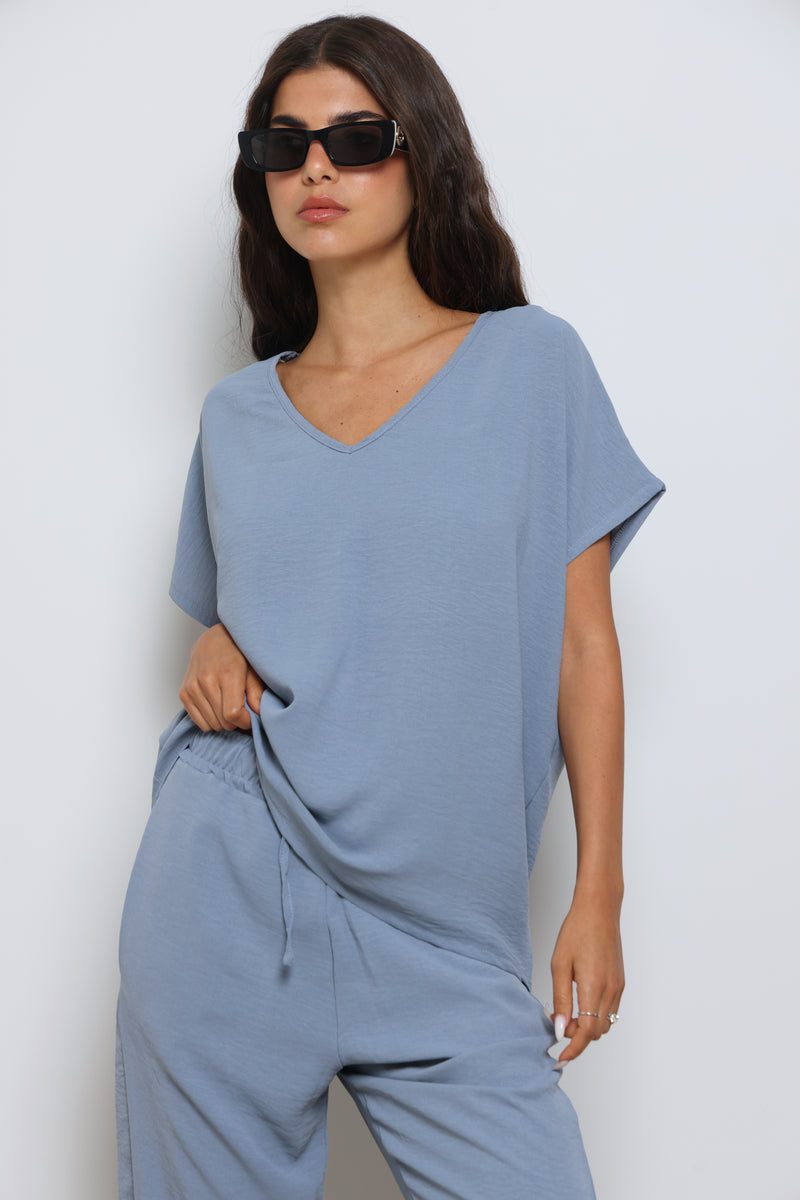 חליפה אלגנטית קלילה מבד קרפ המורכבת מחולצת וי עם שרוולים קצרים ומכנסיים בגזרה ישרה עם גומי במותן ושרוך קשירה.